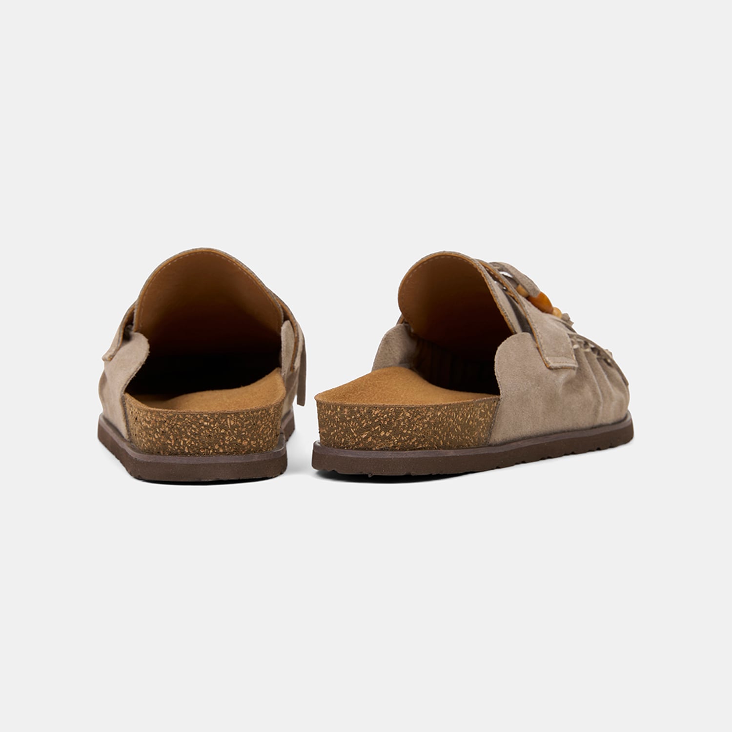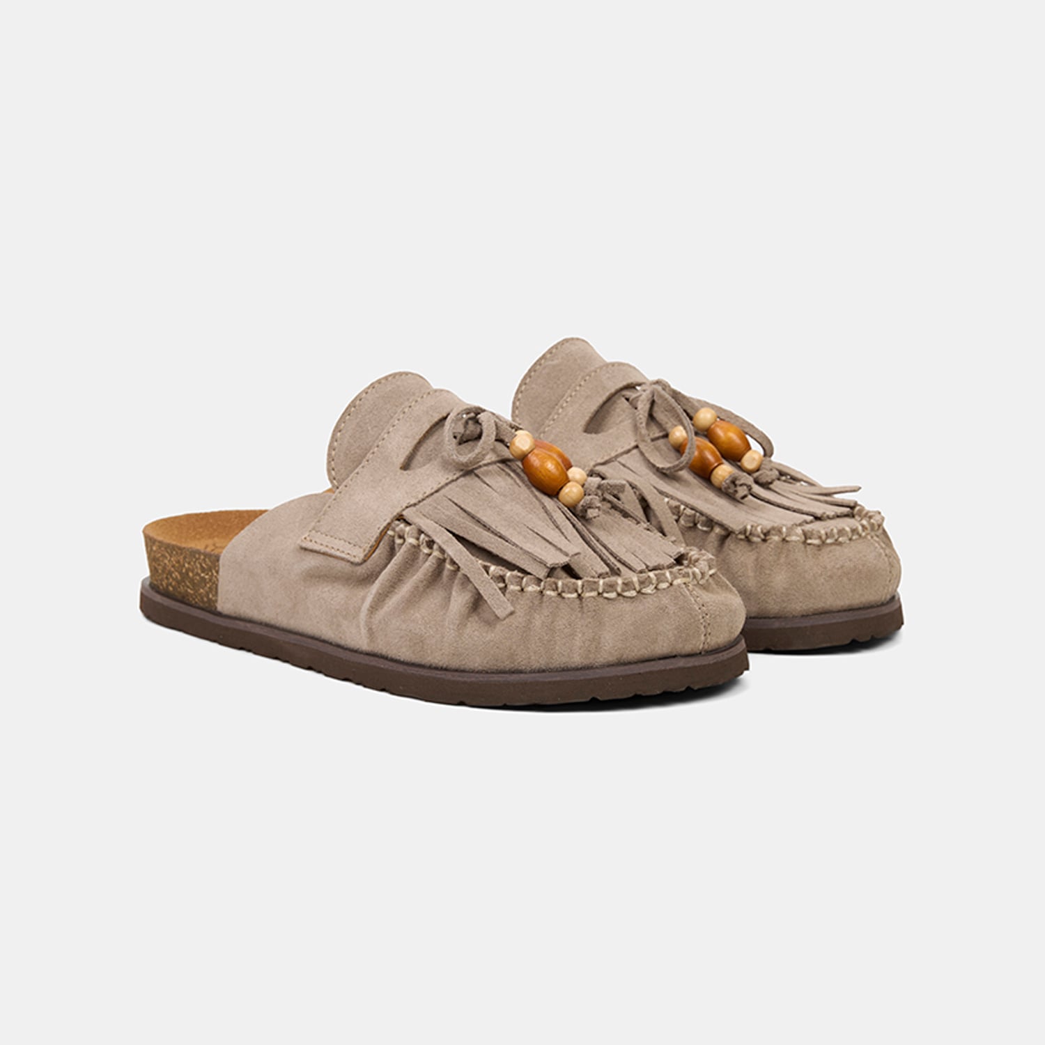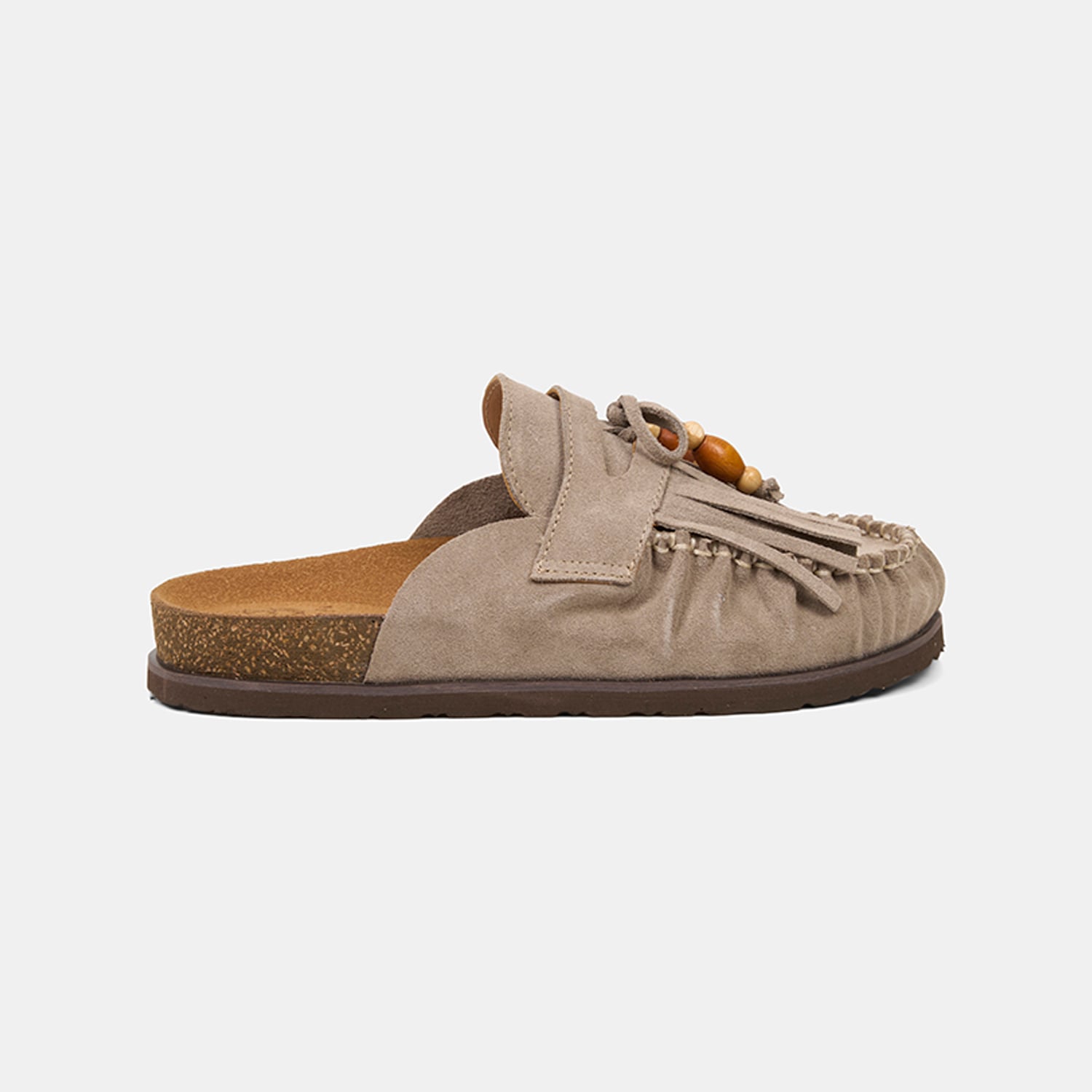 Kadın sabo terlik, süet deri yüzeyi ve püskül-boncuk detaylarıyla günlük stile özgün ve dikkat çekici bir karakter kazandıran rahat bir modeldir.