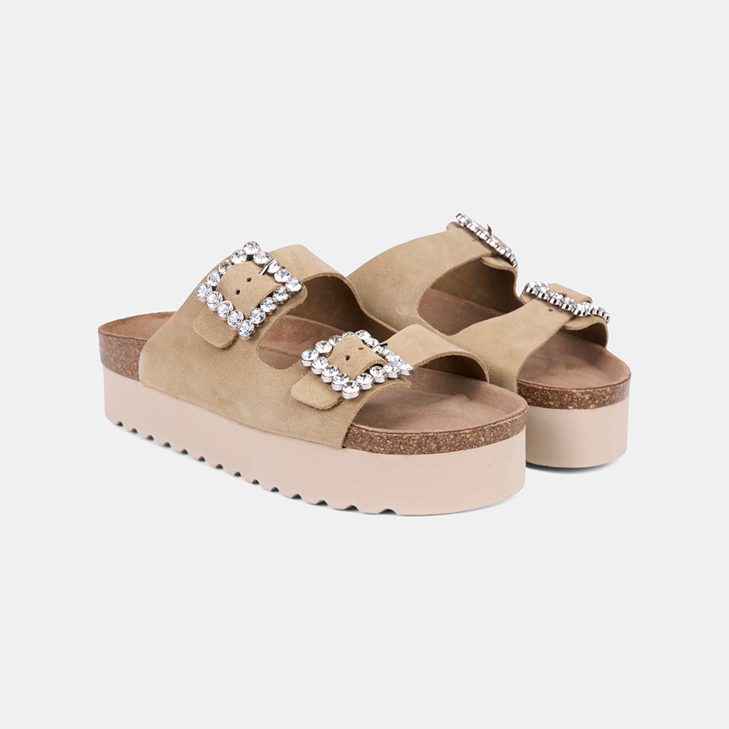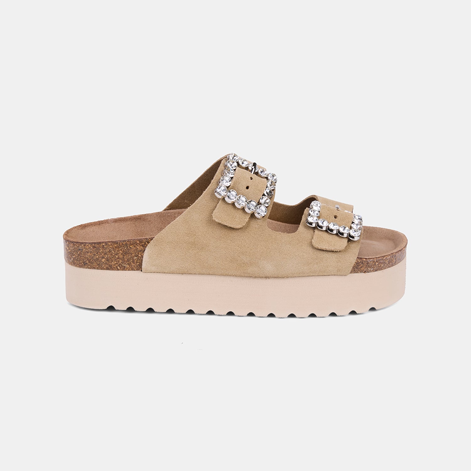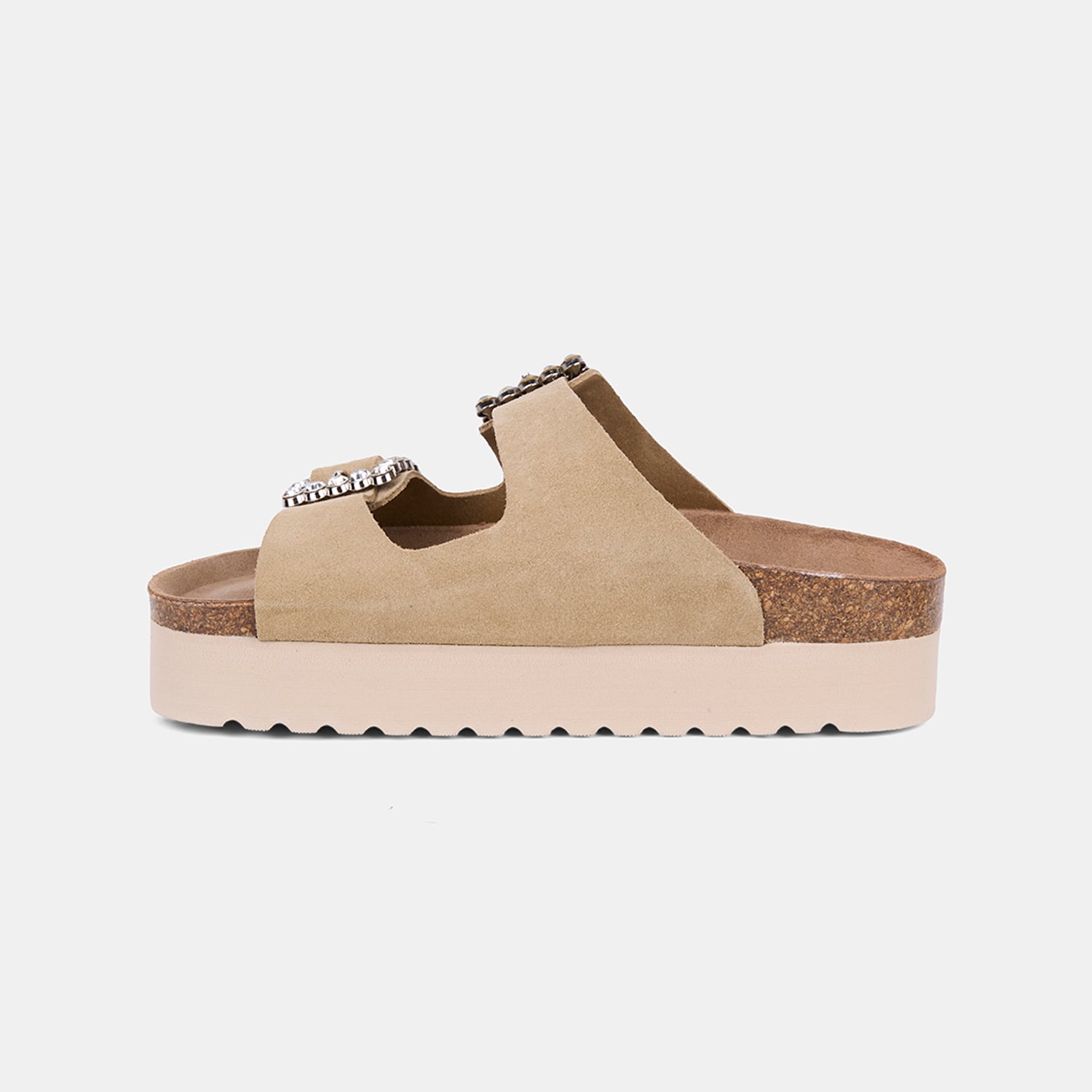 Kadın Bej Taşlı Toka Aksesuarlı Platform Topuklu Süet Terlik