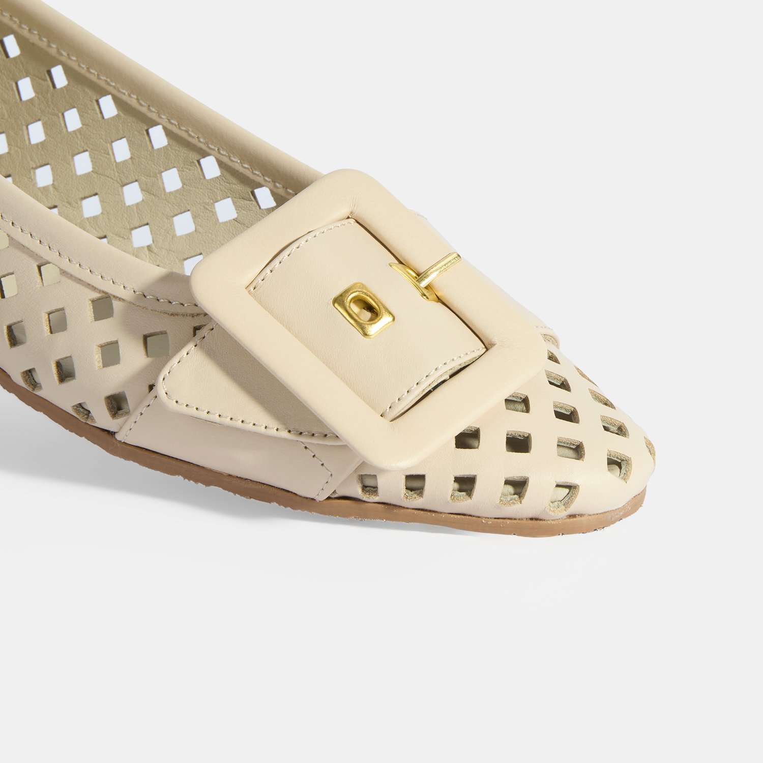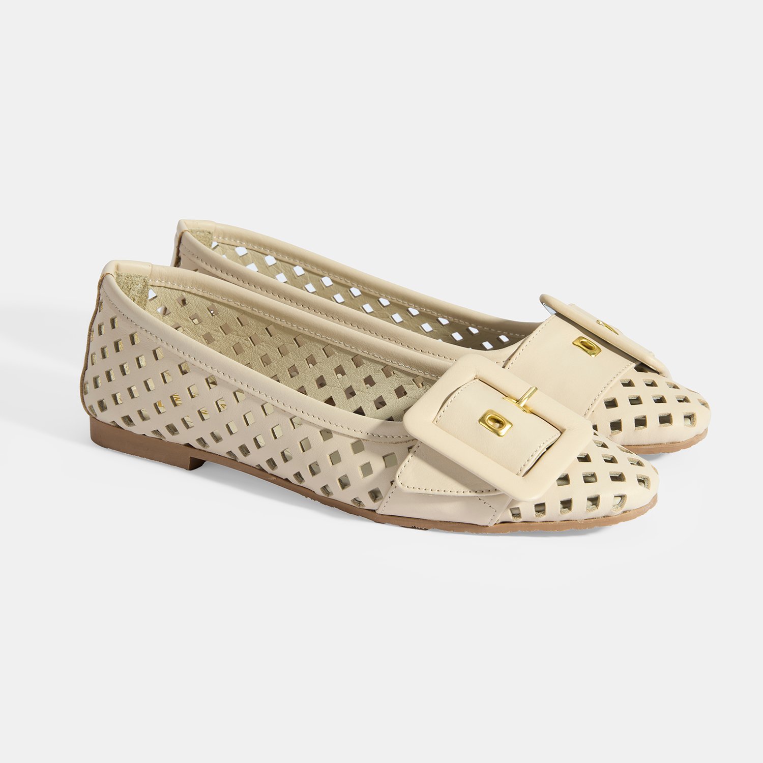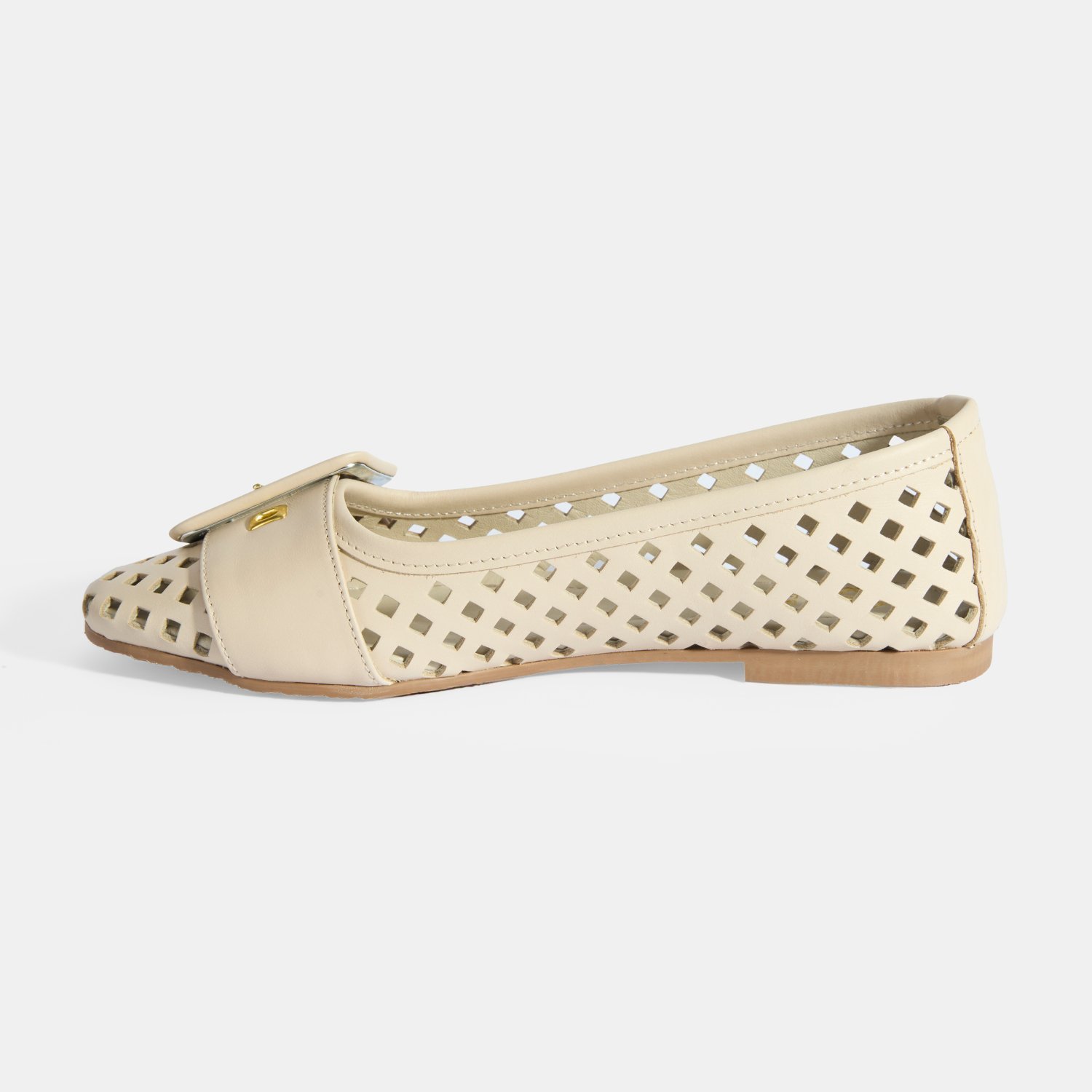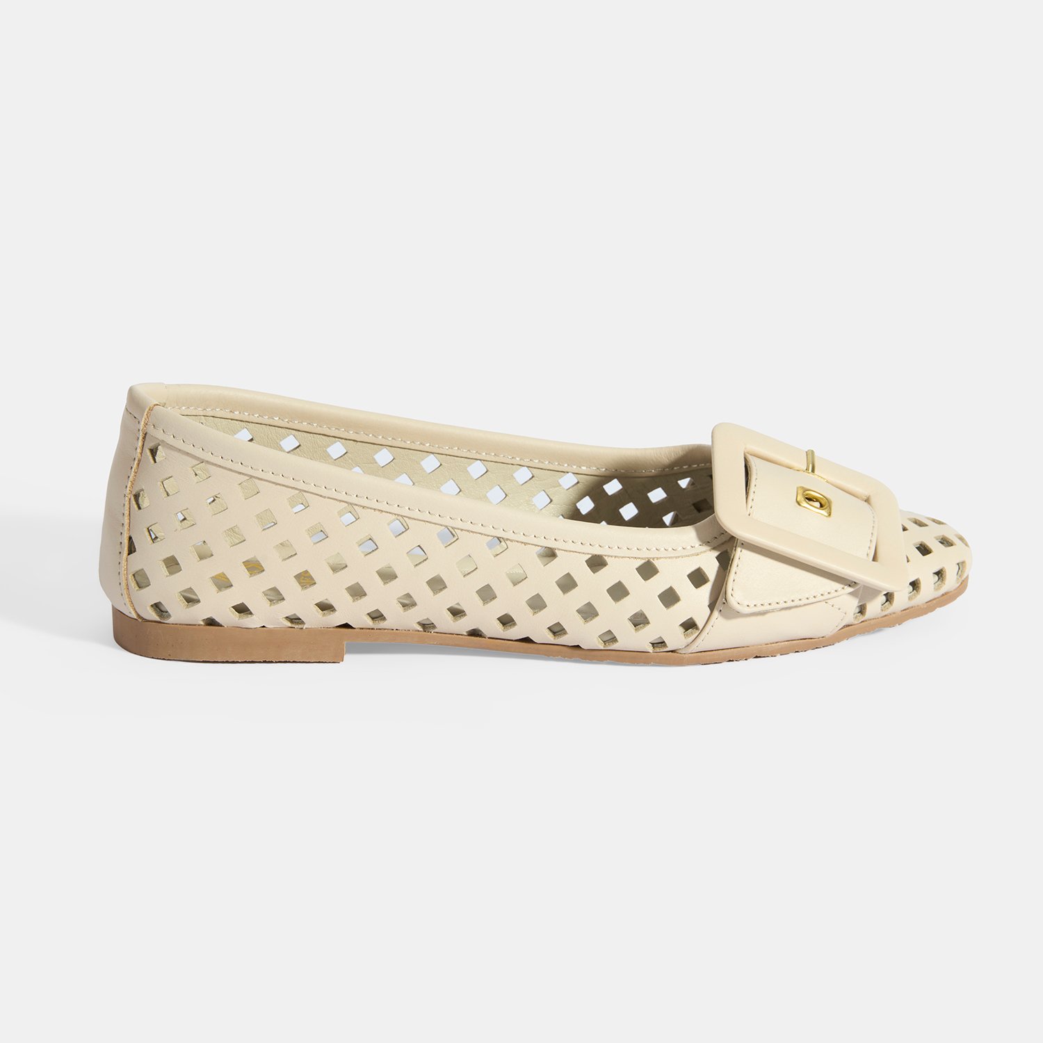 Kadın Bej Toka Aksesuarlı Perforeli Deri Babet