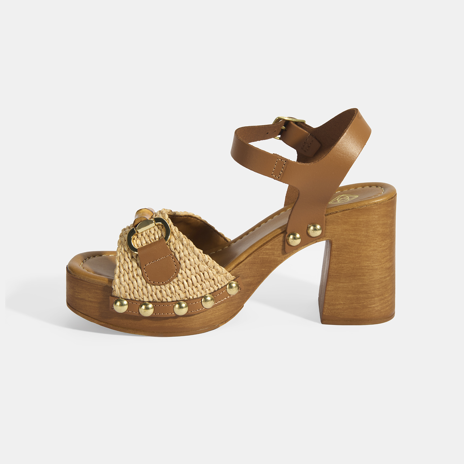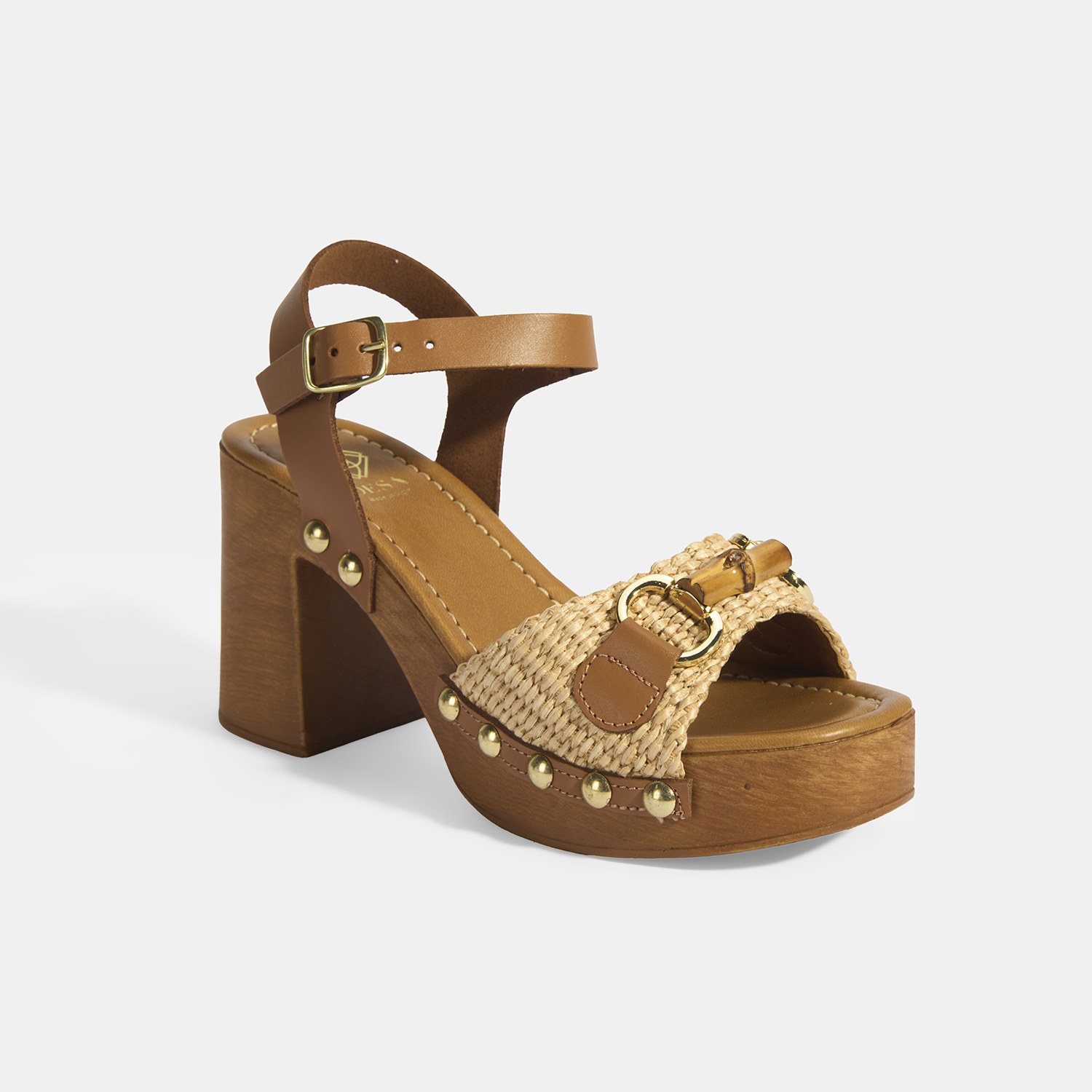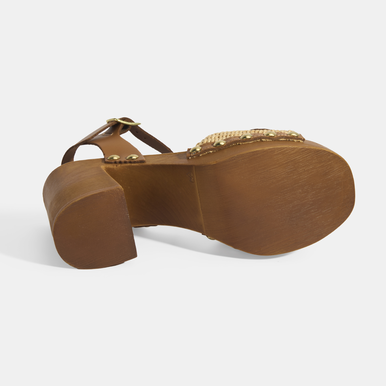 %60 deri, %40 rafya malzemeden üretilmiştir, deri astarlı, pu iç tabanlı, pu tabanlı, ayarlanabilir metal tokalı, kemik aksesuar toka deatylı, kadın topuklu sandalet.