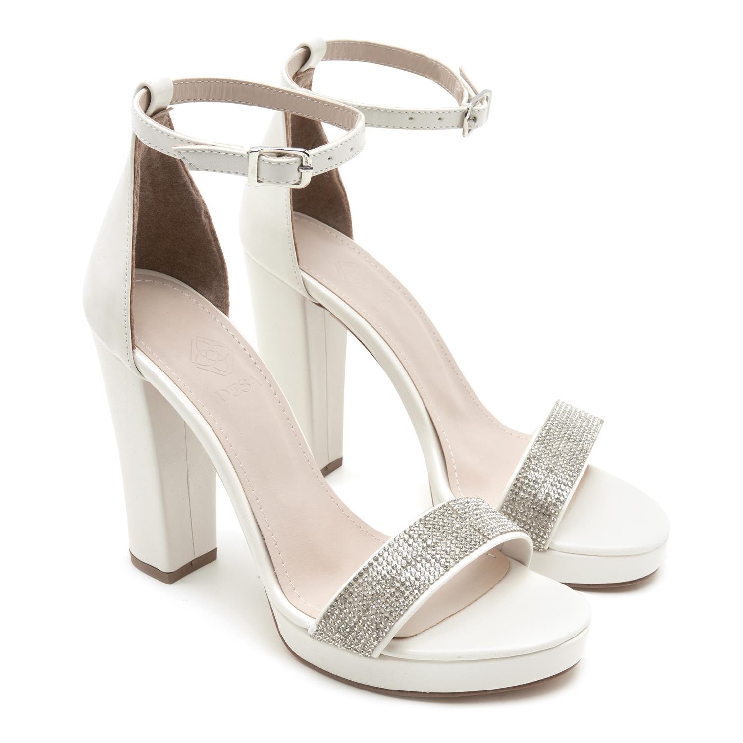 Tek bant detaylı, ayarlanabilir metal tokalı, platform tabanlı, pu metaryelden üretilmiş topuklu sandalet.