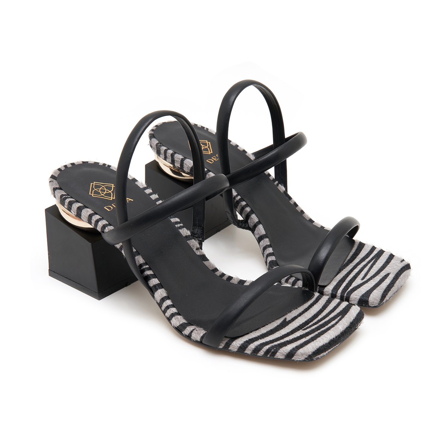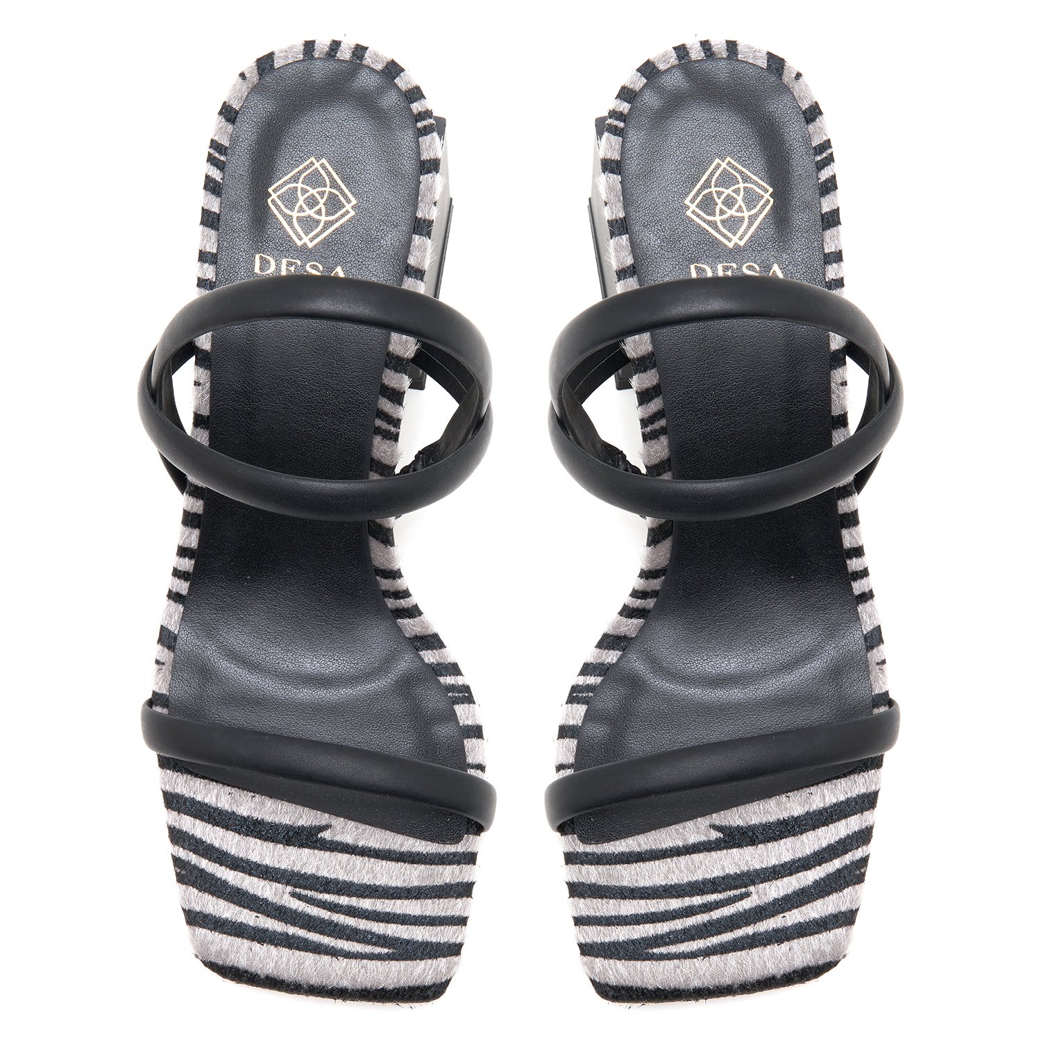 Çoklu renk kombinasyonundan oluşan , zebra desenli taban detaylı,özel tasarım kübik ökçeli,neolit tabanlı, pu materyalden üretilmiş kadın sandalet.