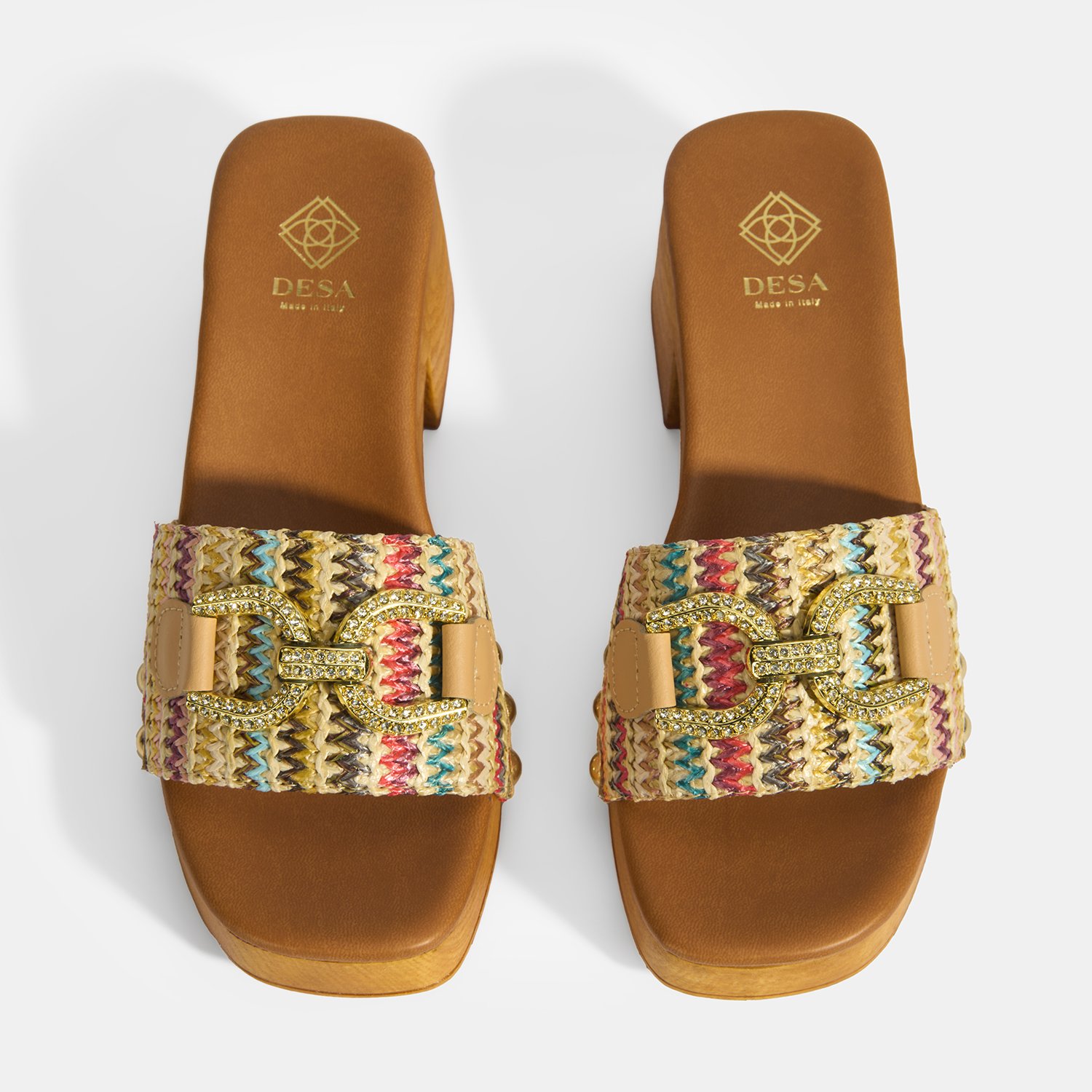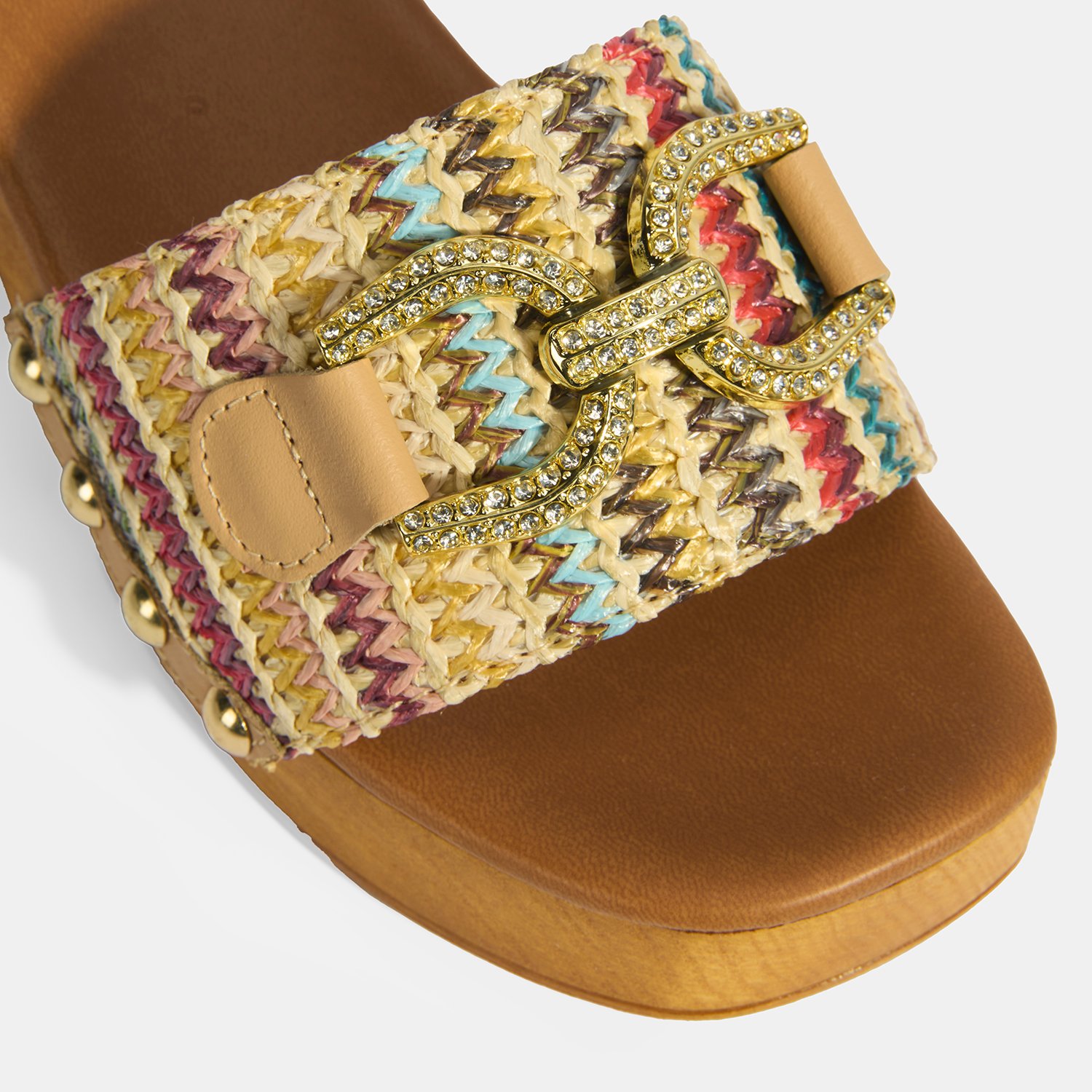 %5 deri, %95 rafya malzemeden üretilmiştir. Pu iç tabanlı, pu astarlı, taşlı metal toka aksesuar detaylı, pu tabanlı, kadın terlik.