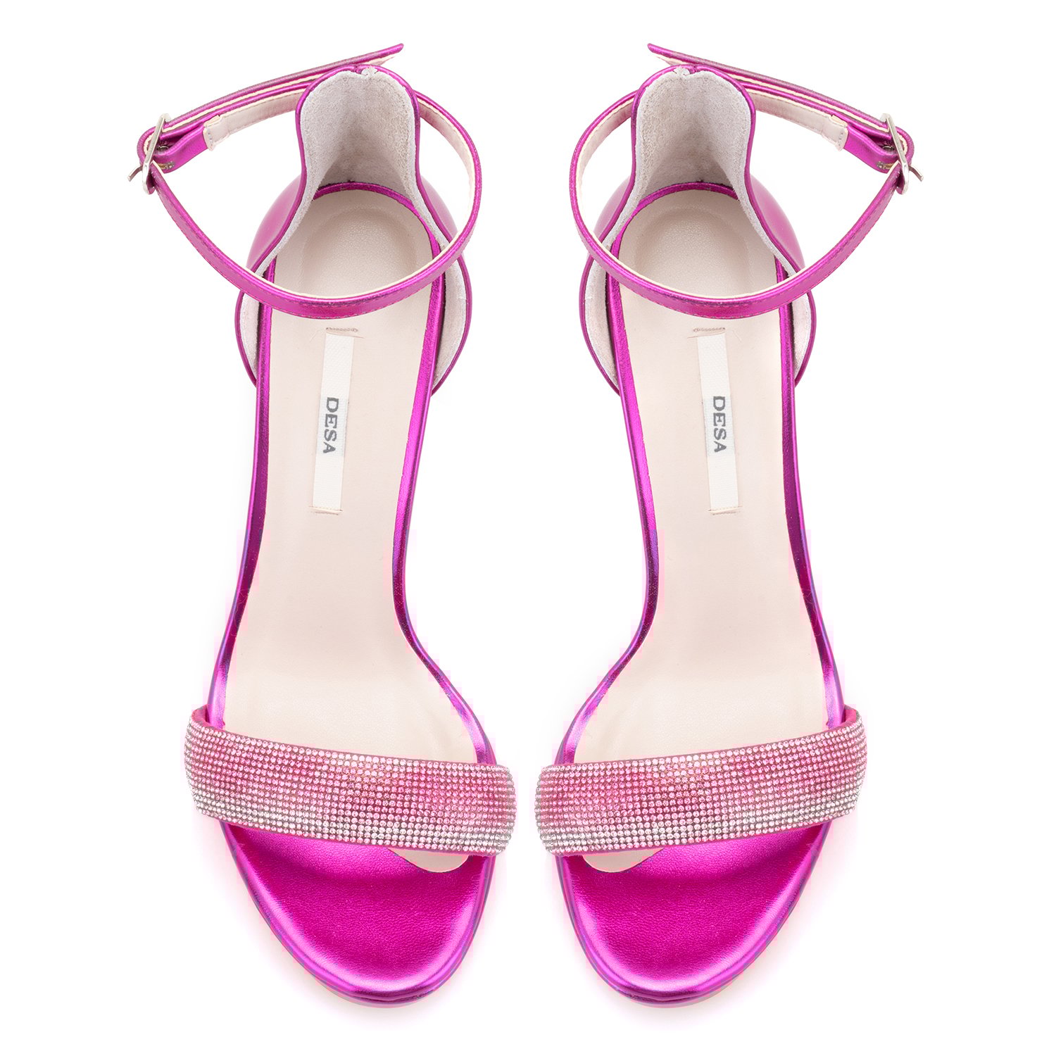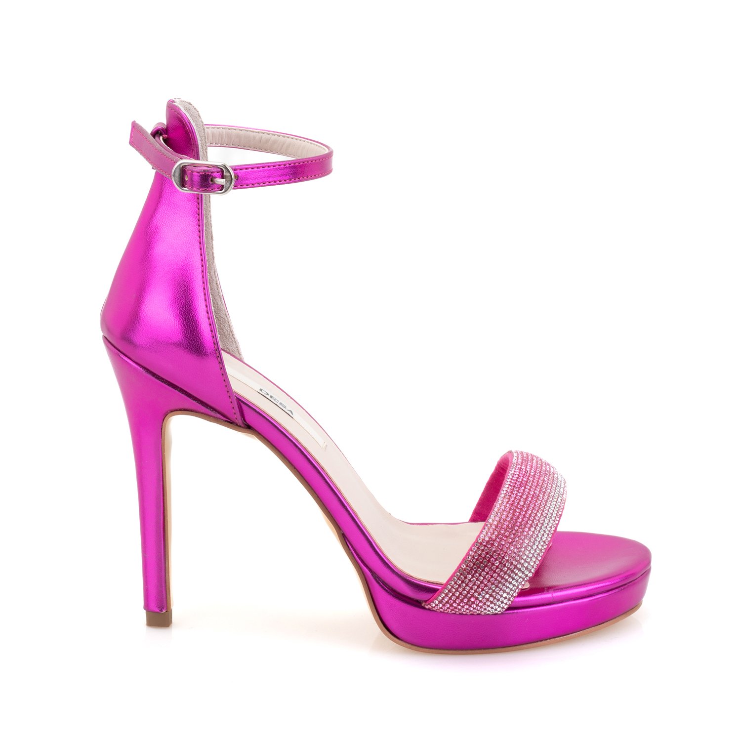 Pu iç astarlı, pu iç tabanlı, parlak taş akesuarlı, ayaralanabilir metal tokalı, neolit tabanlı, platform tabanlı topuklu kadın sandalet.