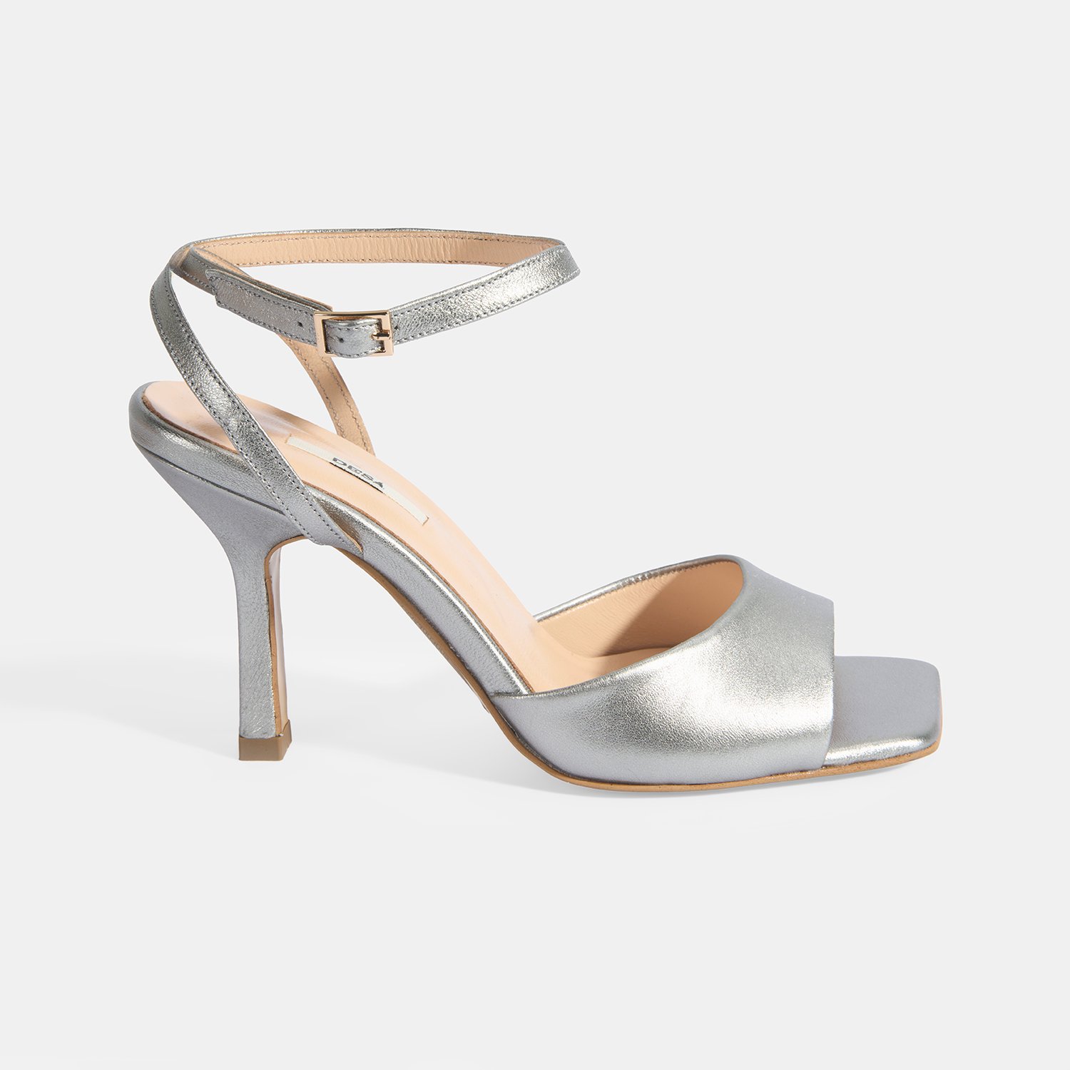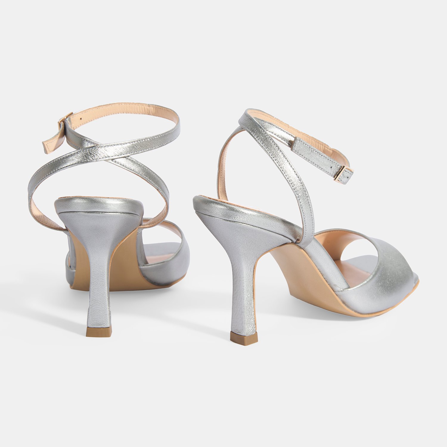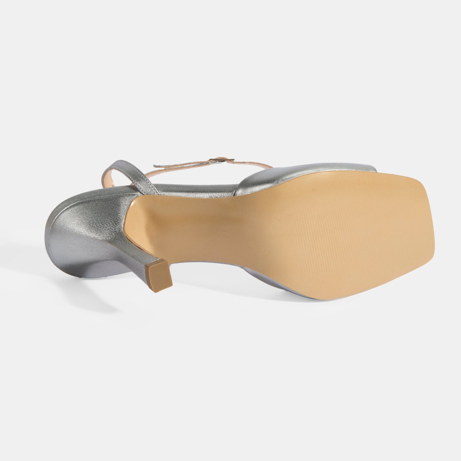 Kadın Gümüş Ayarlanabilir Tokalı Deri Abiye Topuklu Sandalet