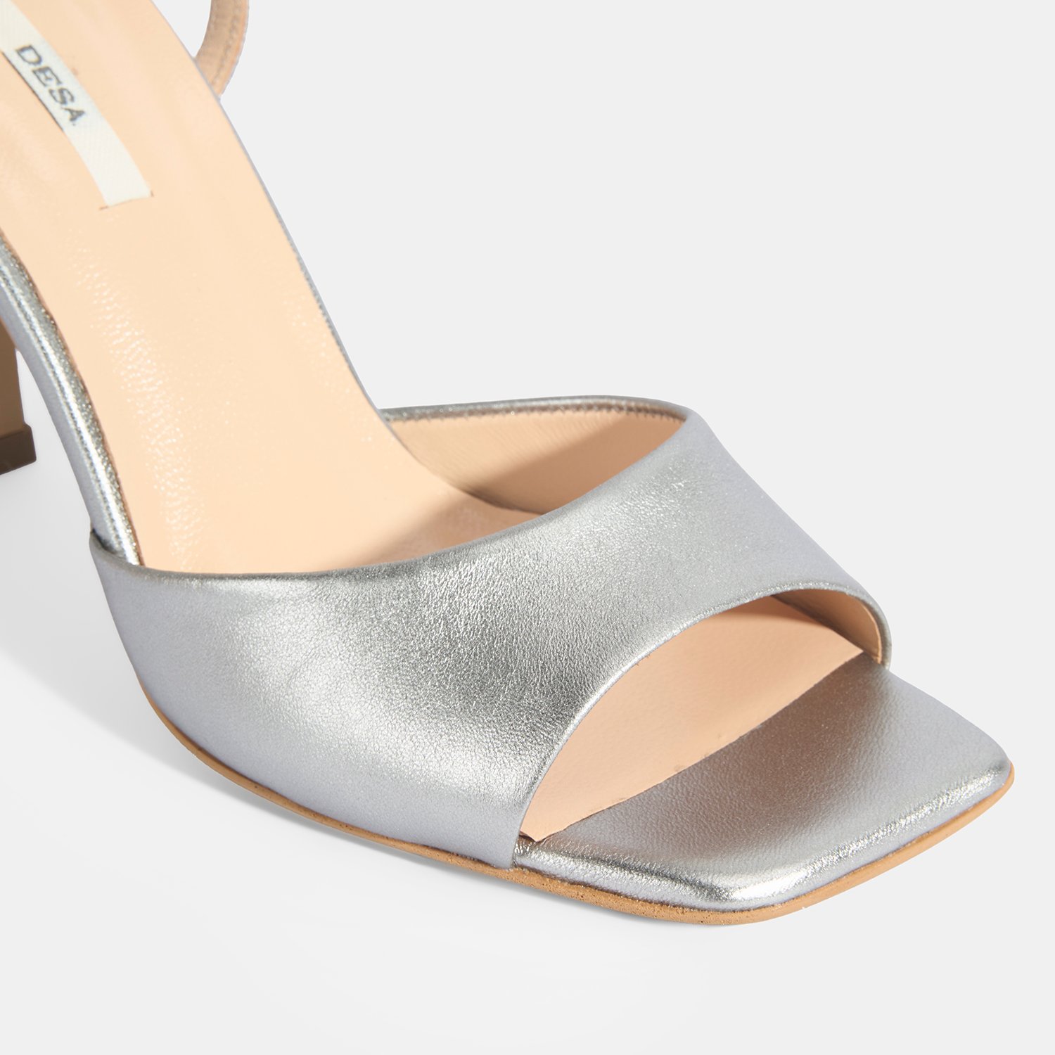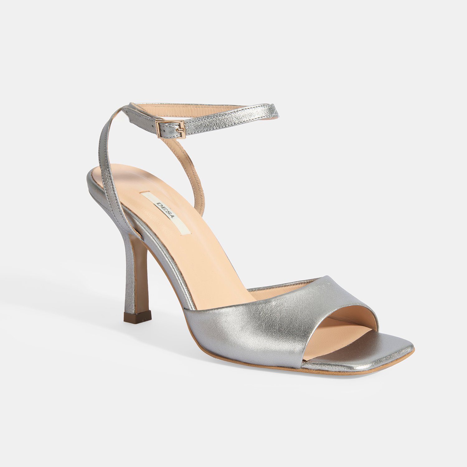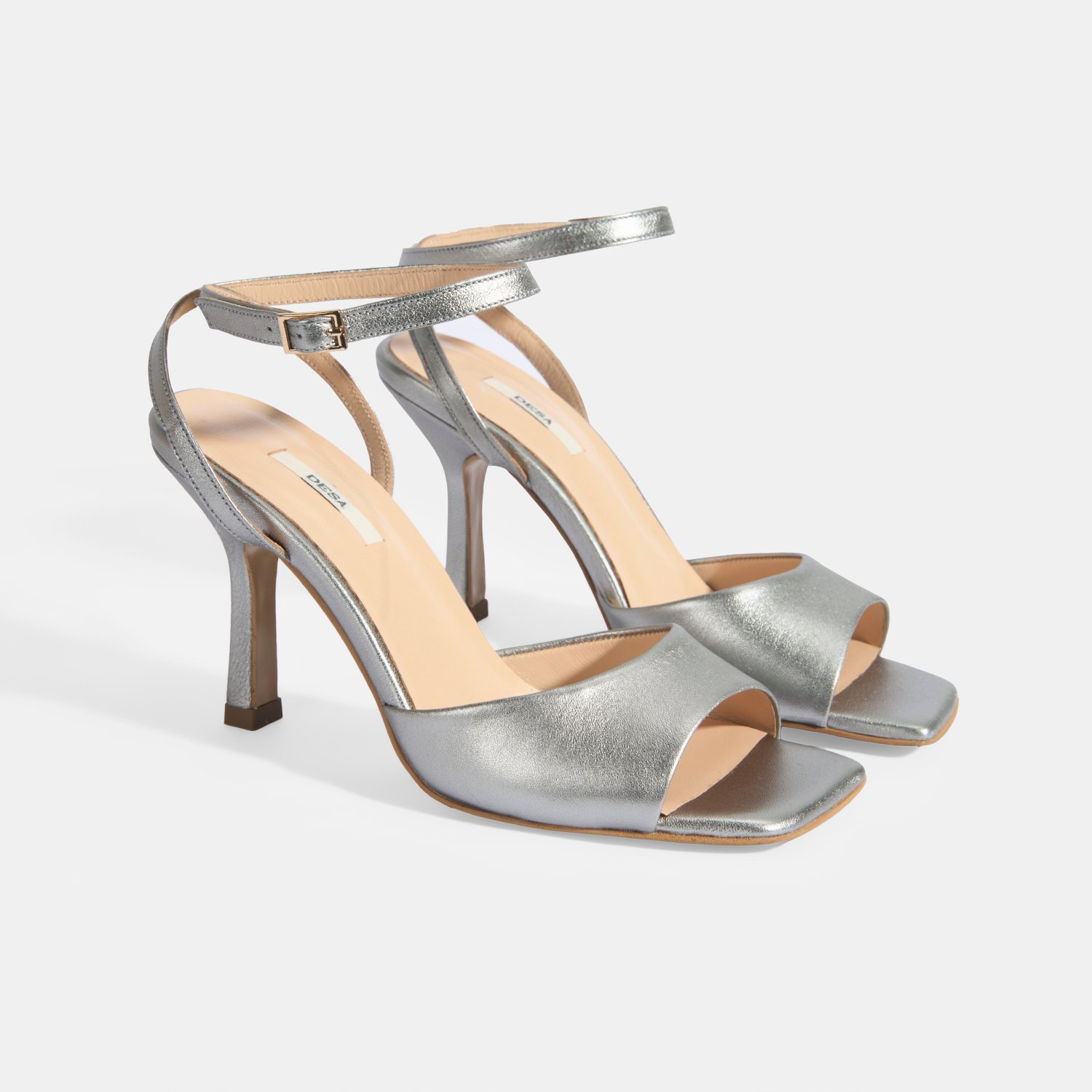 Kadın Gümüş Ayarlanabilir Tokalı Deri Abiye Topuklu Sandalet