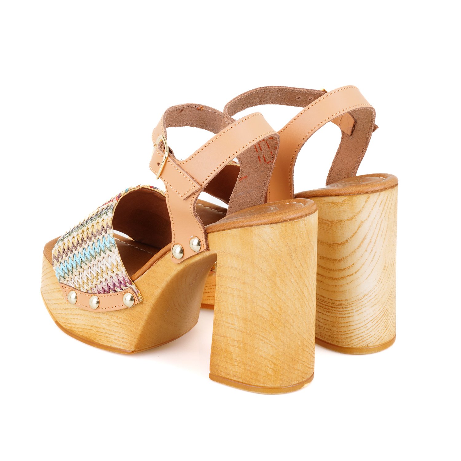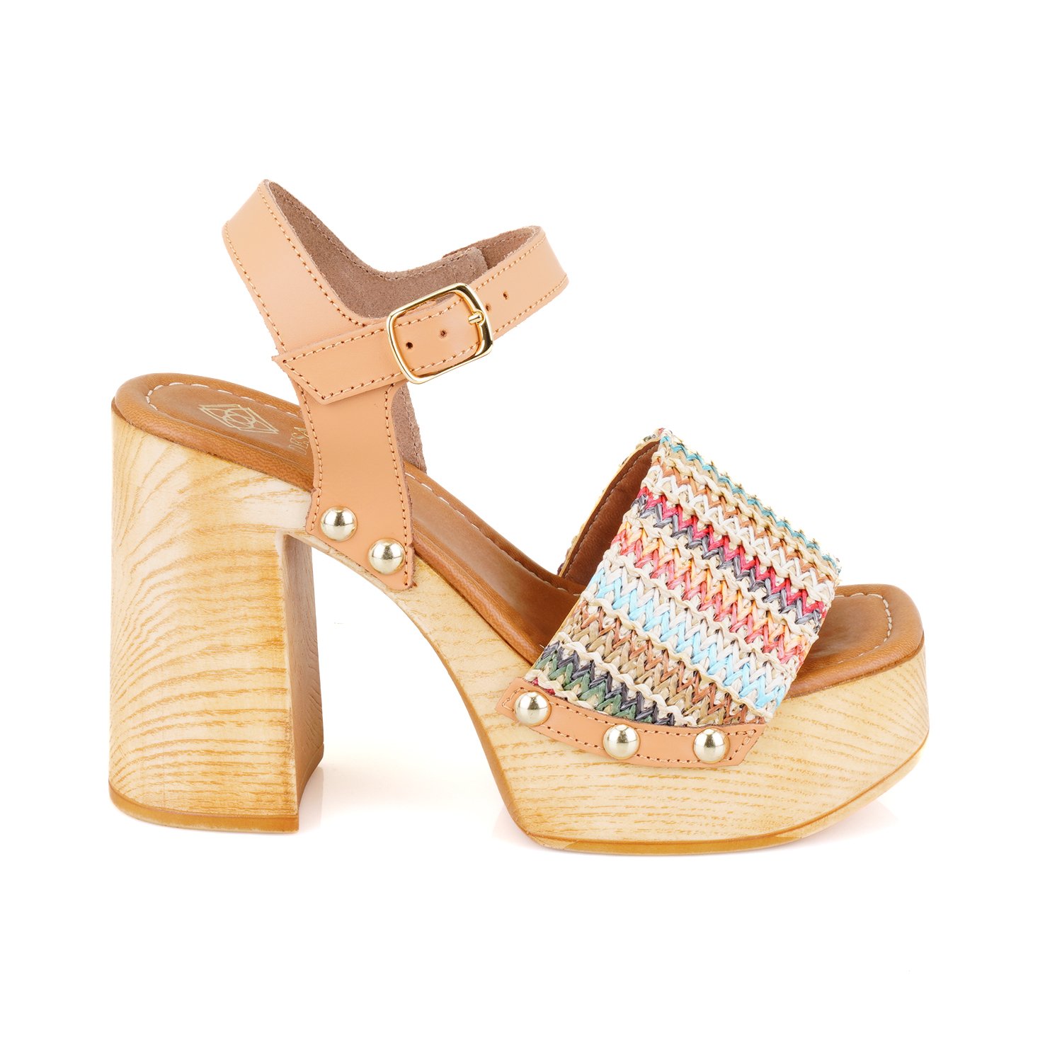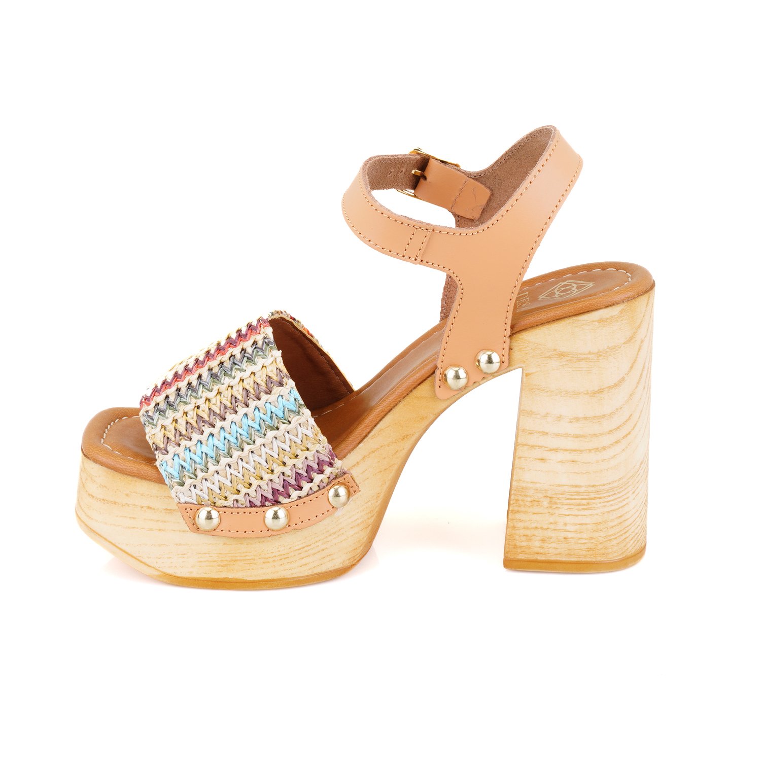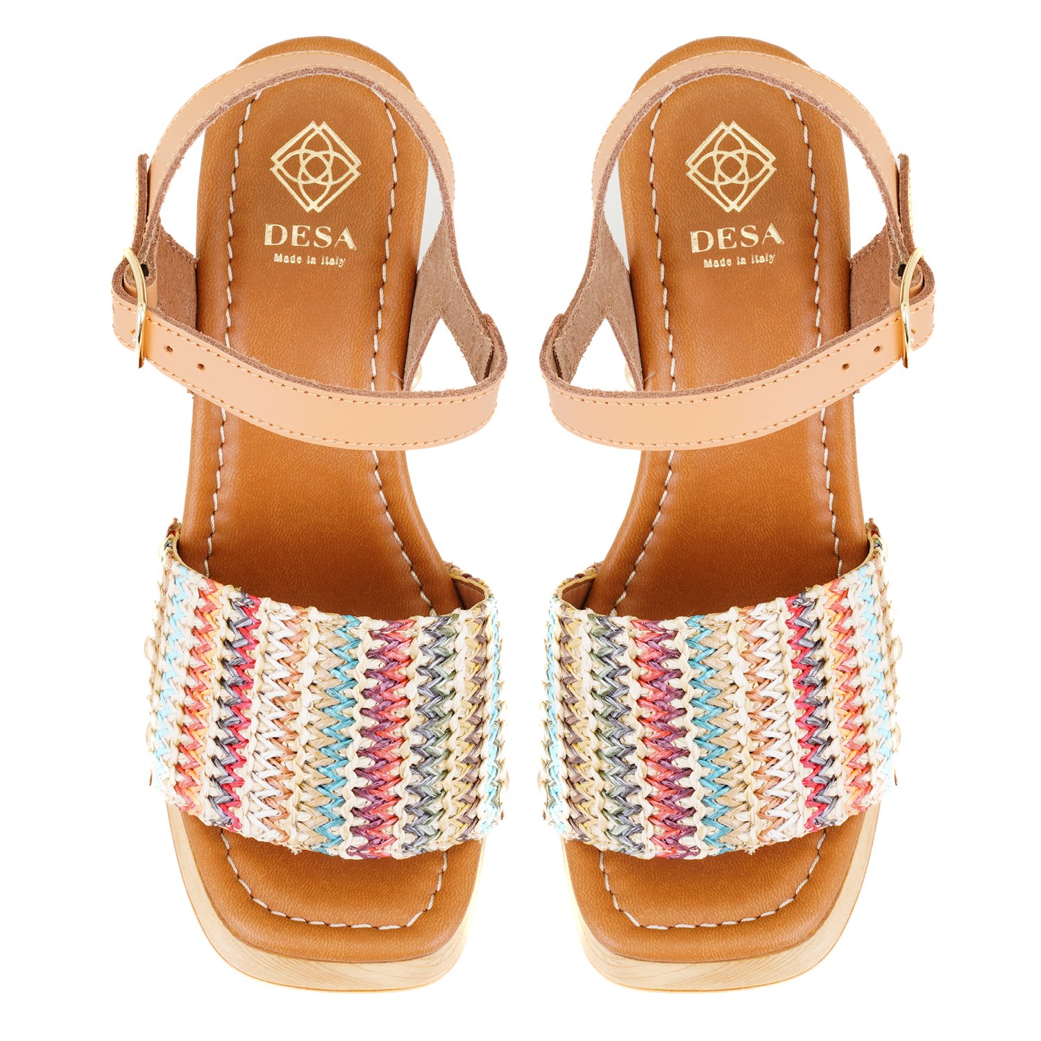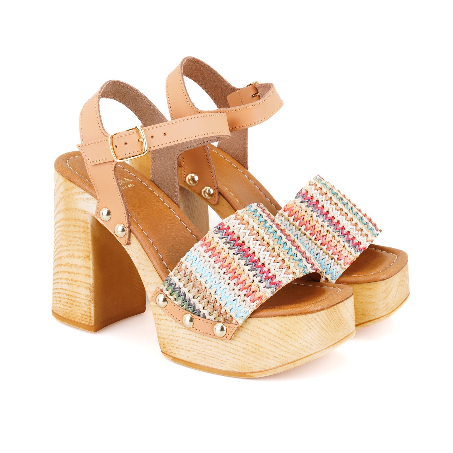 %80 örgü hasır, %20 deri, pu iç astarlı, pu iç tabanlı, pu tabanlı, kadın topuklu sandalet. Topuk yüksekliği 11 cm.