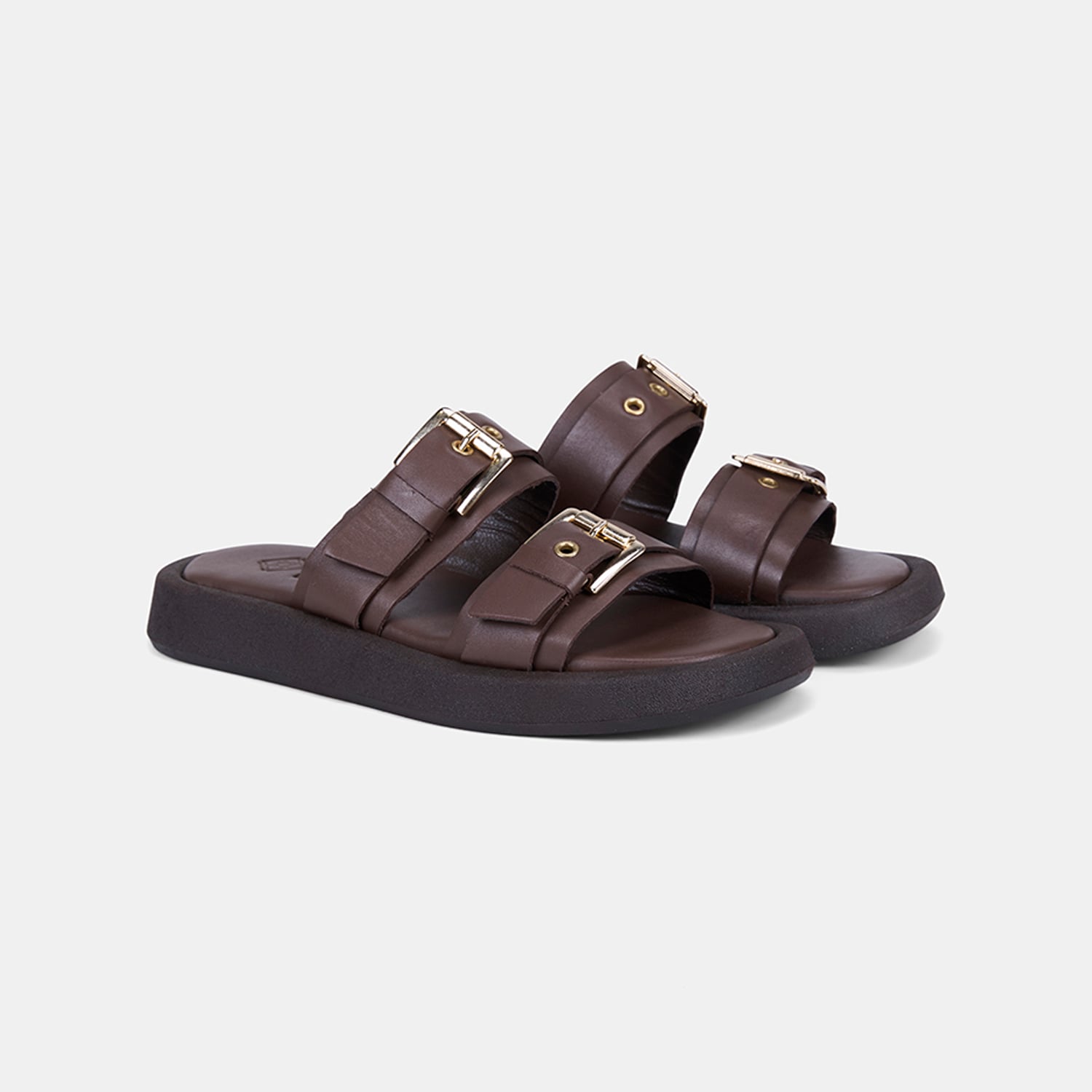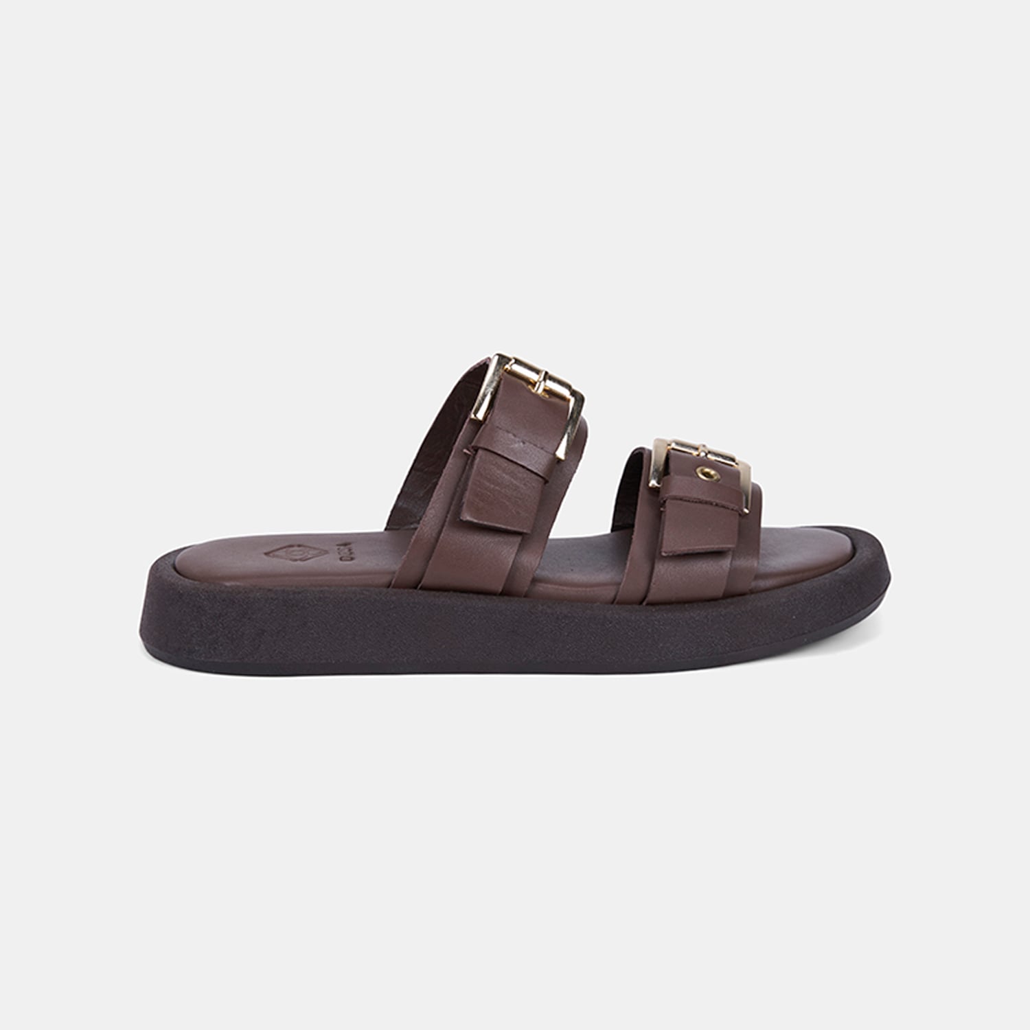 Kadın Kahve Ayarlanabilir Çift Metal Tokalı Deri Terlik
