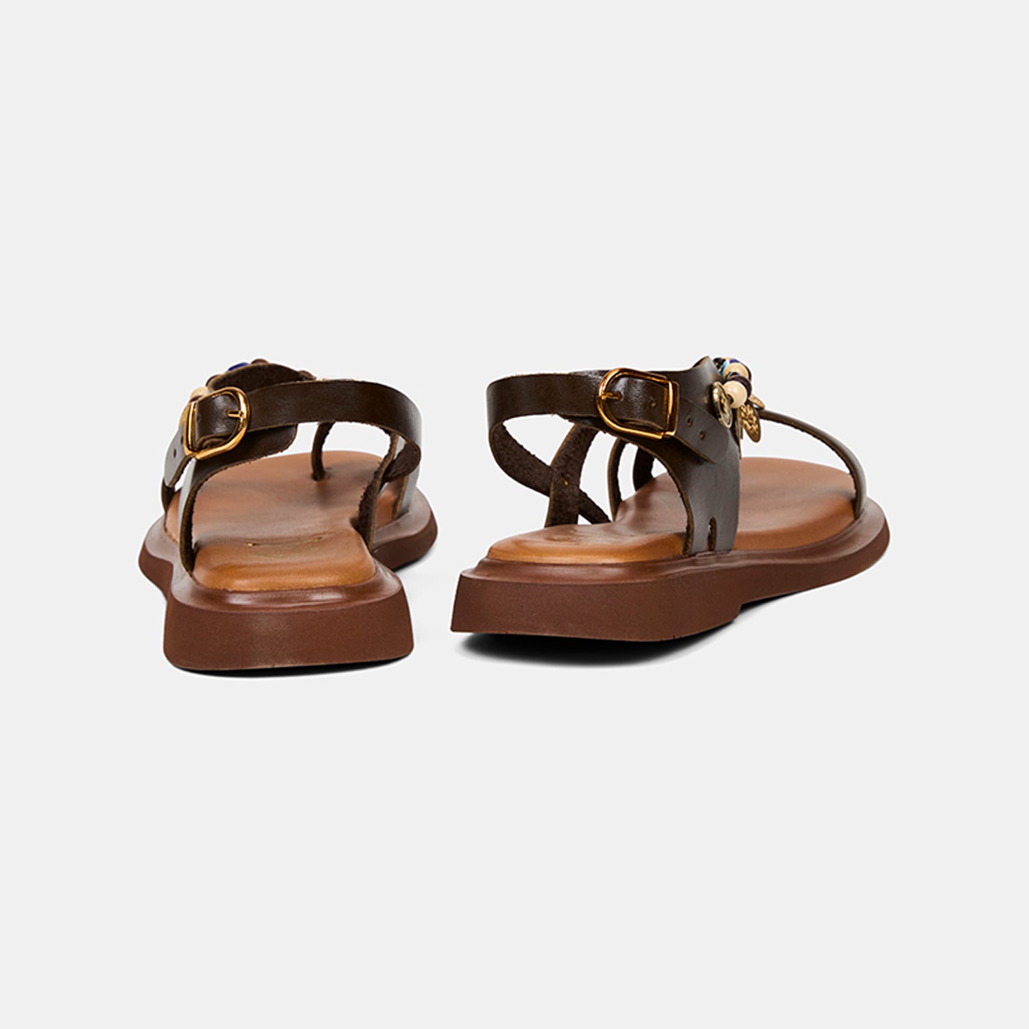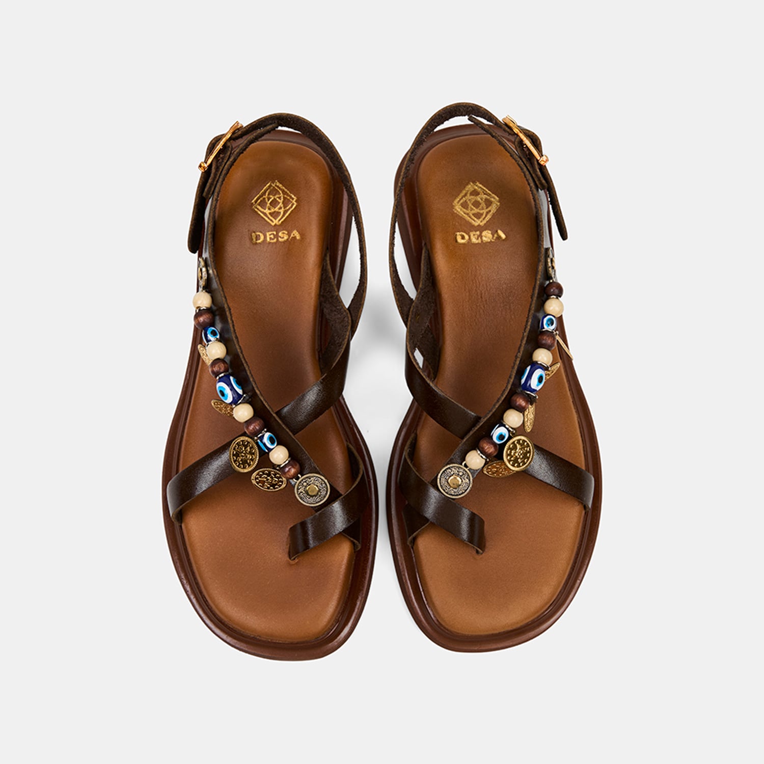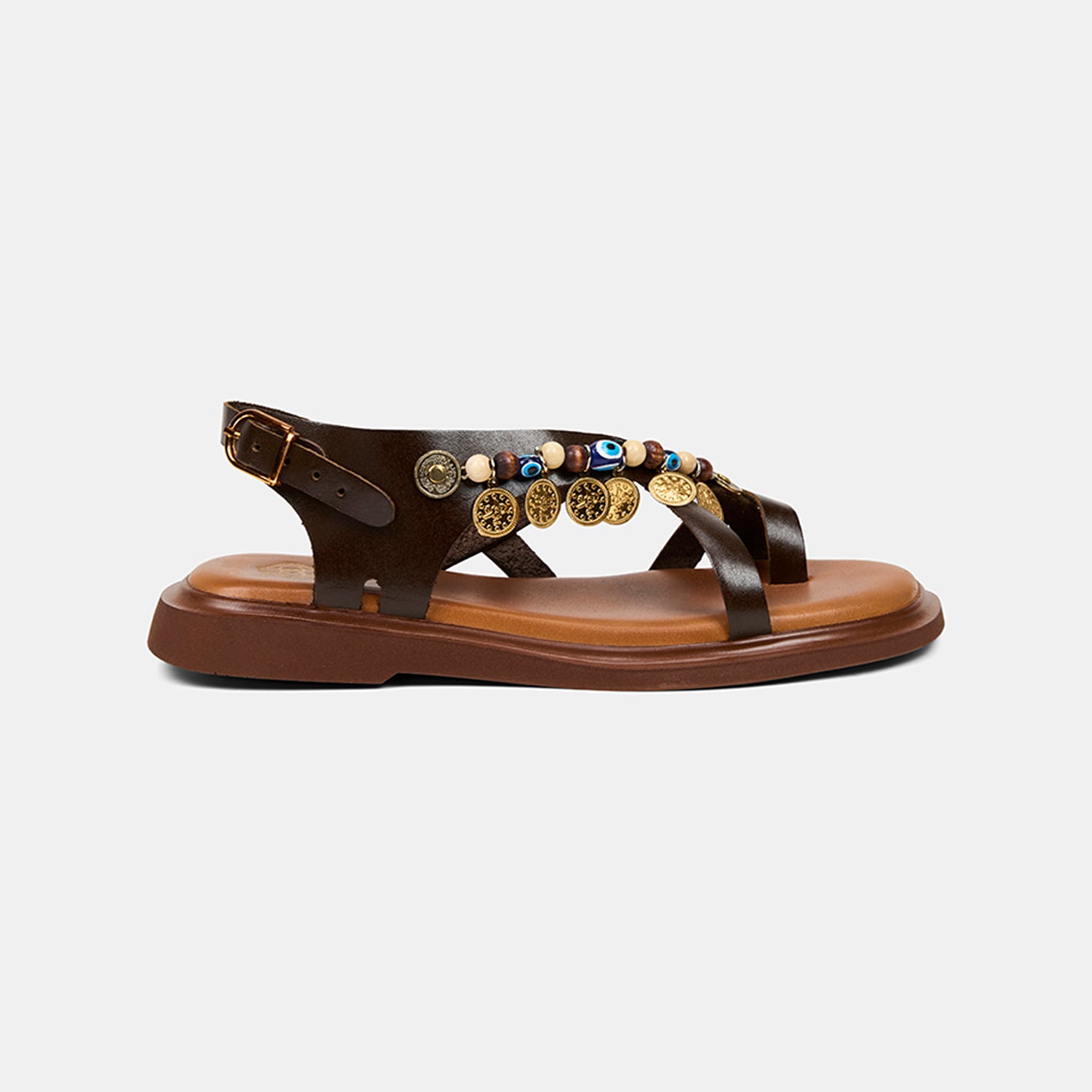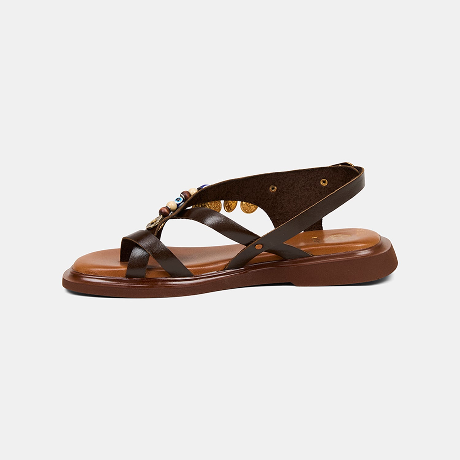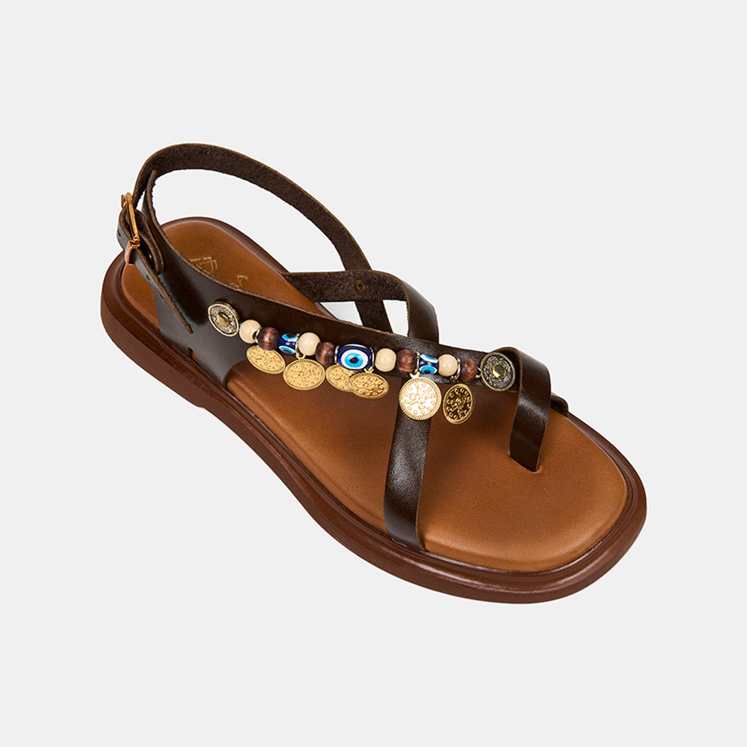 Kadın Kahve Boncuk Aksesuarlı Parmak Arası Deri Sandalet