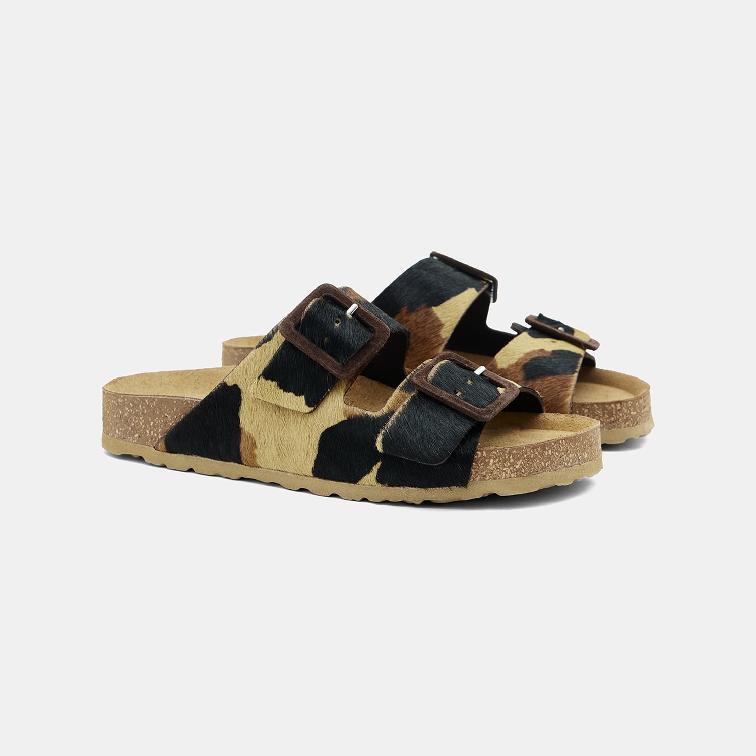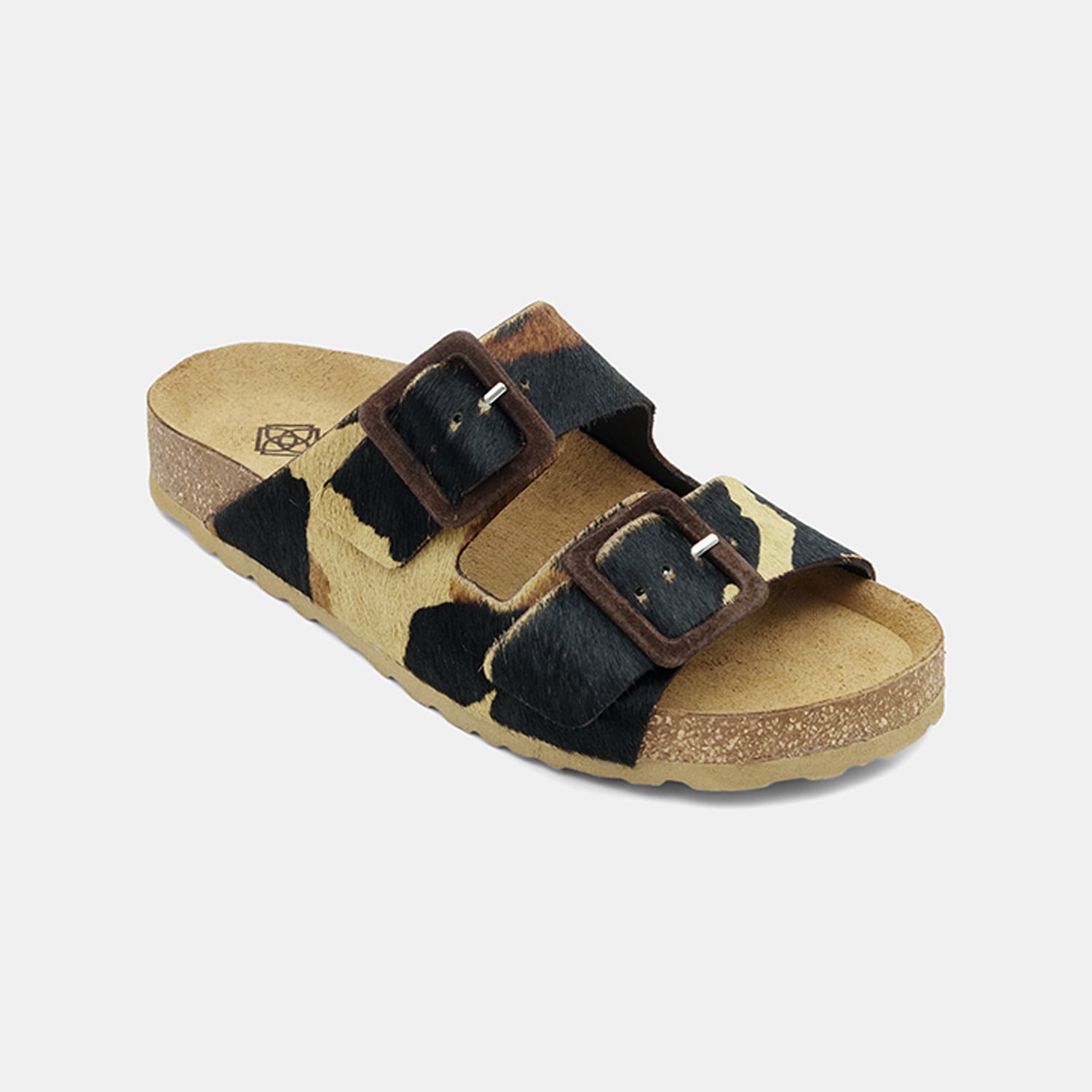 Kadın çift tokalı tay tüyü deri terlik, yumuşak dokusu ve ayarlanabilir yapısıyla günlük kullanımda rahatlık sunan bir modeldir.