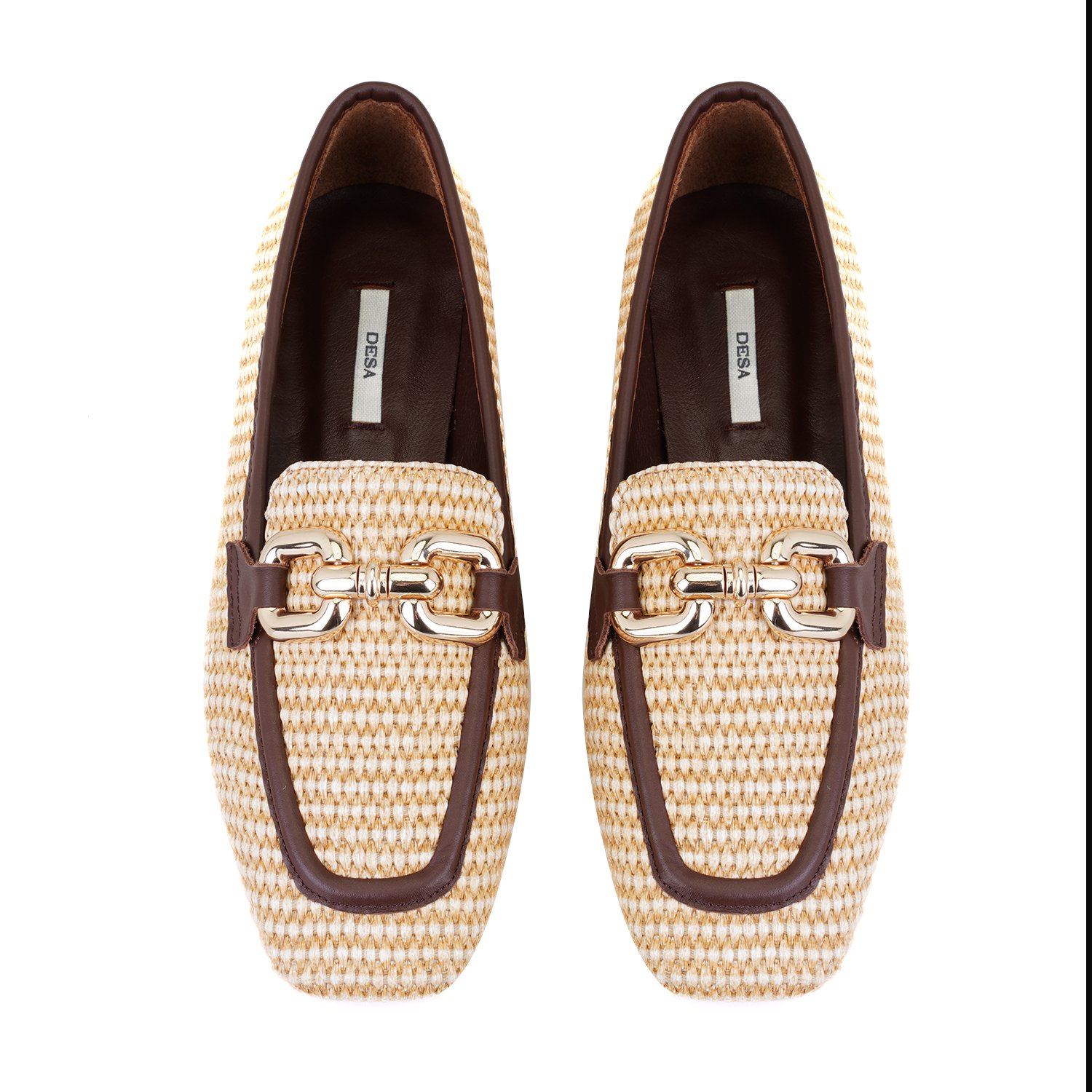 %50 tekstil %50 deri, iç astarlı, rafya örgülü, mostra deri, kauçuk taban, kadın rafya örgülü deri loafer.