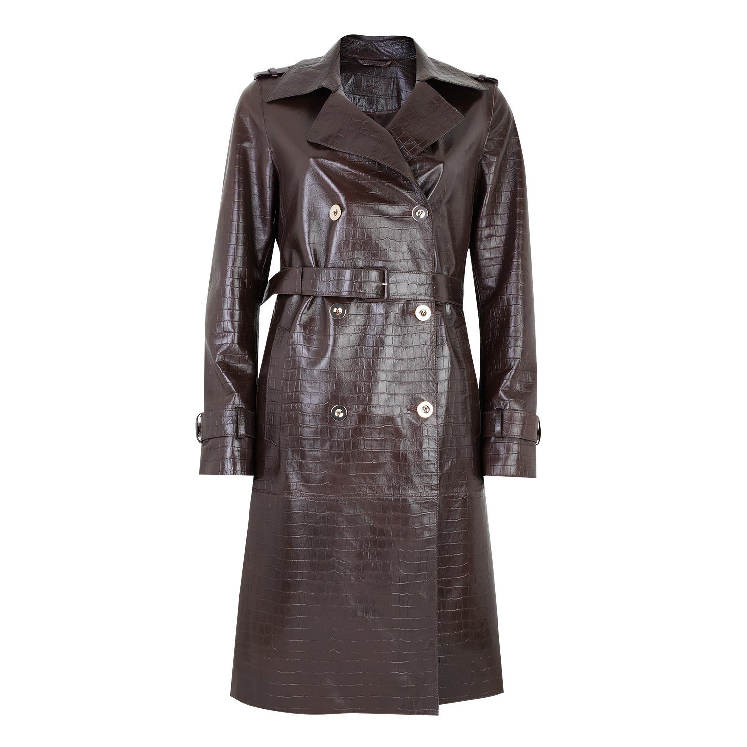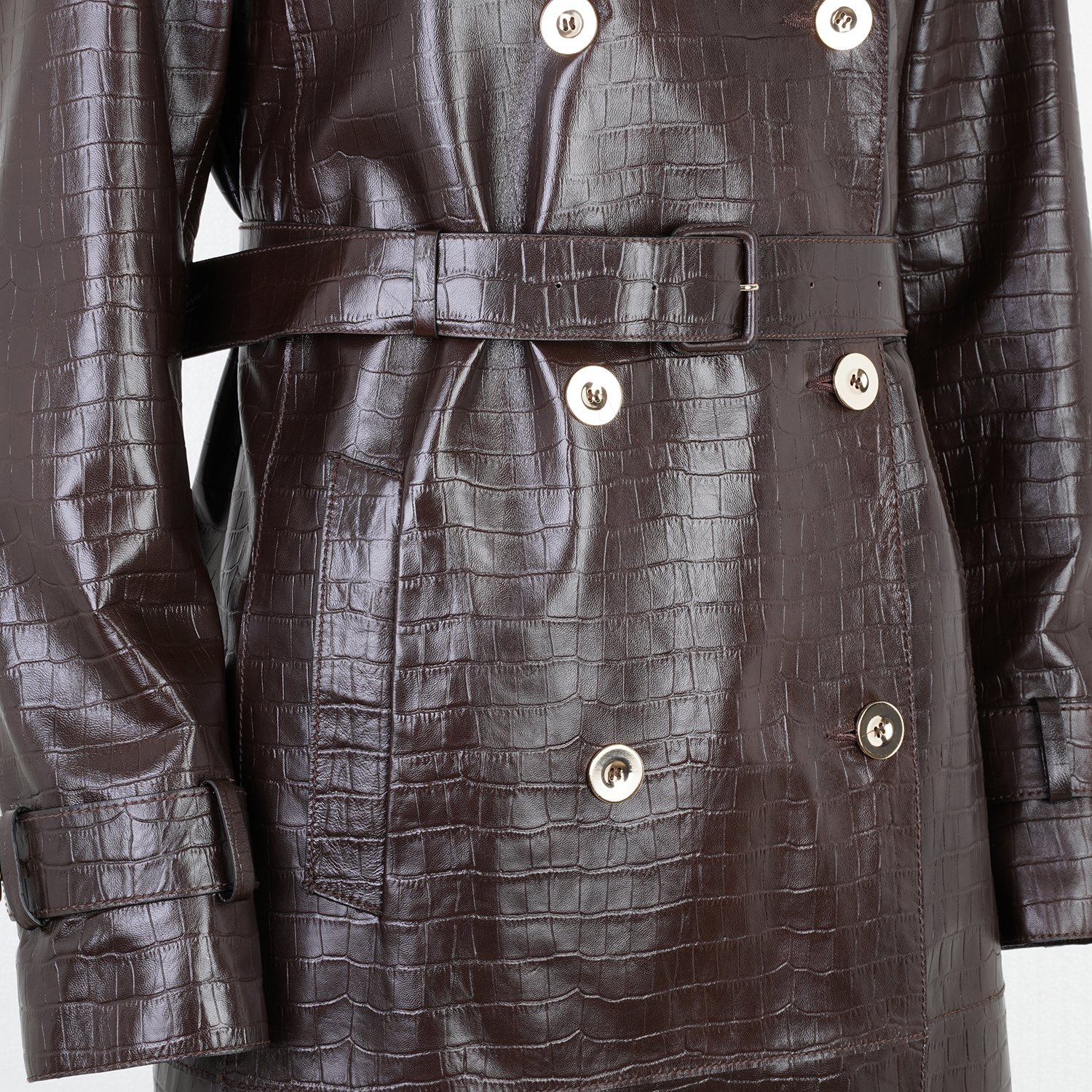 Yakalı, kruvaze kapamalı, kroko baskılı kadın deri trençkot.