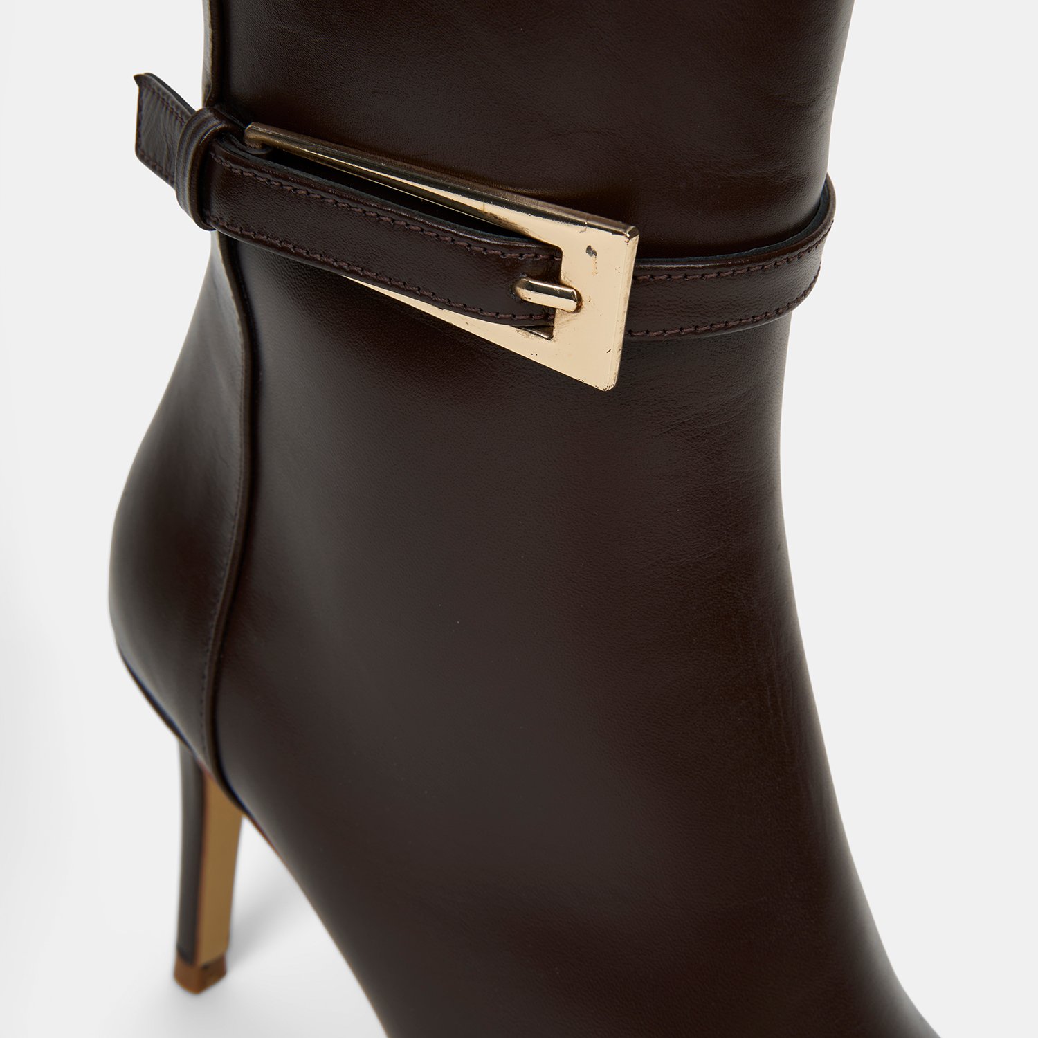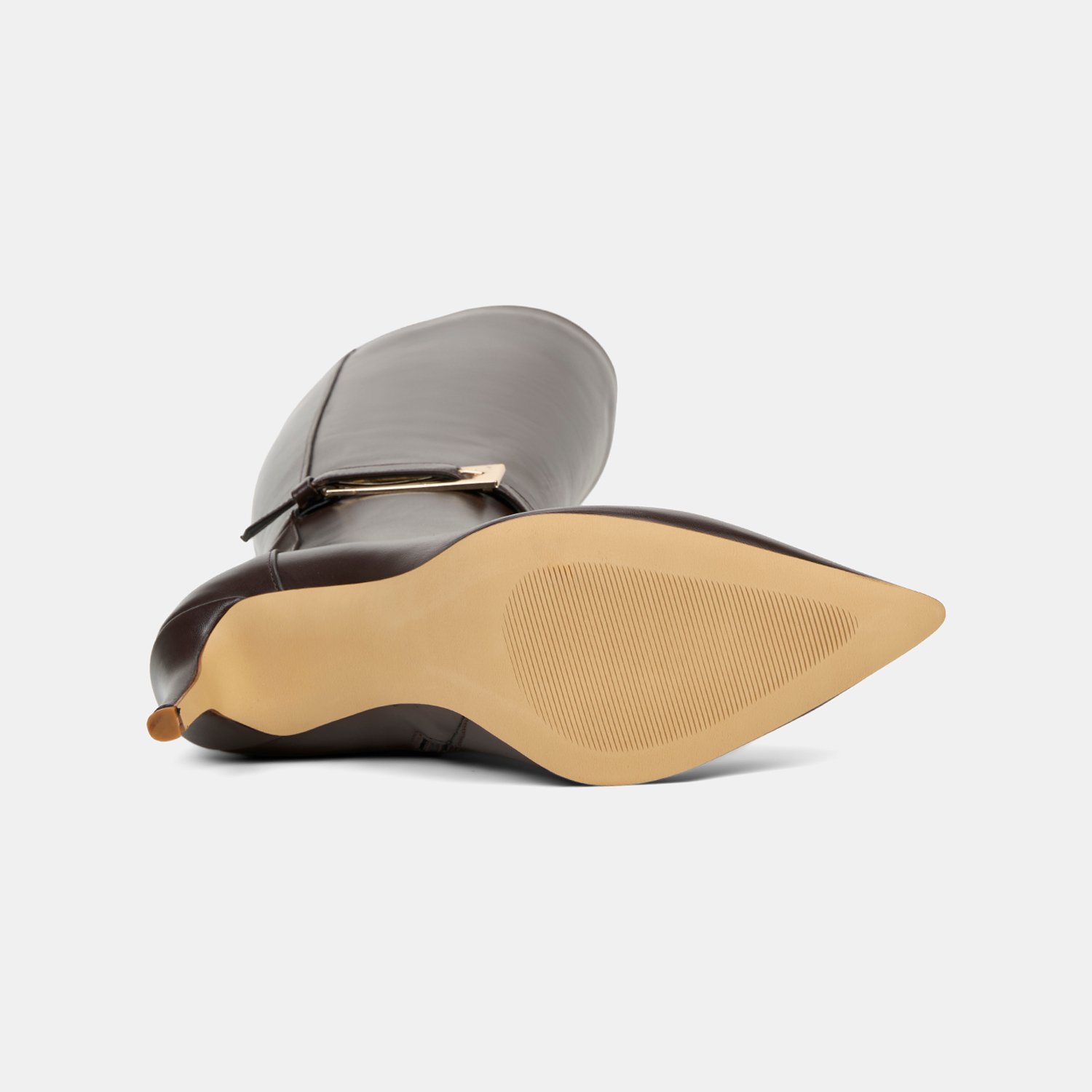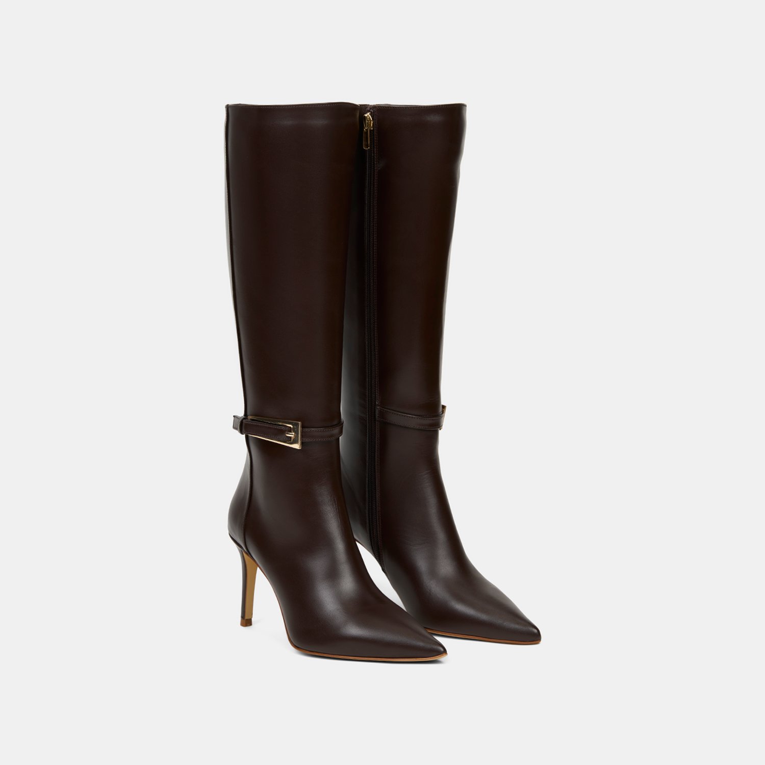 %100 deri, deri iç tabanlı, tekstil astarlı, neolit tabanlı, ayarlanabilir zarif metal toka detaylı, sivri burunlu, yüksek topuklu kadın çizme. Topuk yüksekliği 8.50 cm.