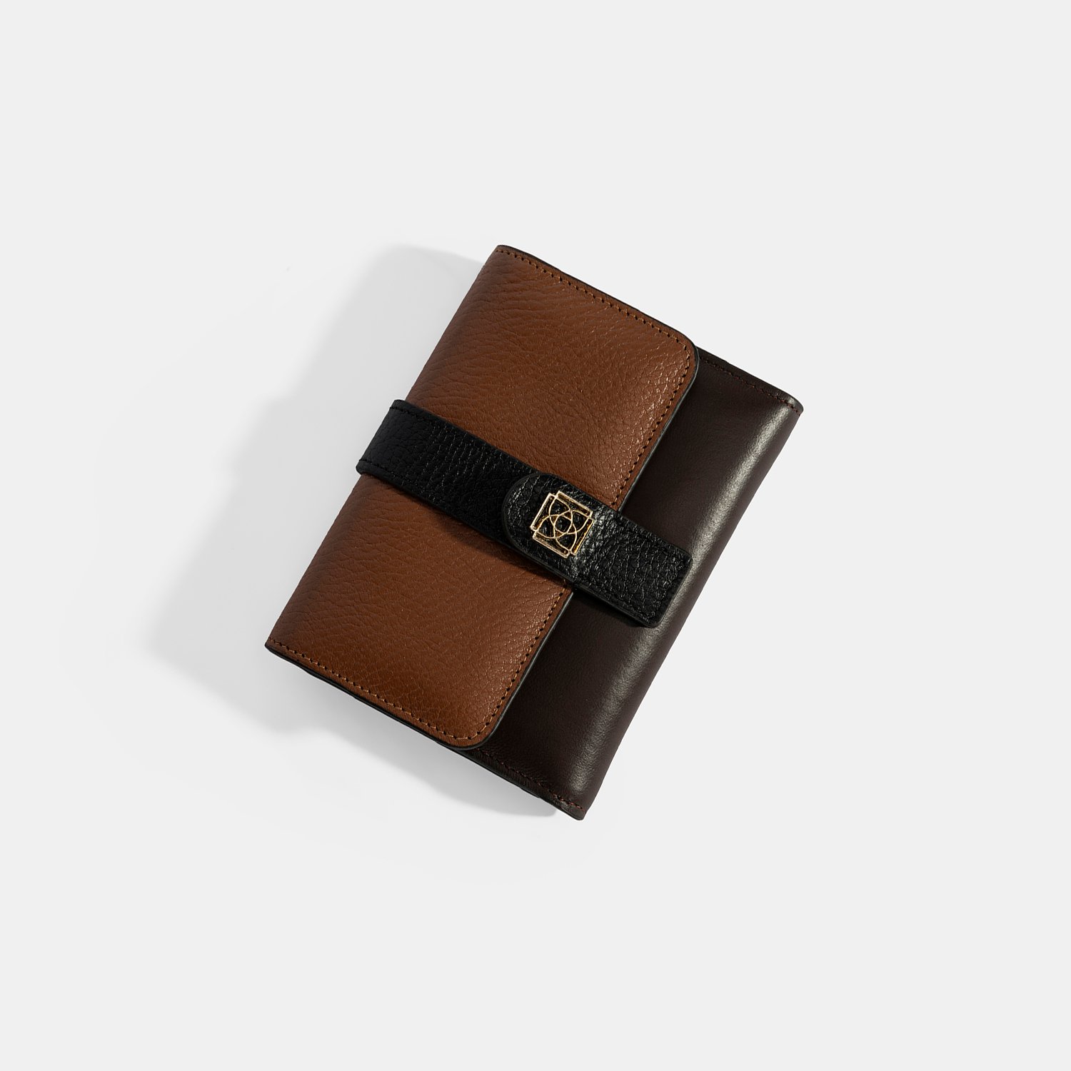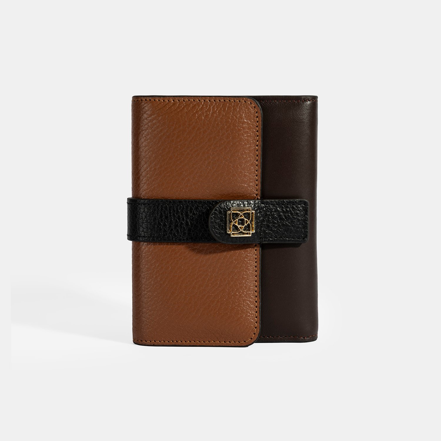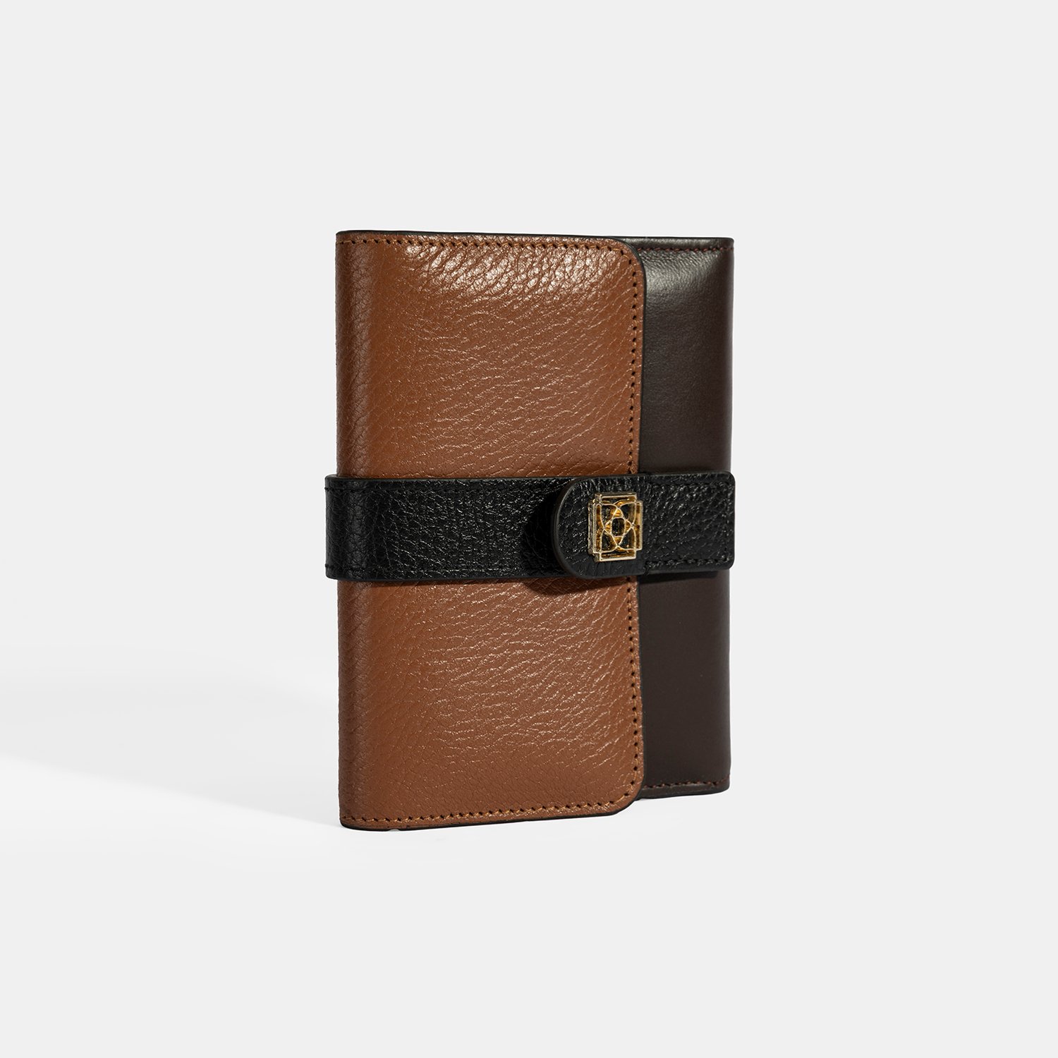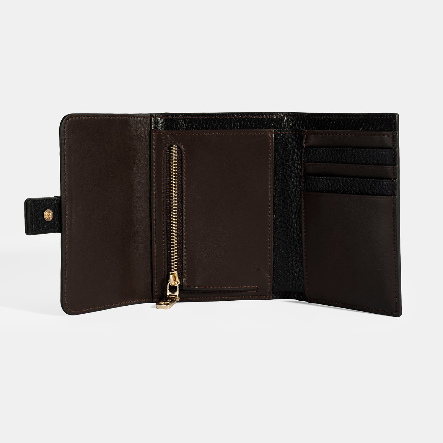 Çıtçıt kapamalı, parlak düz renkte ve çiçek logolu deri cüzdan.