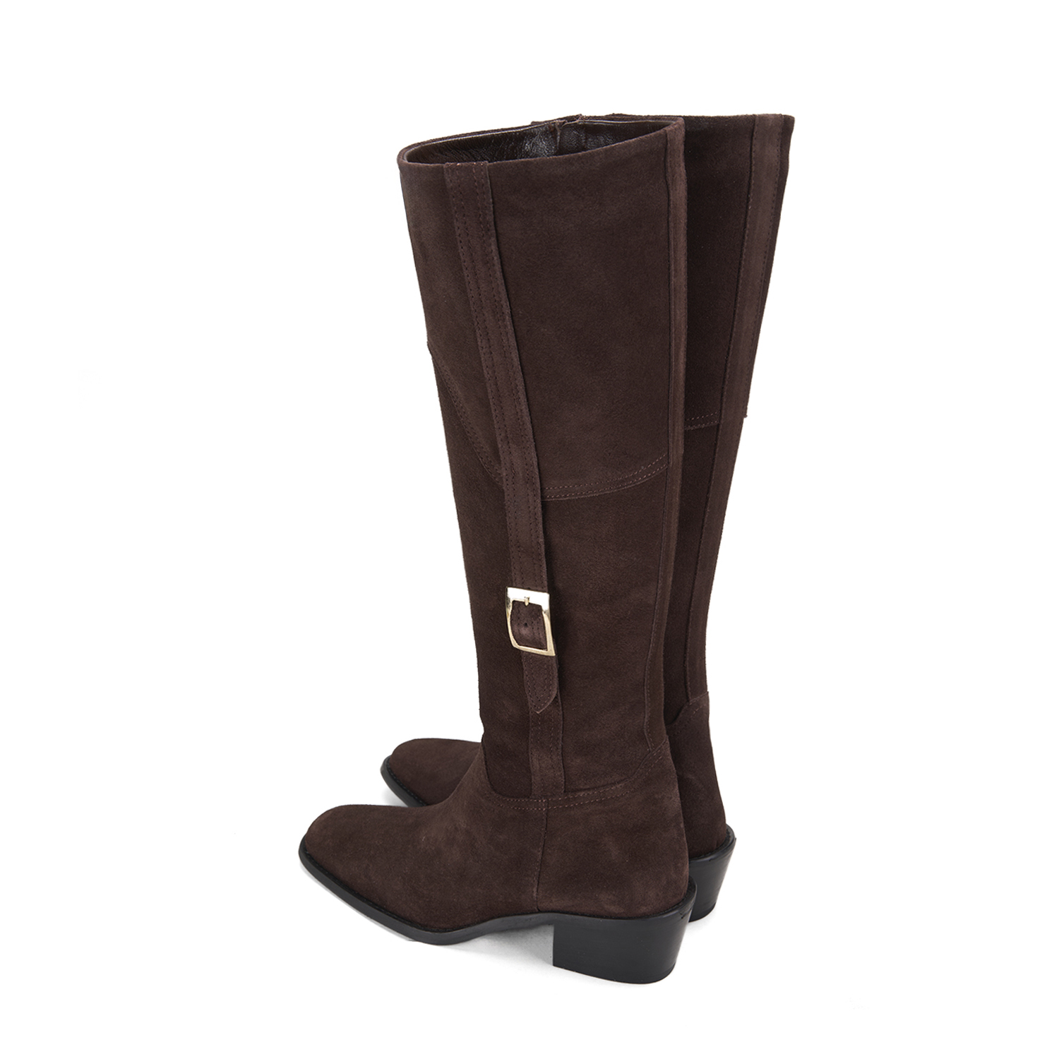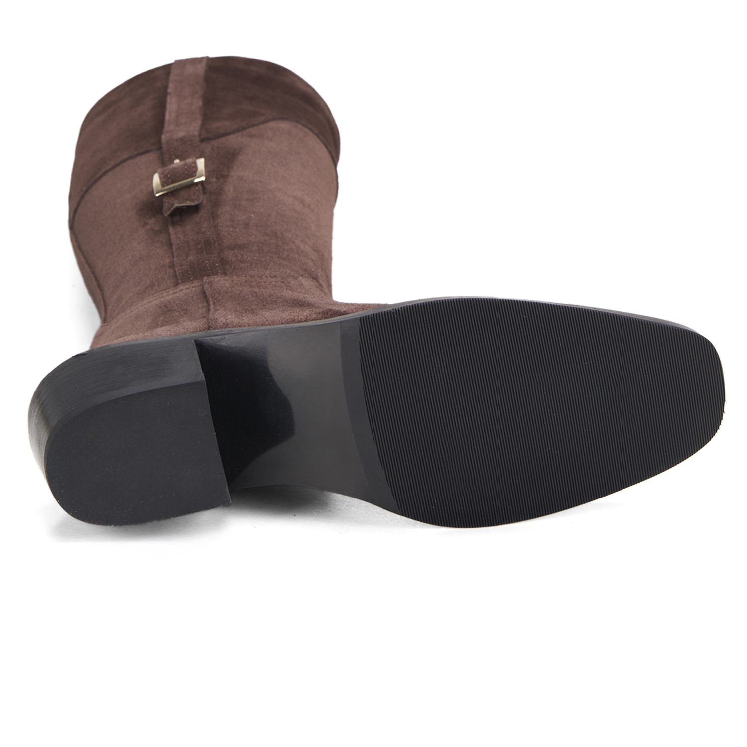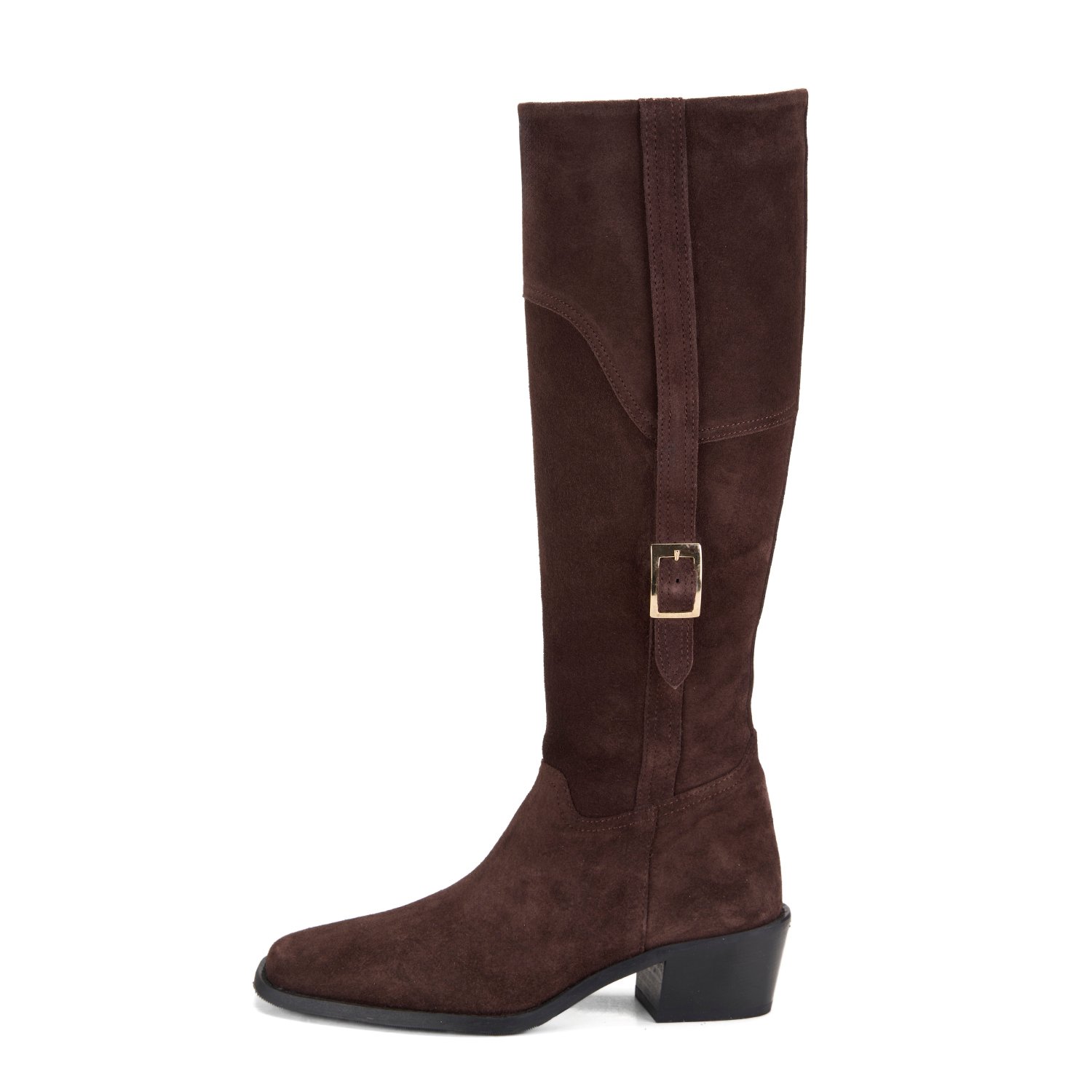 %100 süet deri, deri iç tabanlı, deri astarlı, jurdan tabanlı, metal toka akseusar detaylı, kadın çizme. Topuk yüksekliği 4.5cm, konç yüksekliği 38 cm