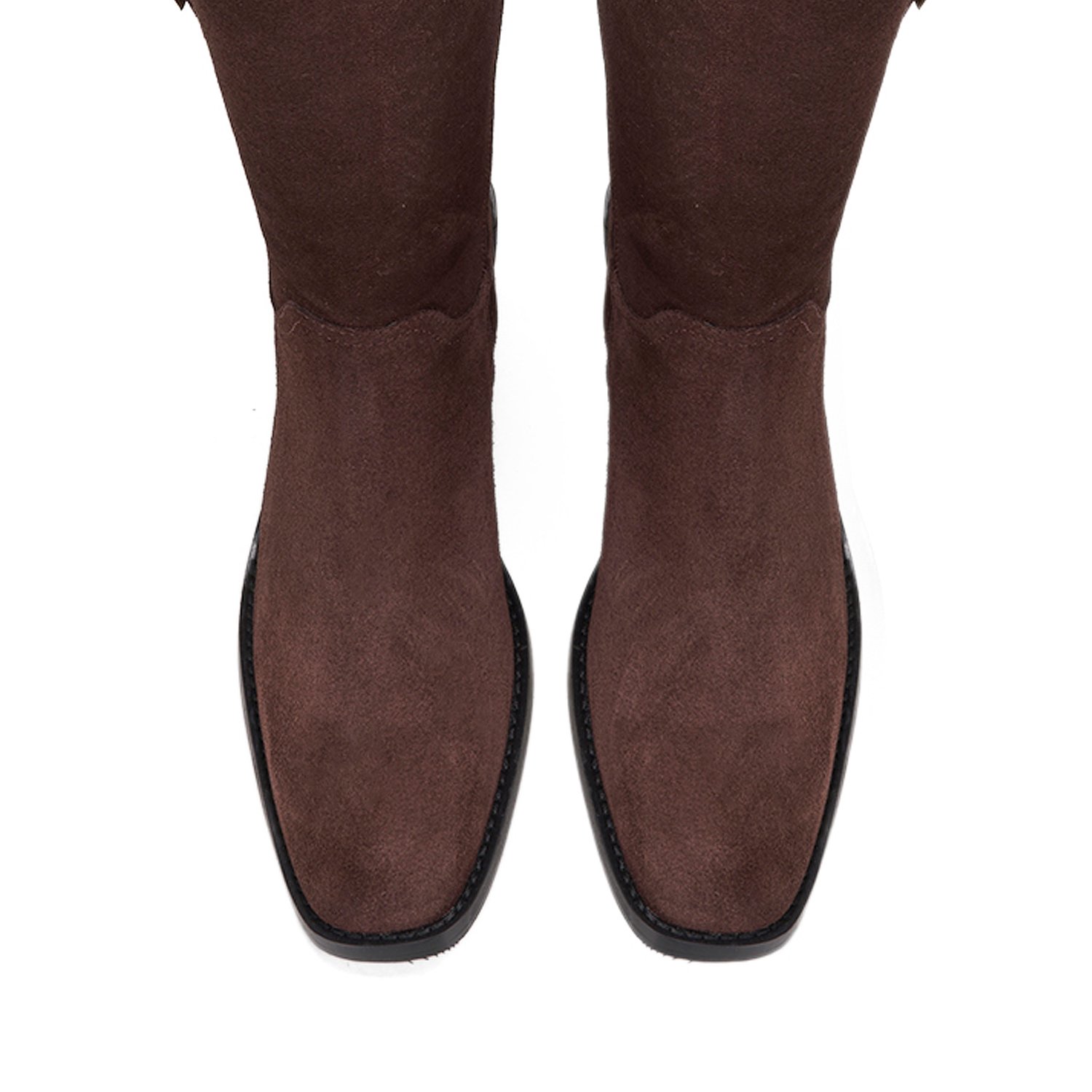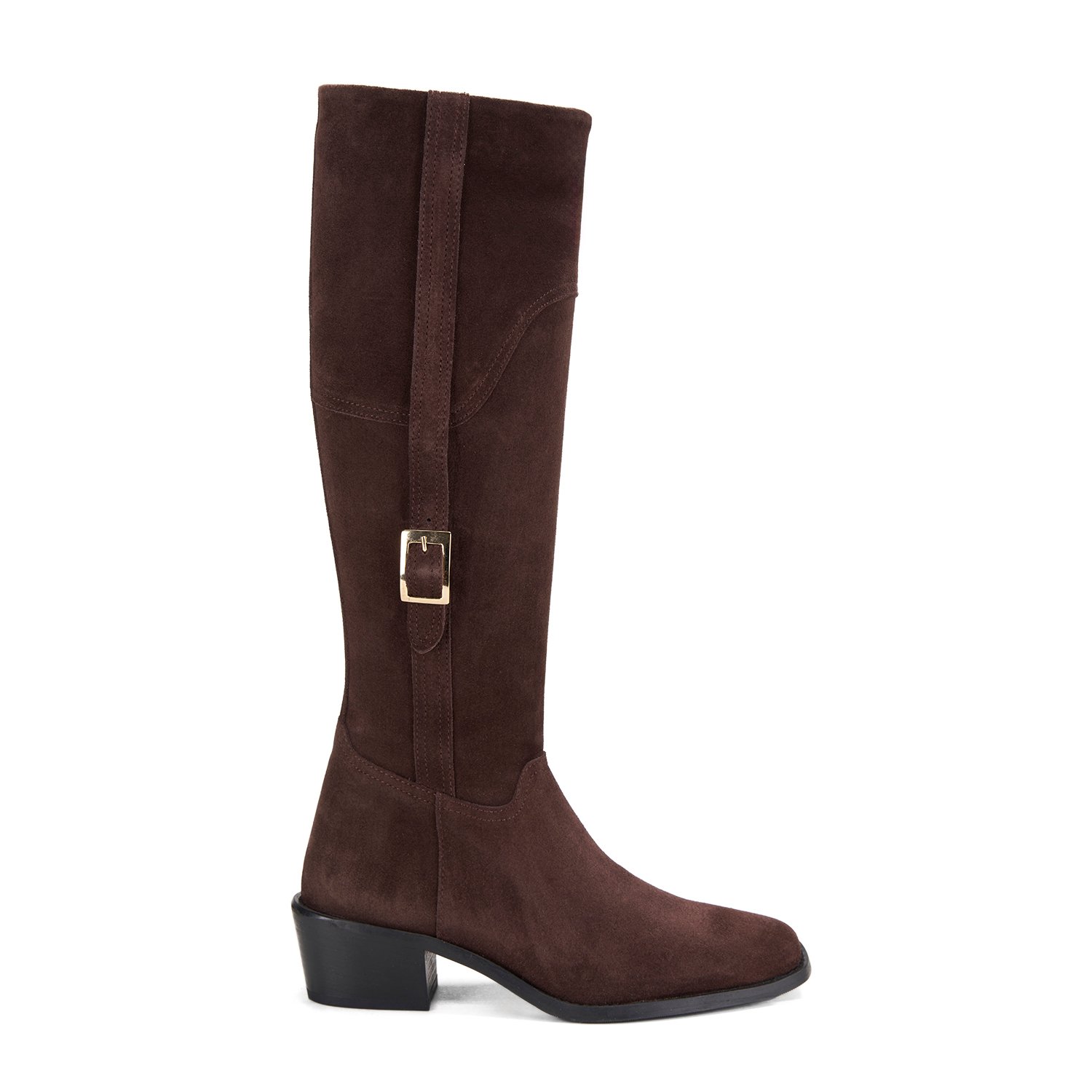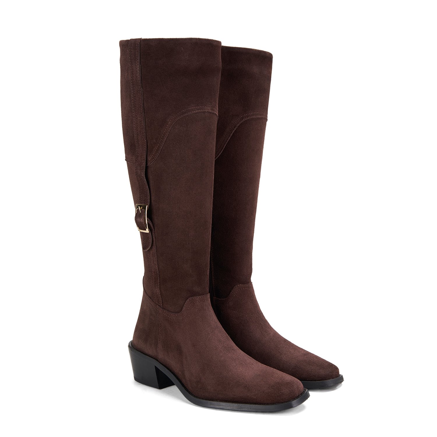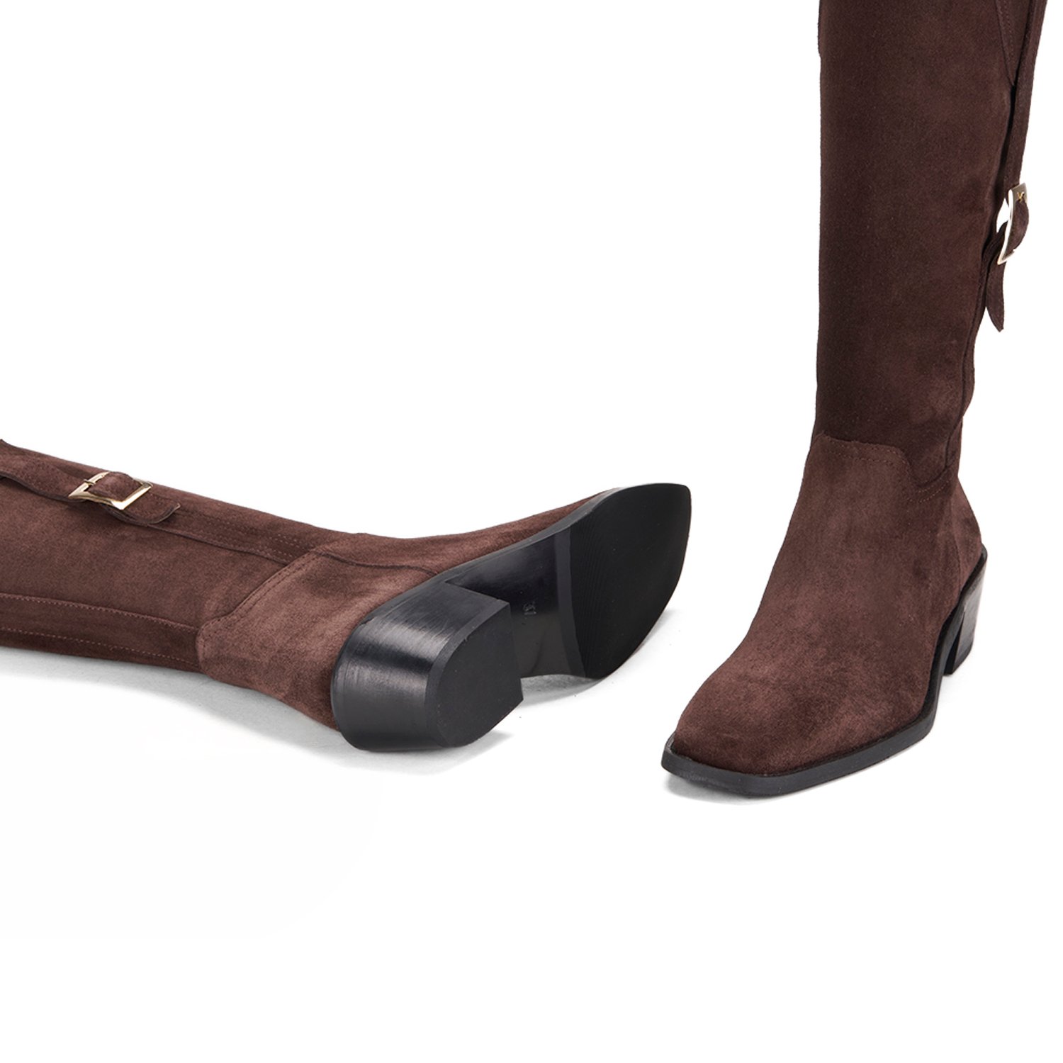 %100 süet deri, deri iç tabanlı, deri astarlı, jurdan tabanlı, metal toka akseusar detaylı, kadın çizme. Topuk yüksekliği 4.5cm, konç yüksekliği 38 cm