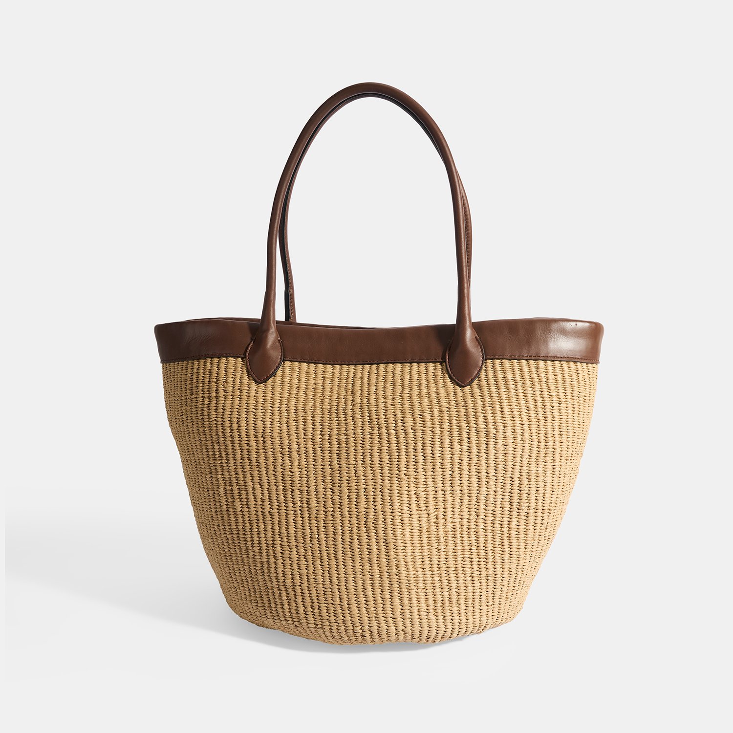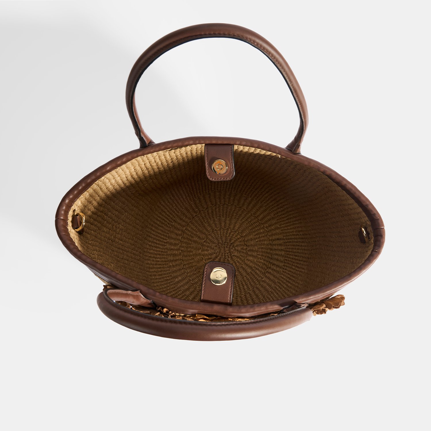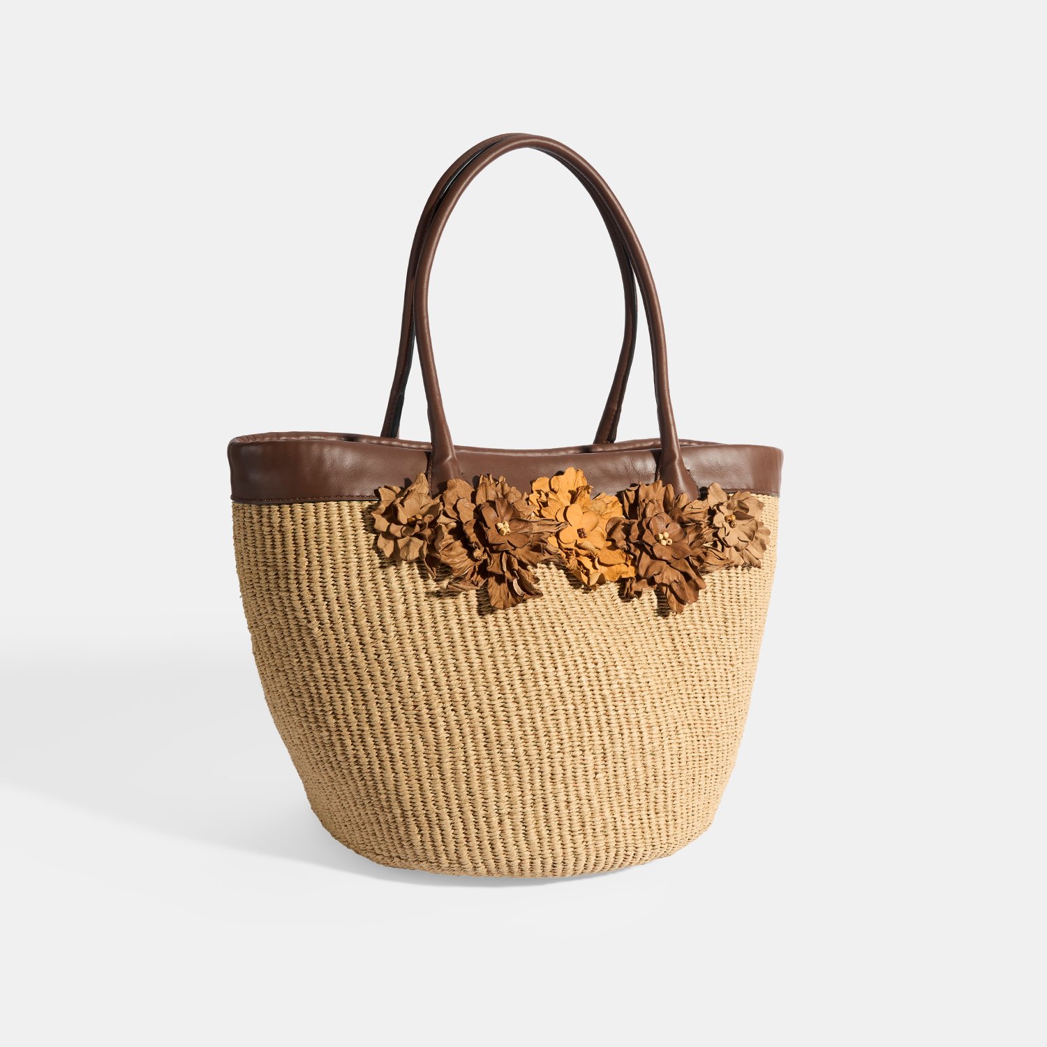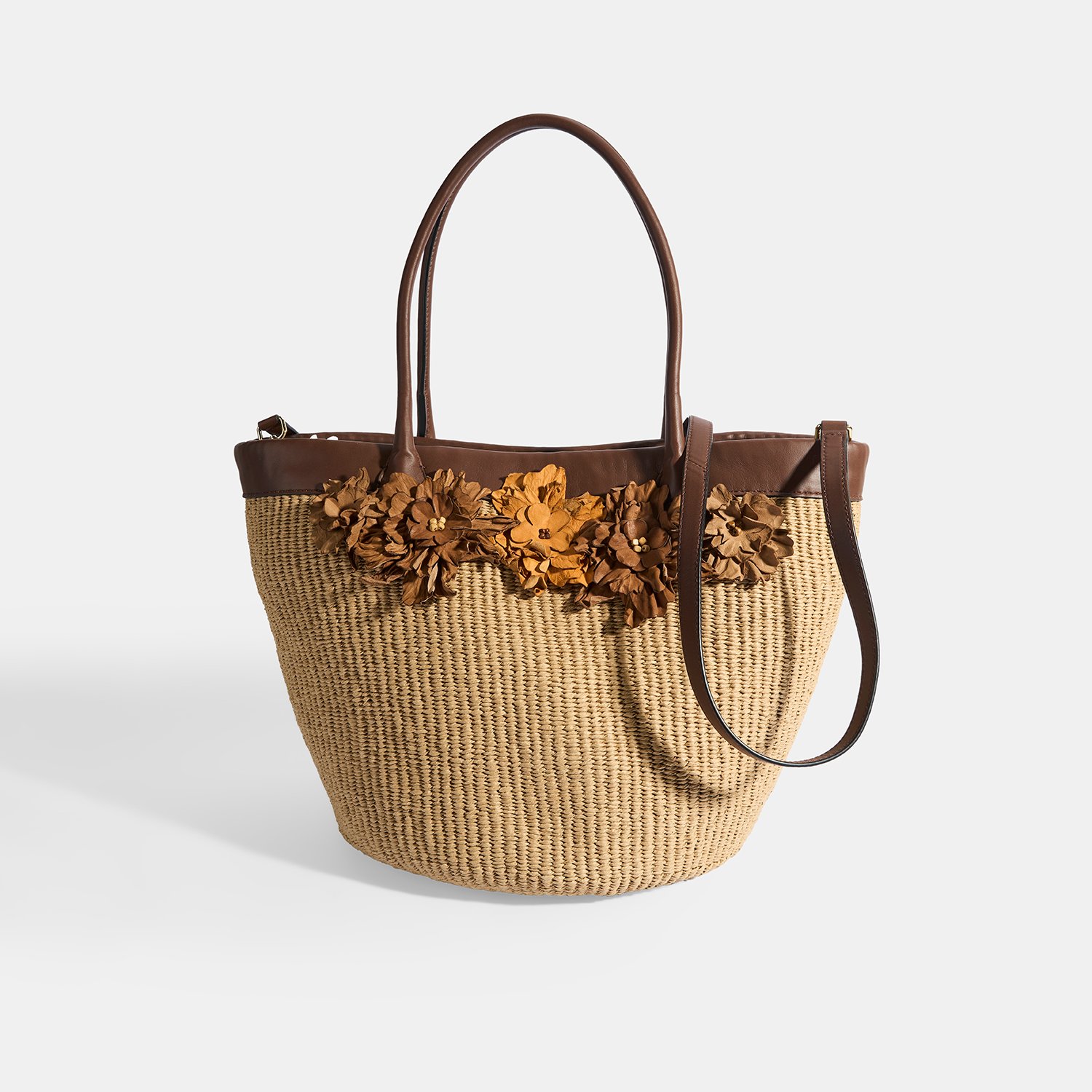 Kadın Kahve Turuncu Çiçek Detaylı Hasır Omuz Çantası