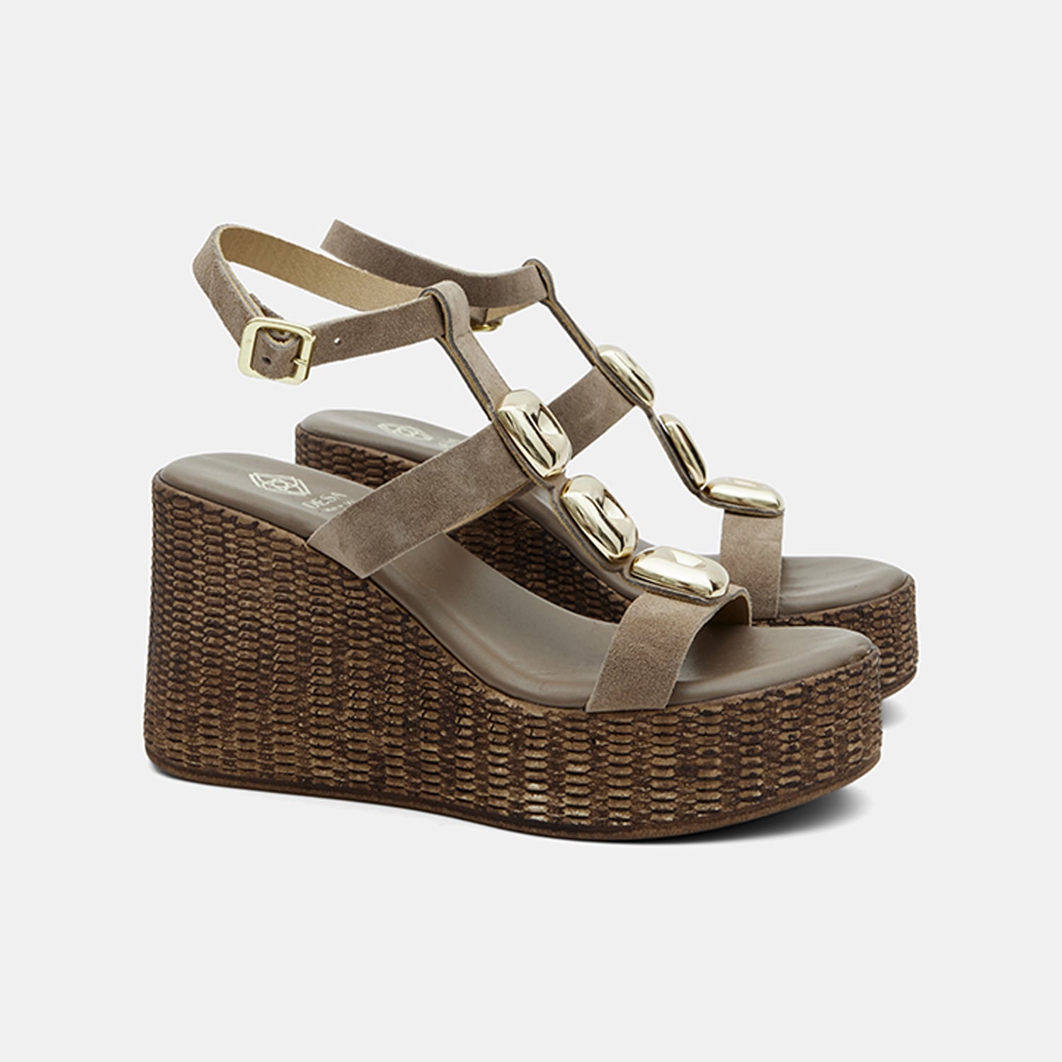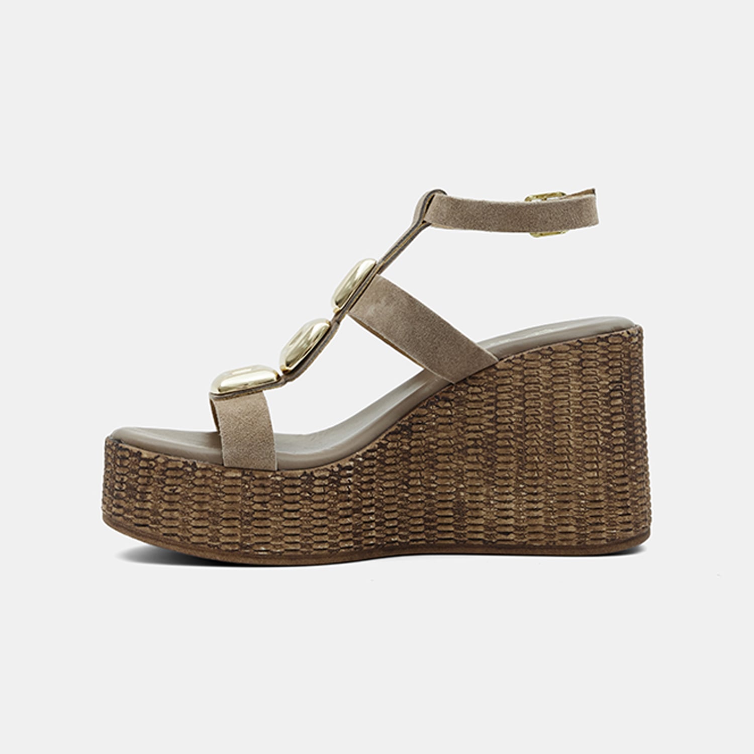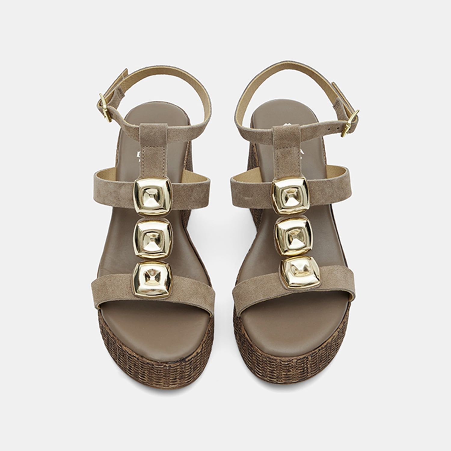 Kadın Koyu Bej Gold Aksesuarlı Dolgu Topuklu Süet Sandalet