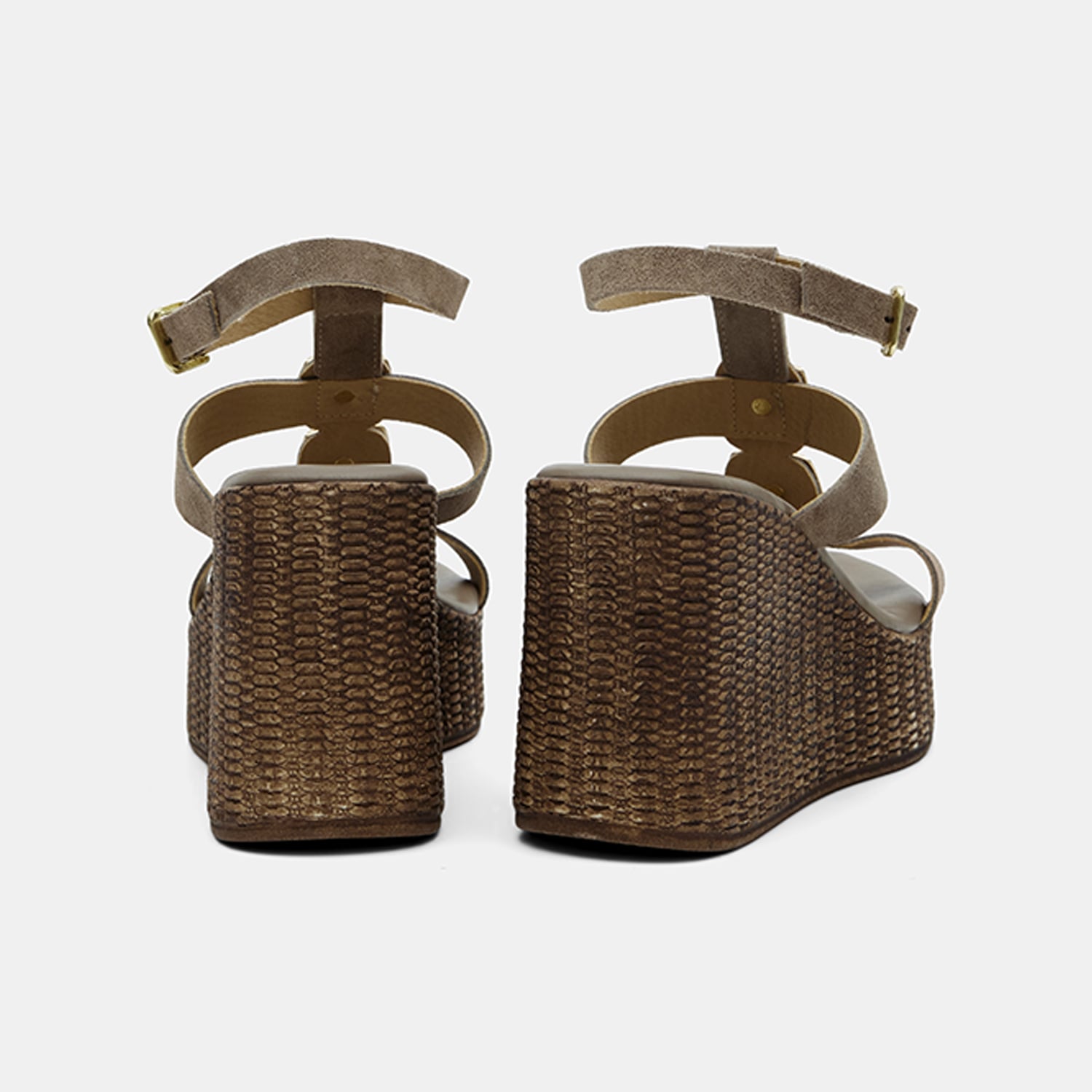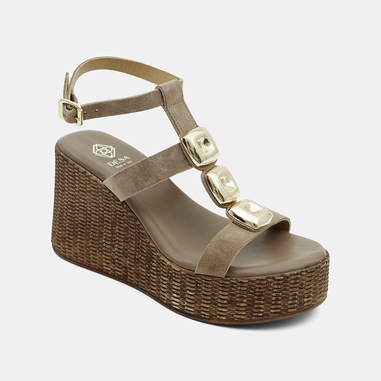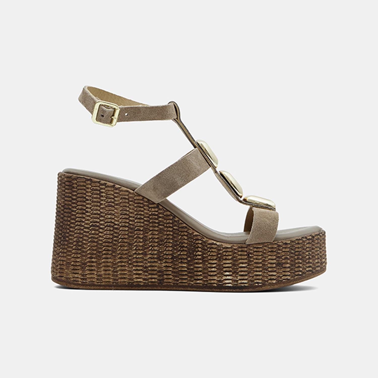 Kadın Koyu Bej Gold Aksesuarlı Dolgu Topuklu Süet Sandalet