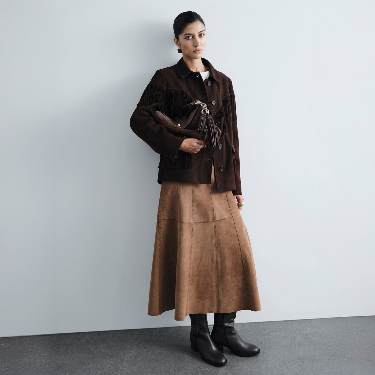 Western esintileri taşıyan tasarımıyla öne çıkan kadın süet ceket.