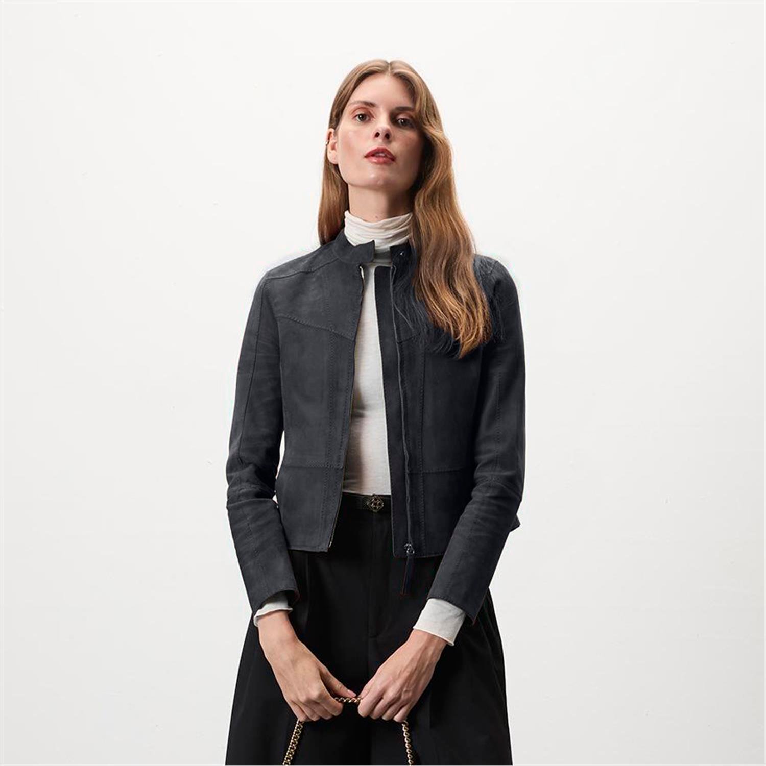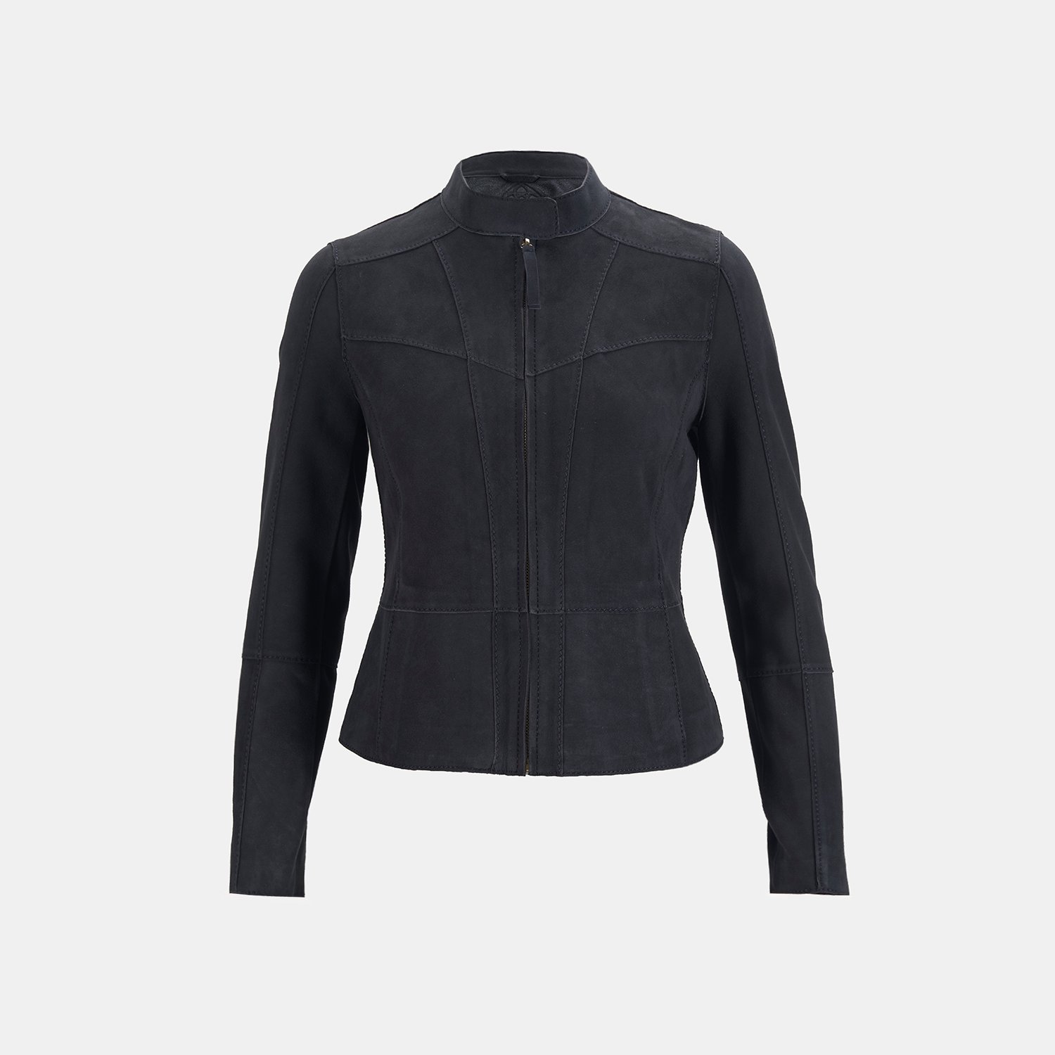 Kadın hafif hakim yakalı fit süet deri ceket.