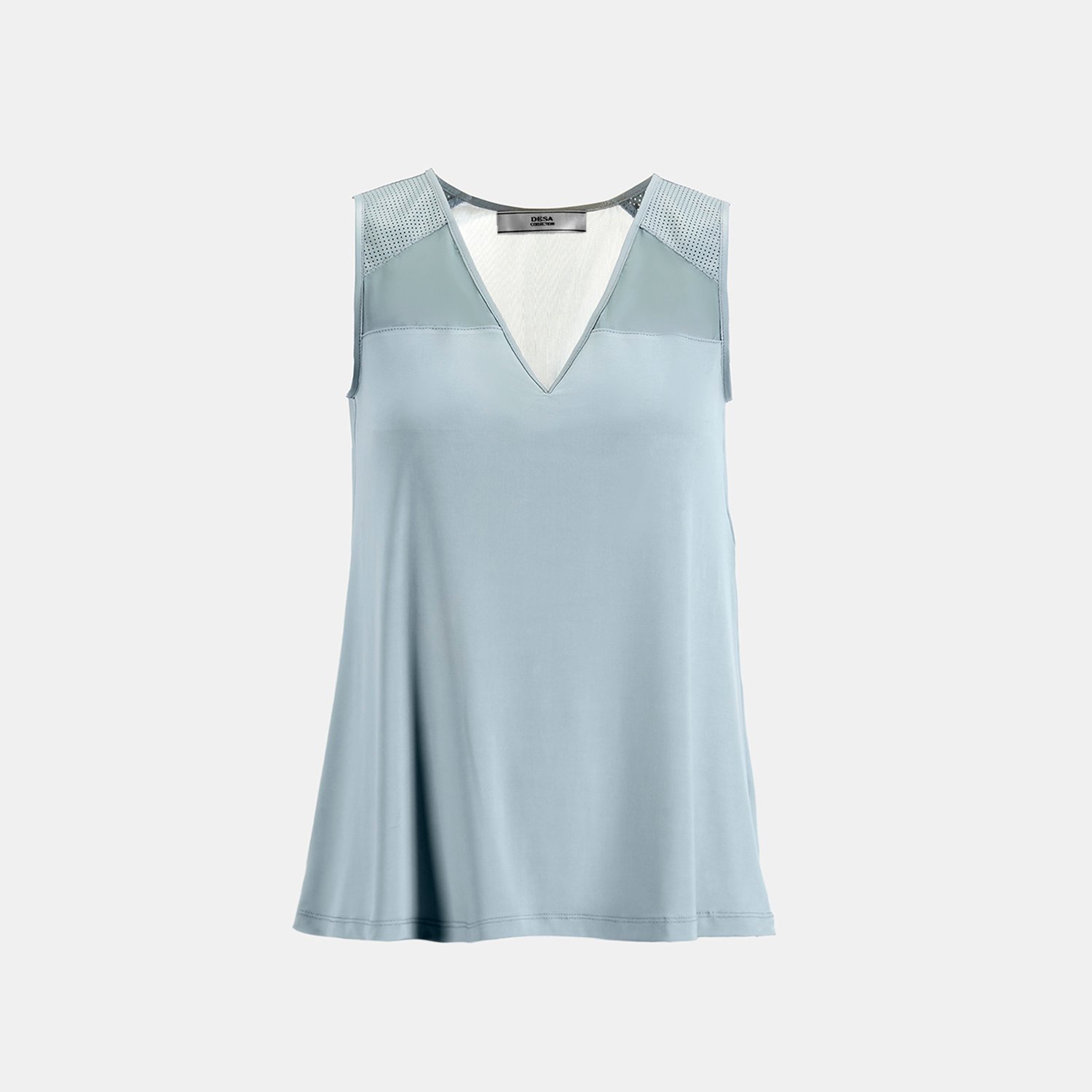 Kadın V yakalı tül ve perfore deri detaylı kadın kumaş bluz, kapamasızdır.