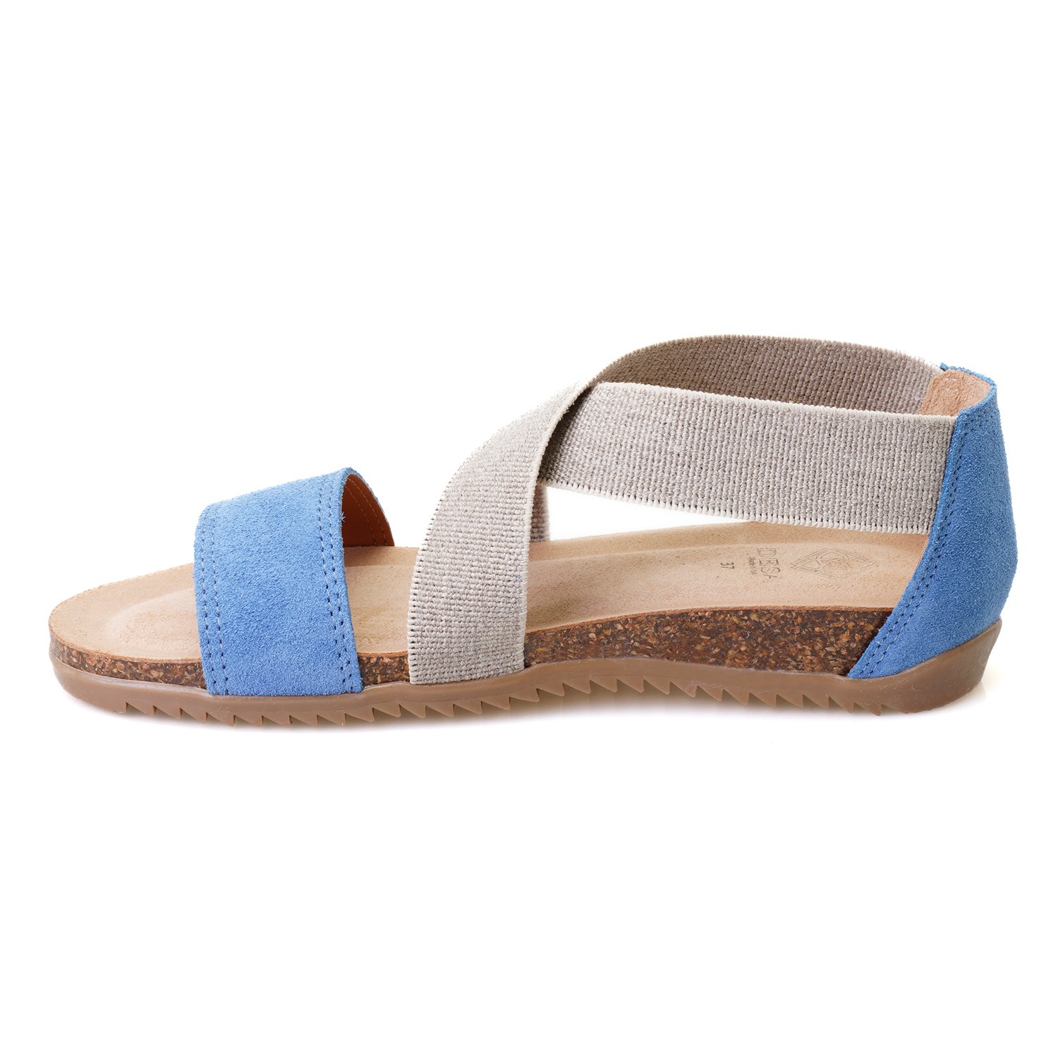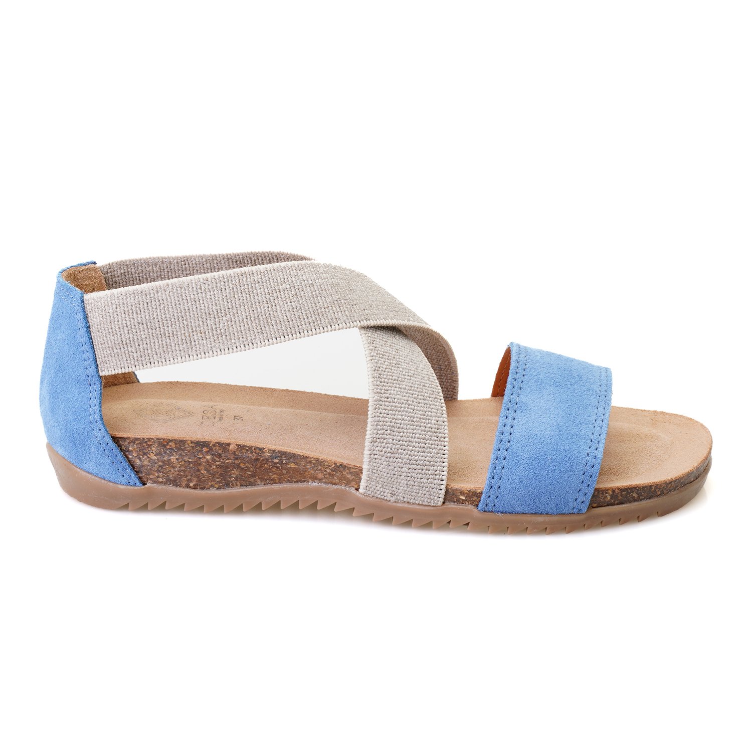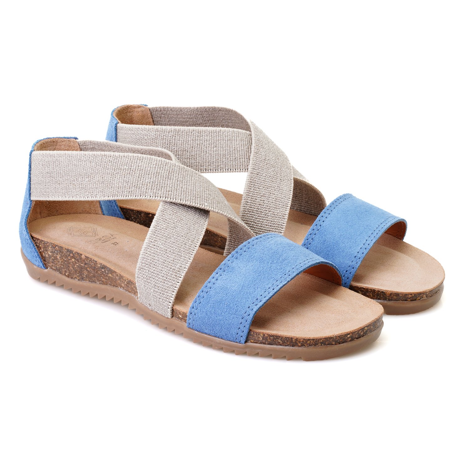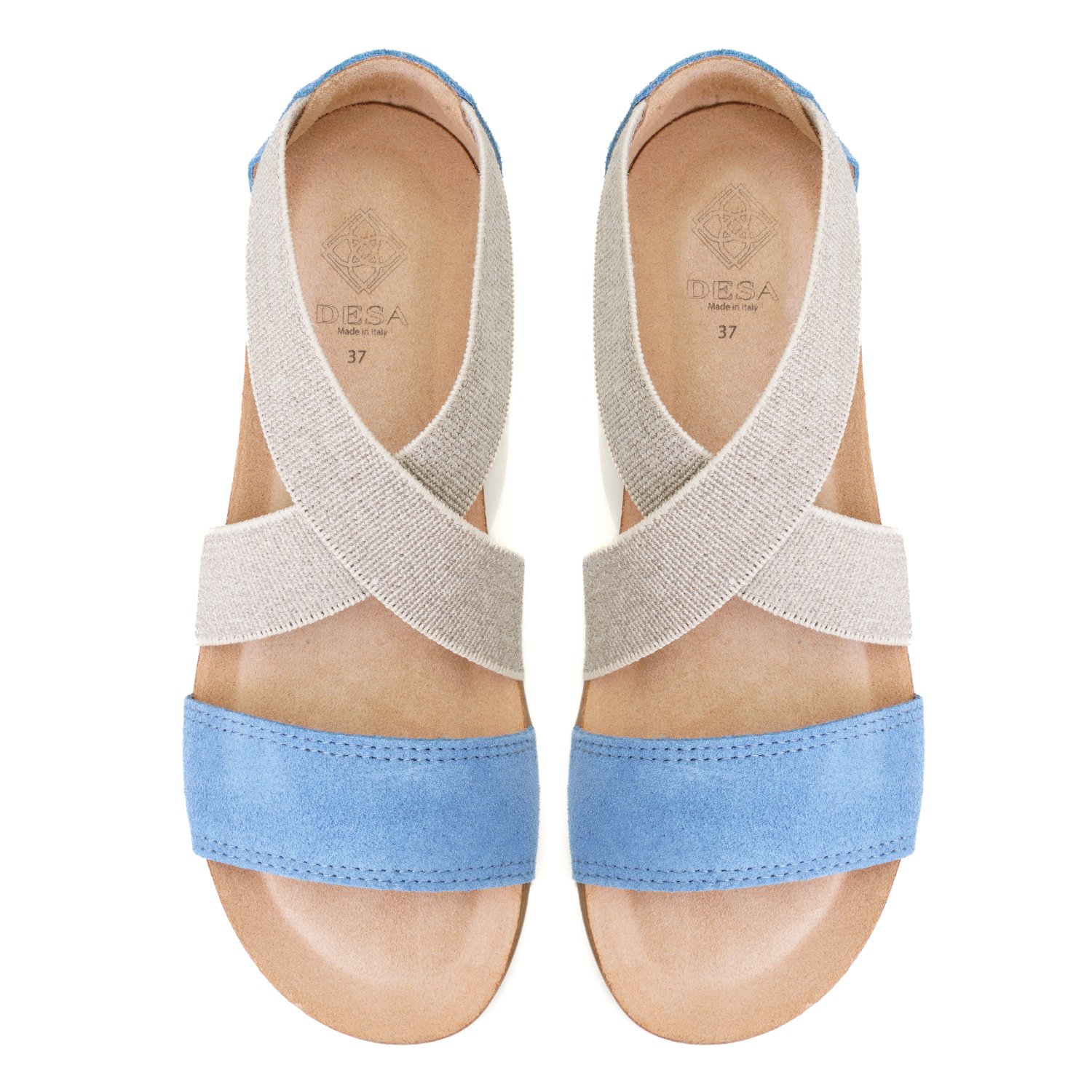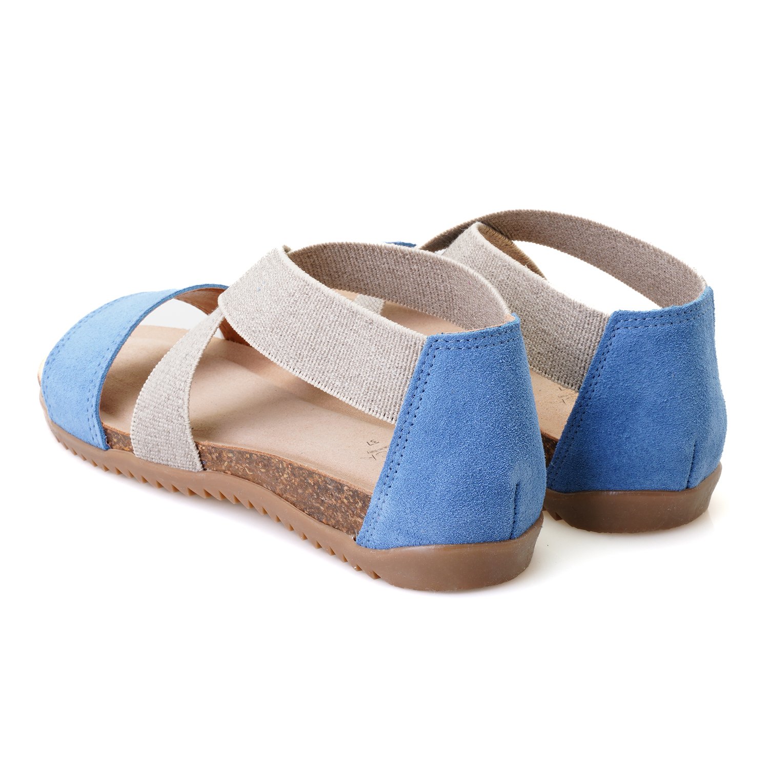 %40 süet deri, %60 lastik, deri iç astarlı, deri iç tabanlı, mantar tabanlı, kadın sandalet. Taban yüksekliği 2.5 cm.