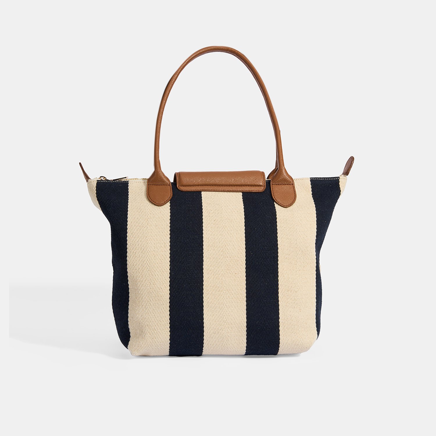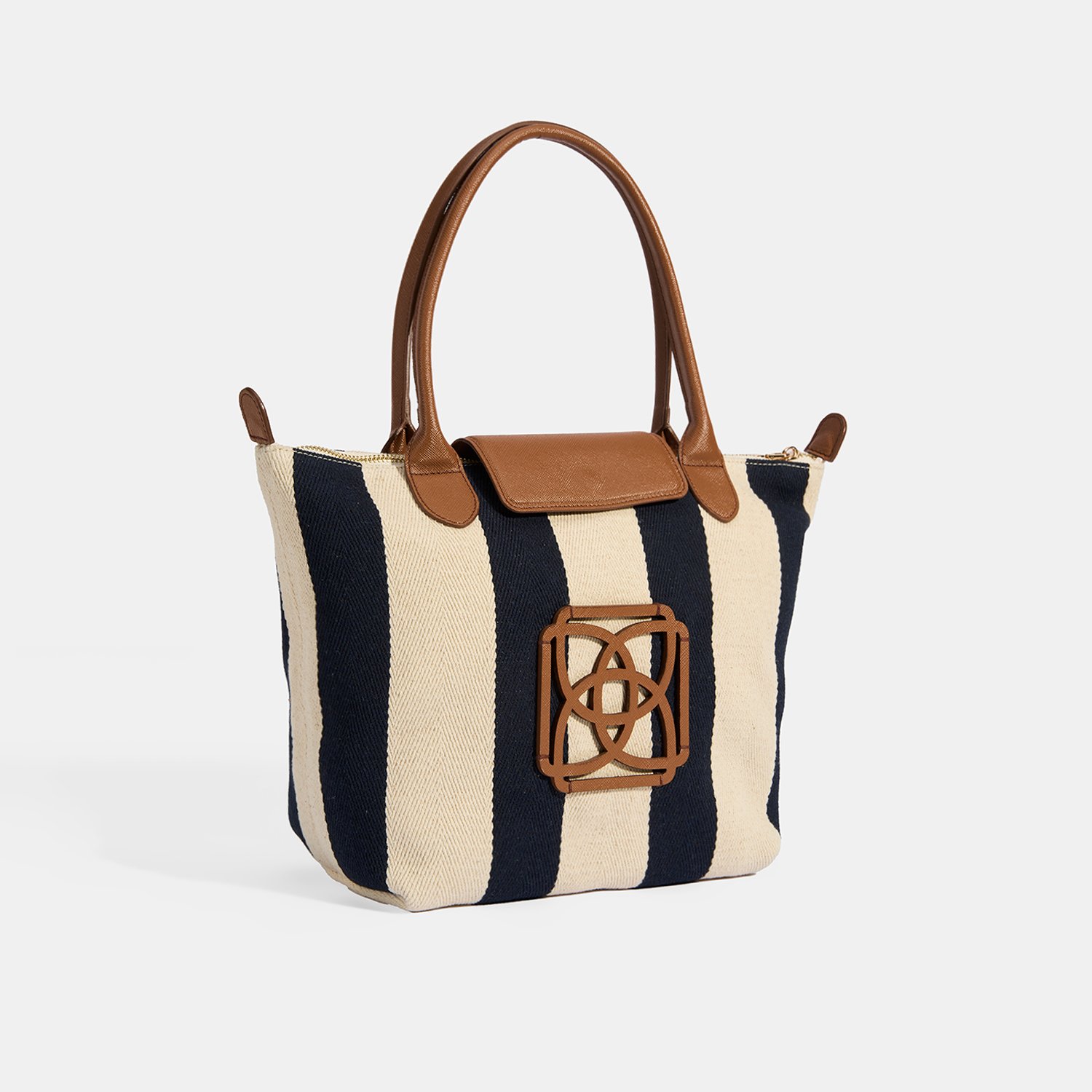 Kadın Monogram Logolu Lacivert Çizgili Kumaş Midi Omuz Çantası
