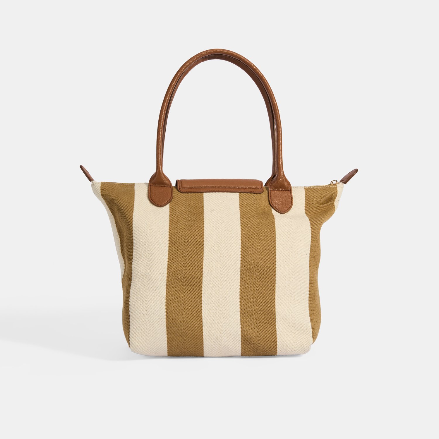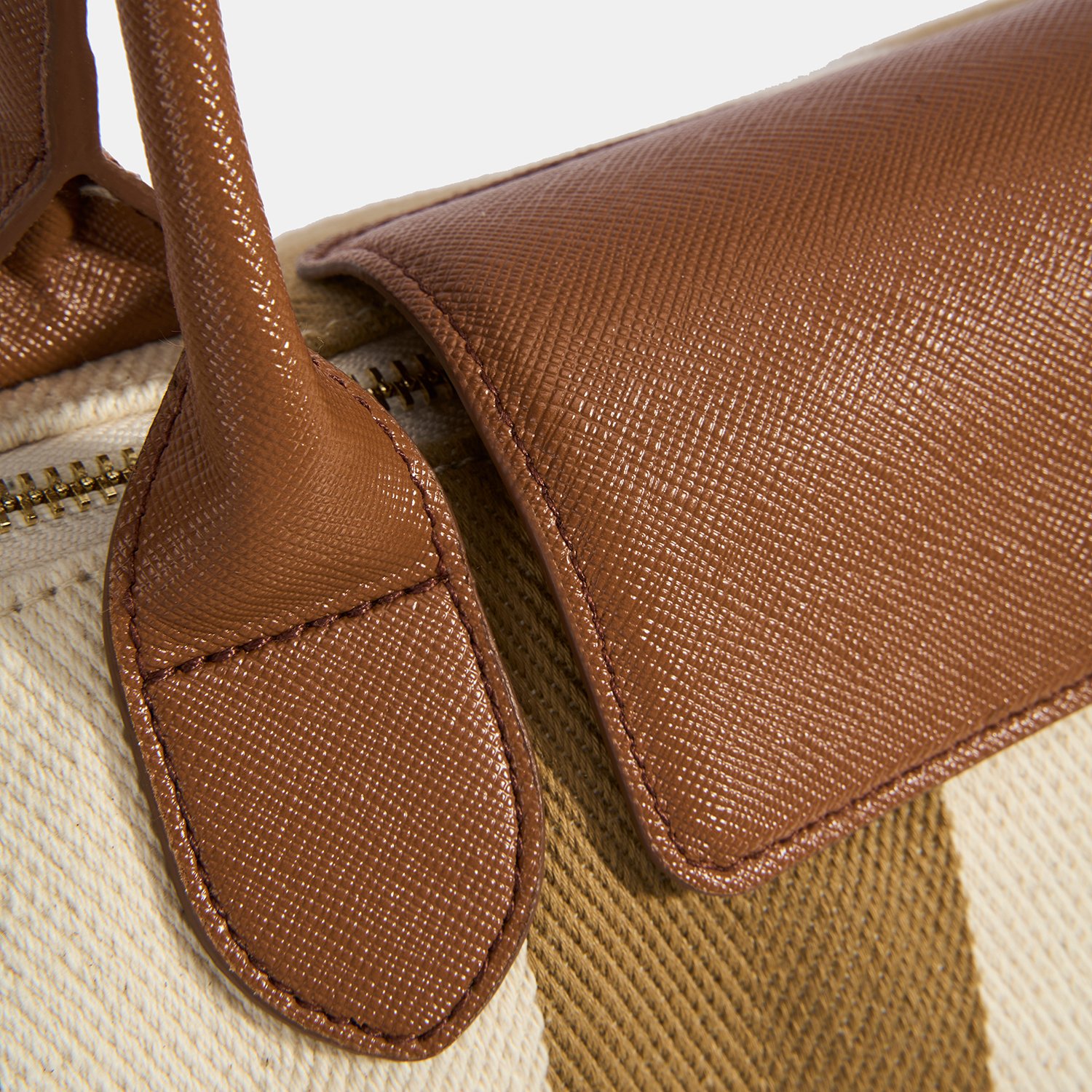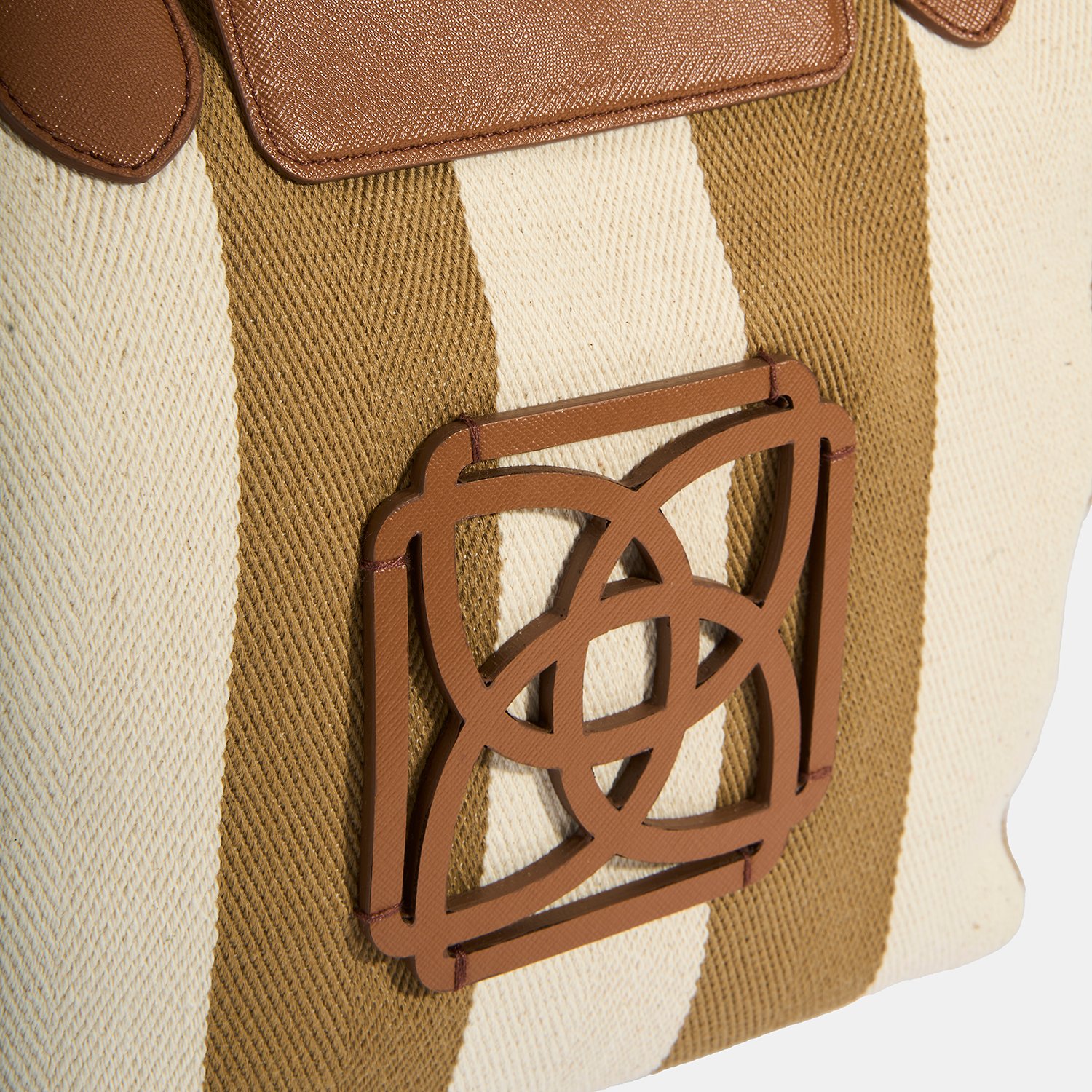 Vizon çizgili kumaştan üretilen omuz çantası, taba renginde kapak ve askı ile tamamlanmıştır.