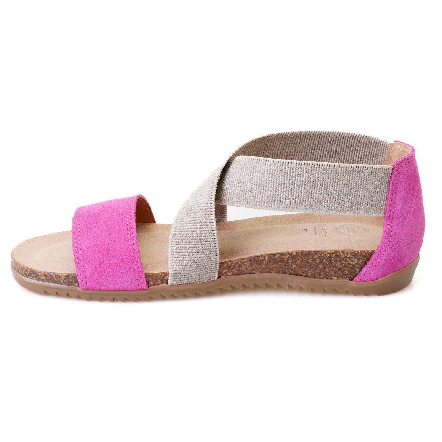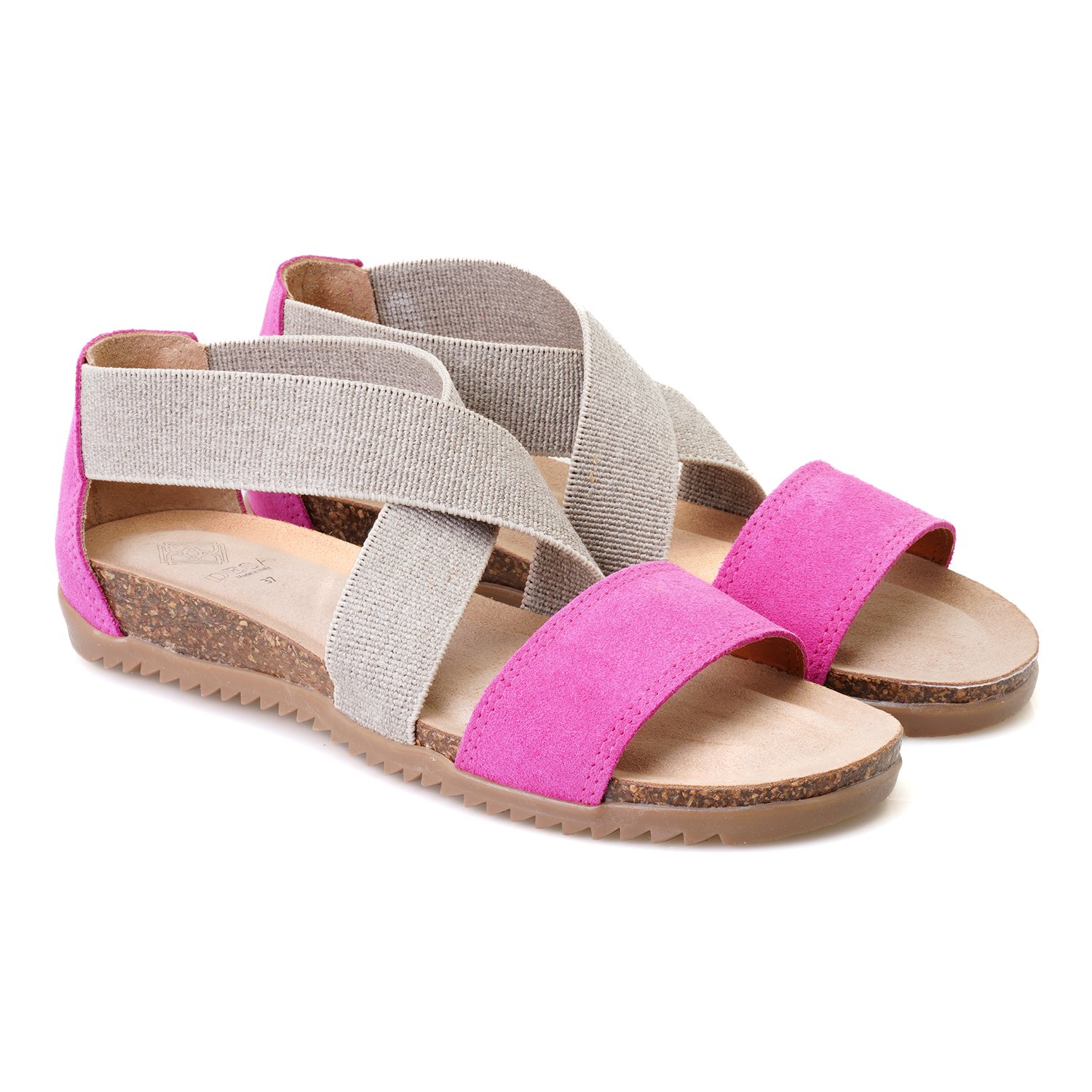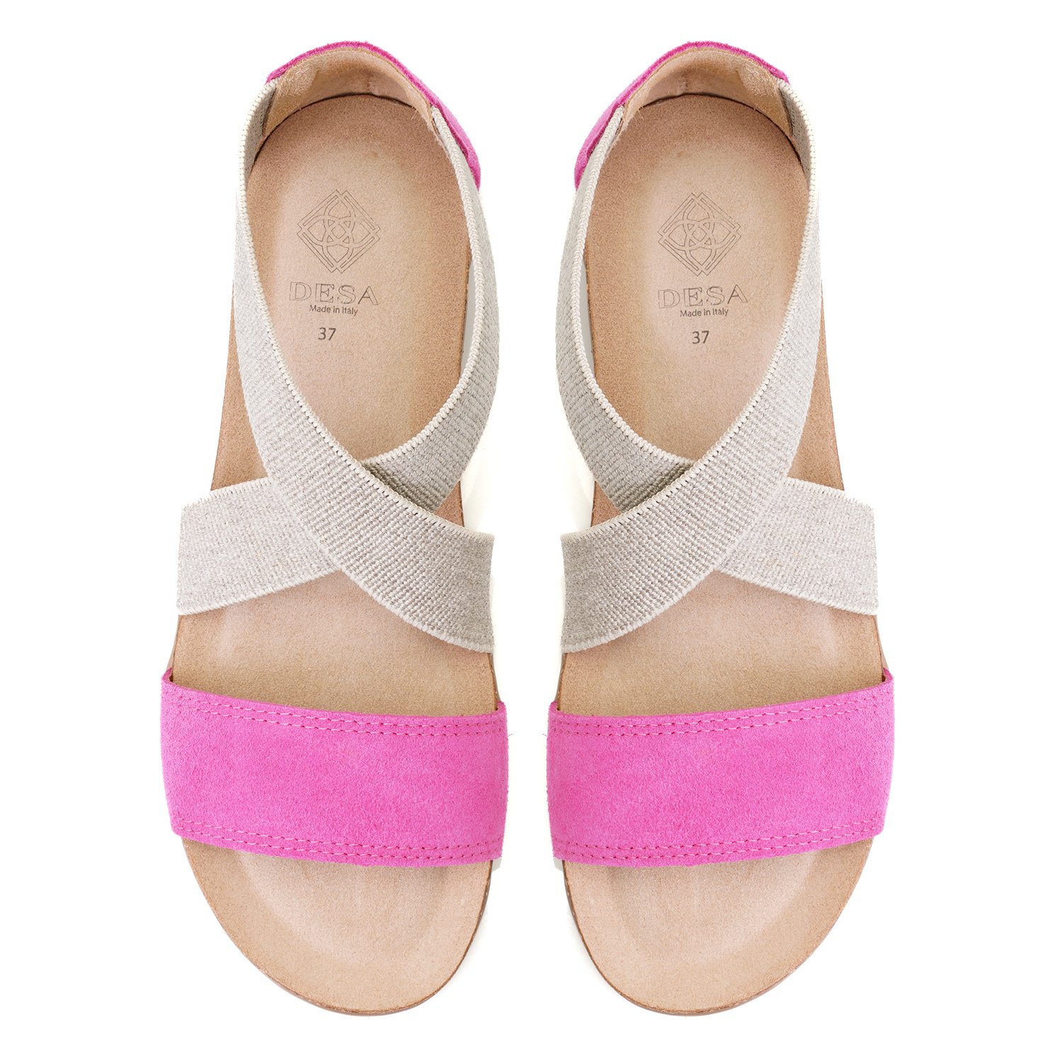 %40 süet deri, %60 lastik, deri iç astarlı, deri iç tabanlı, mantar tabanlı, kadın sandalet. Taban yüksekliği 2.5 cm.