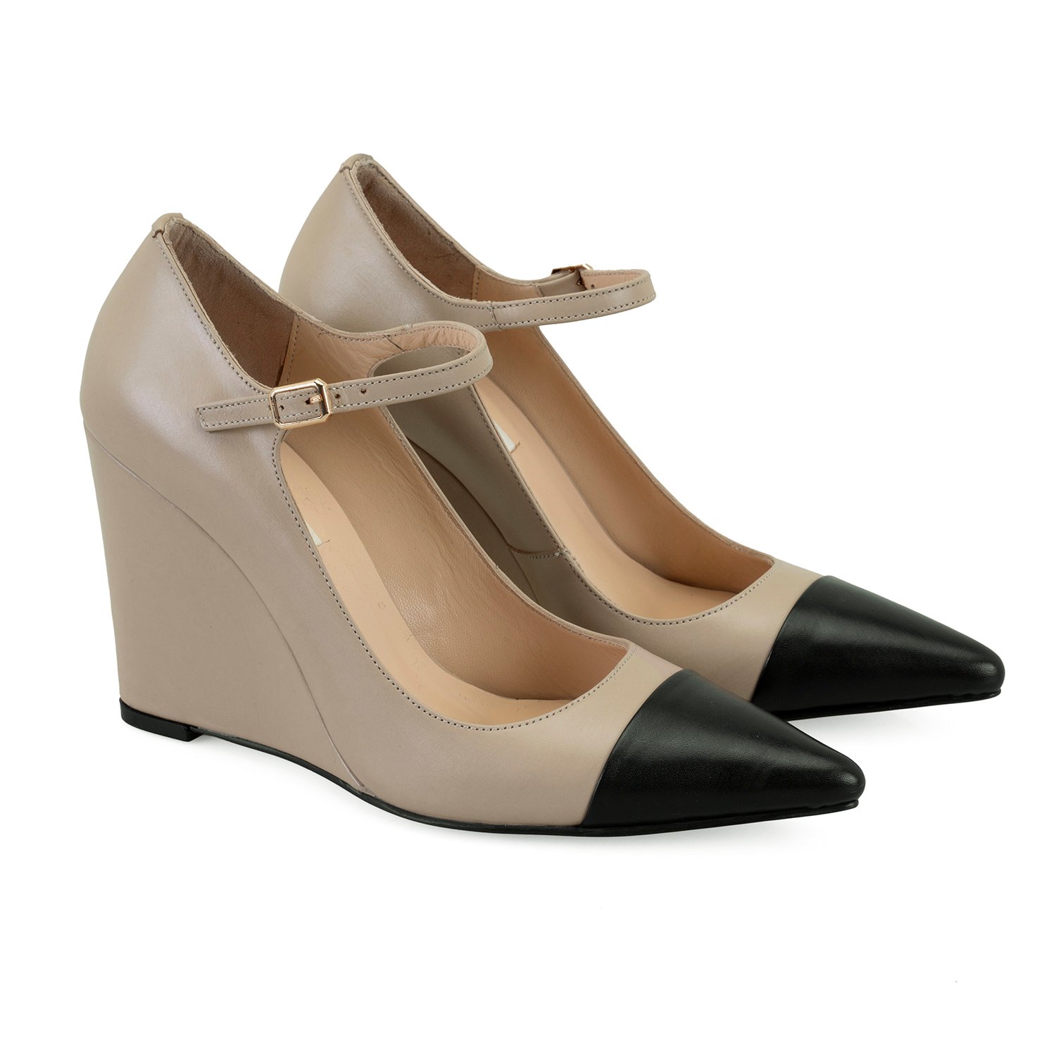 %100 deri, deri iç tabanlı, deri astarlı, ayarlanabilir metal tokalı, neolit tabanlı, dolgu topuklu kadın mary jane ayakkabı.