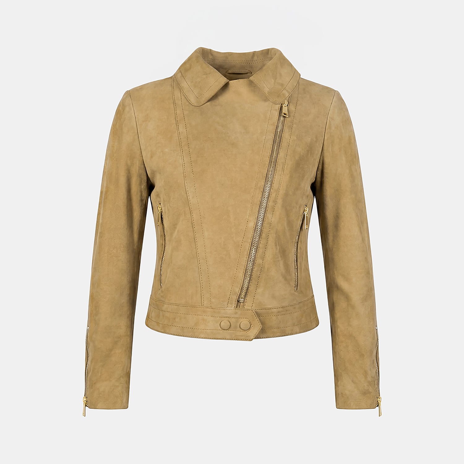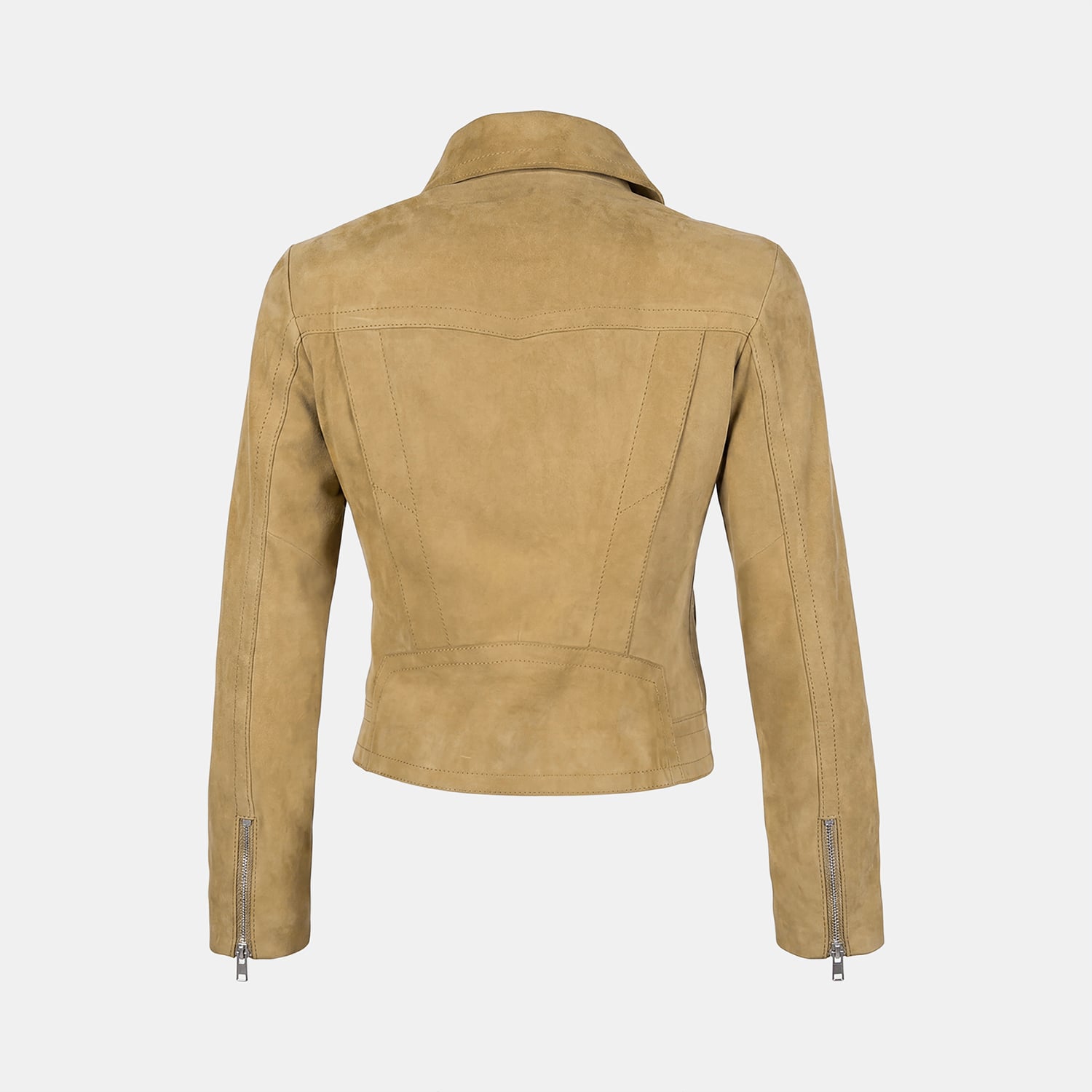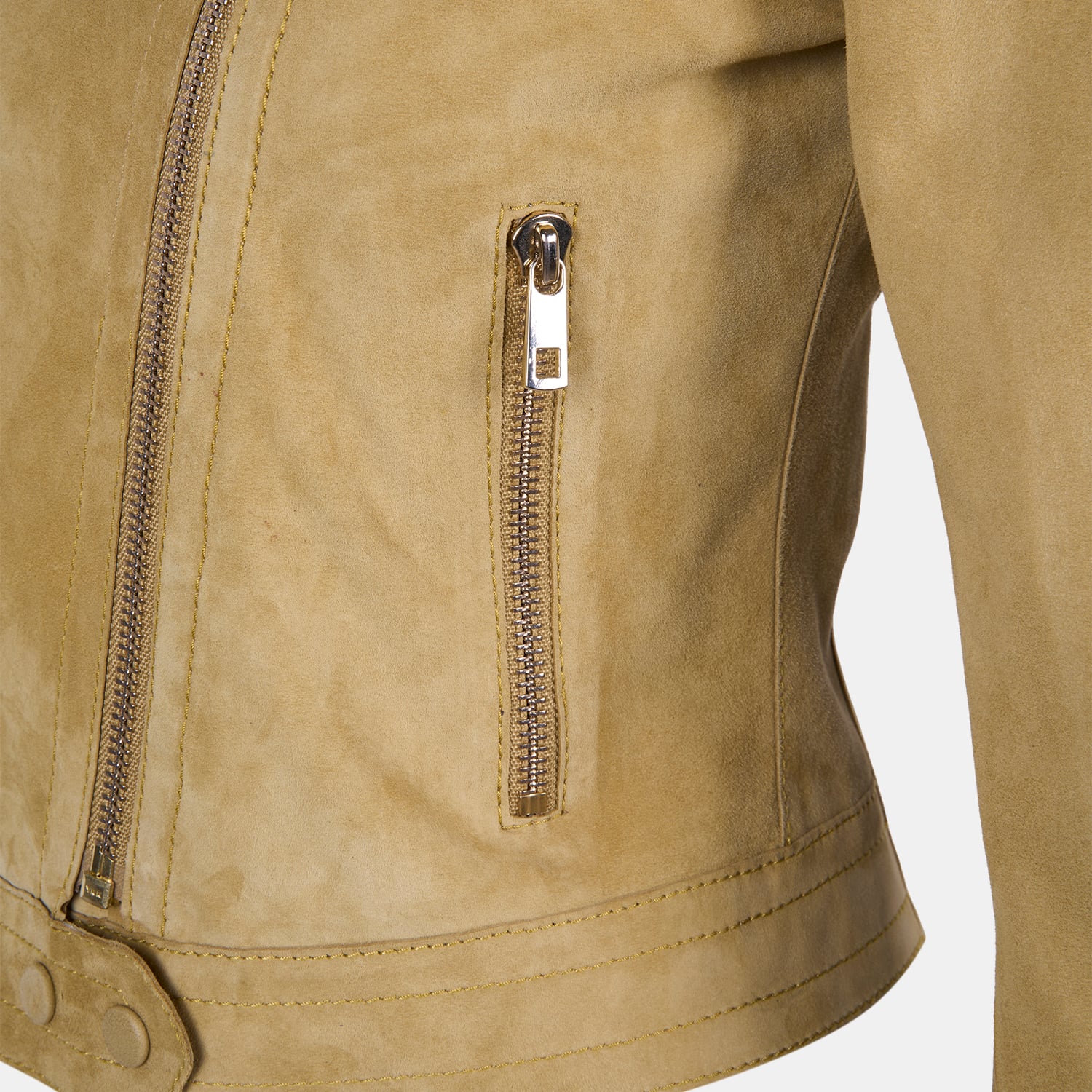 Önde yer alan fermuarlı cepler ve kollardaki fermuar detayları, süet biker ceket tasarımını hem işlevsel hem estetik hale getirir.
