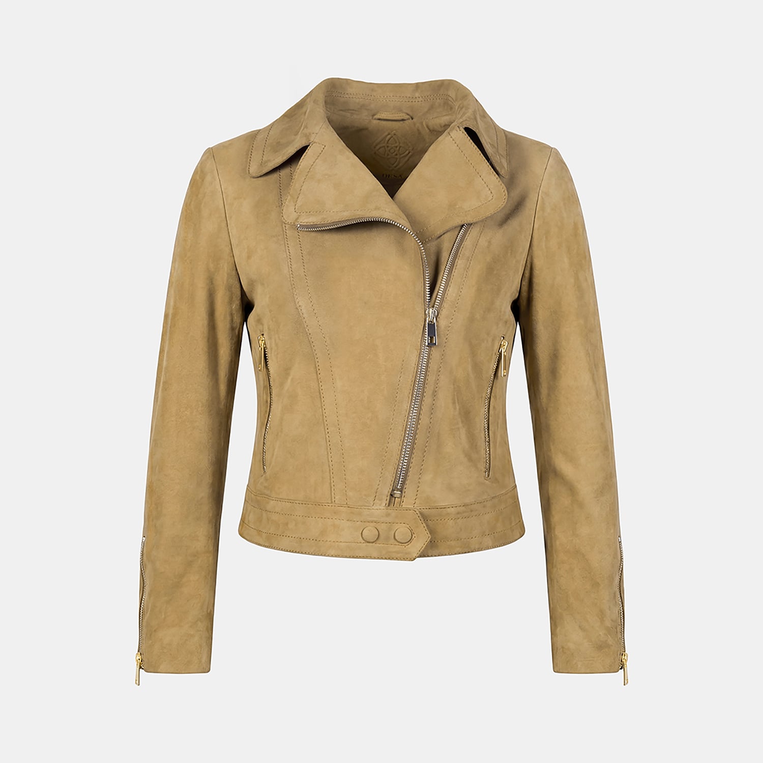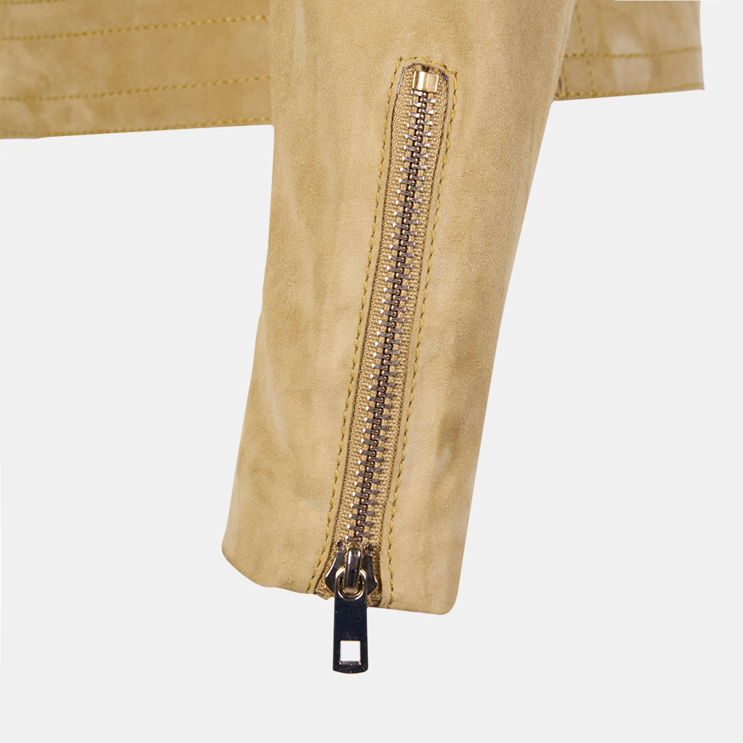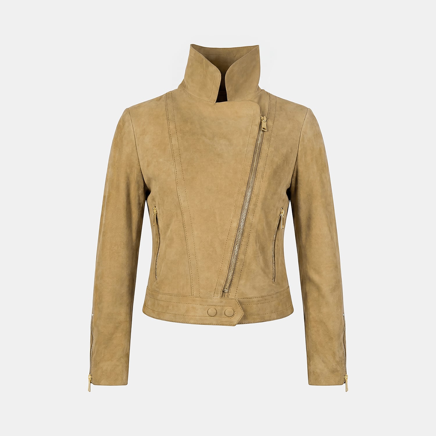 Önde yer alan fermuarlı cepler ve kollardaki fermuar detayları, süet biker ceket tasarımını hem işlevsel hem estetik hale getirir.