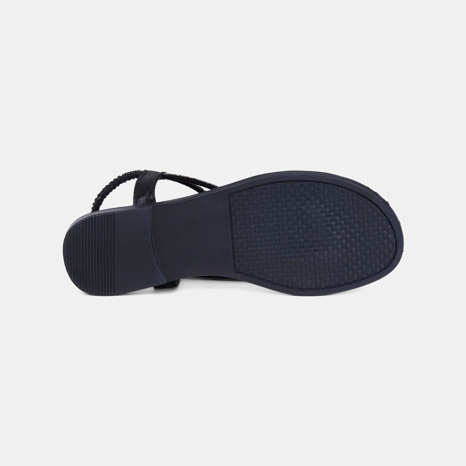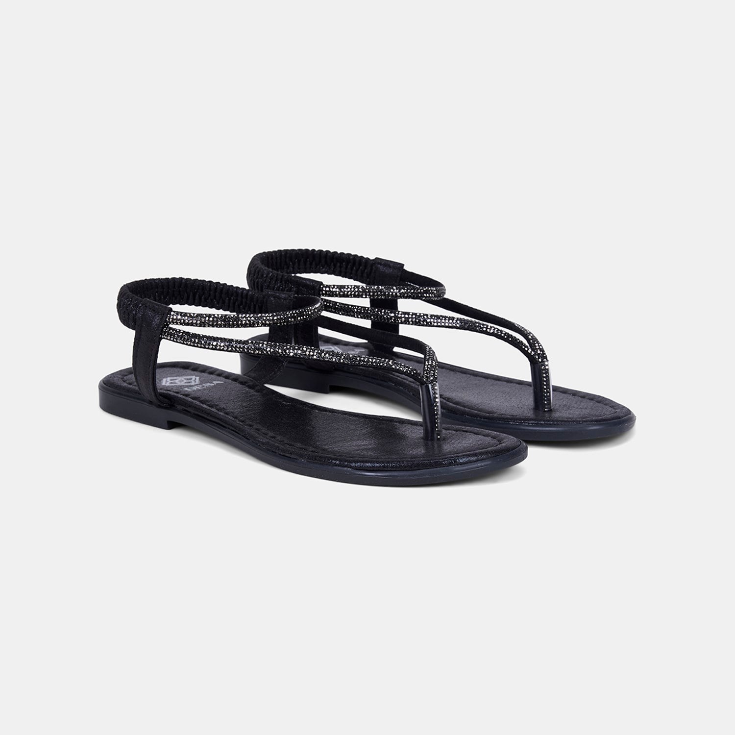 Parmak arası kadın sandalet, taş detayları ve arkadan lastikli yapısıyla yaz stiline hem ışıltı hem de pratiklik kazandıran modern bir tasarıma sahiptir.