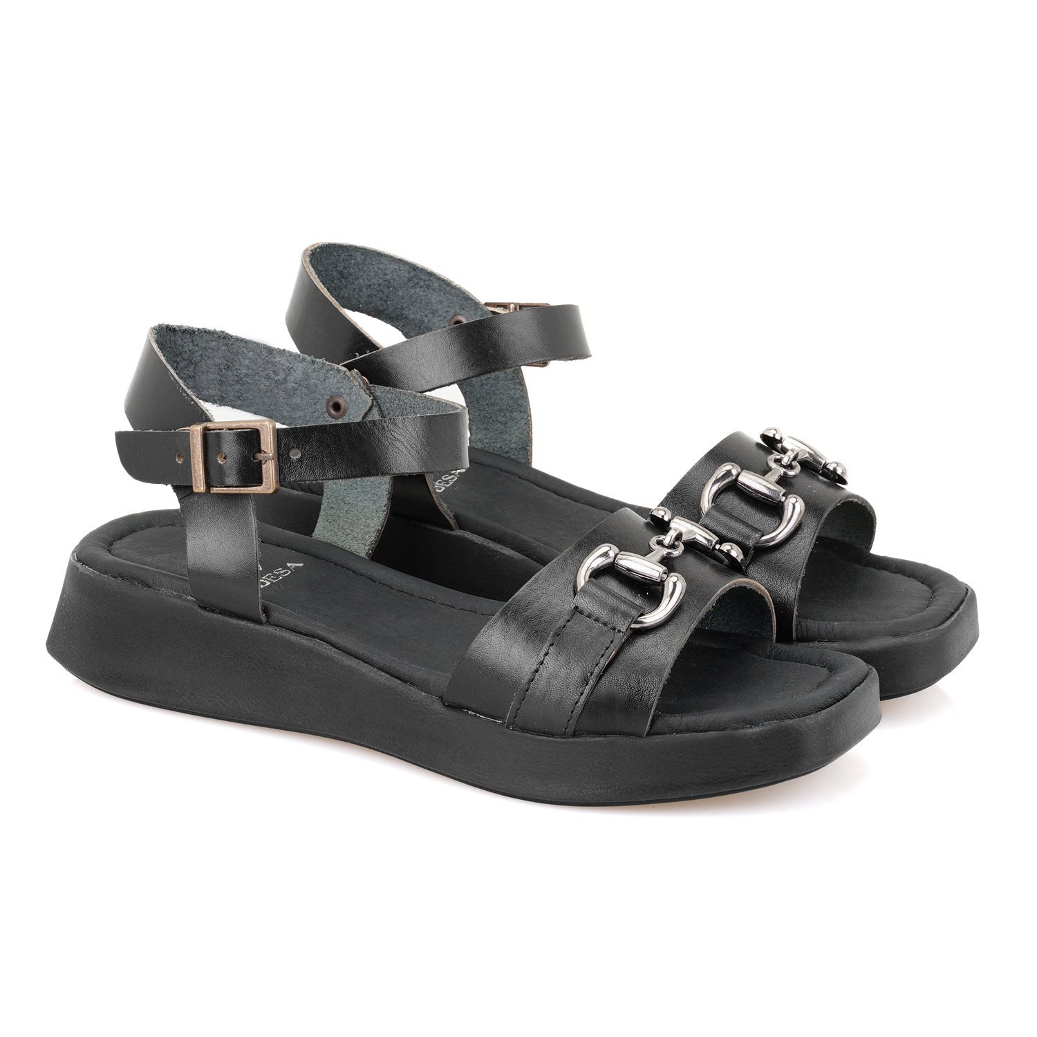 Kadın Siyah Ayarlanabilir Tokalı Deri Sandalet