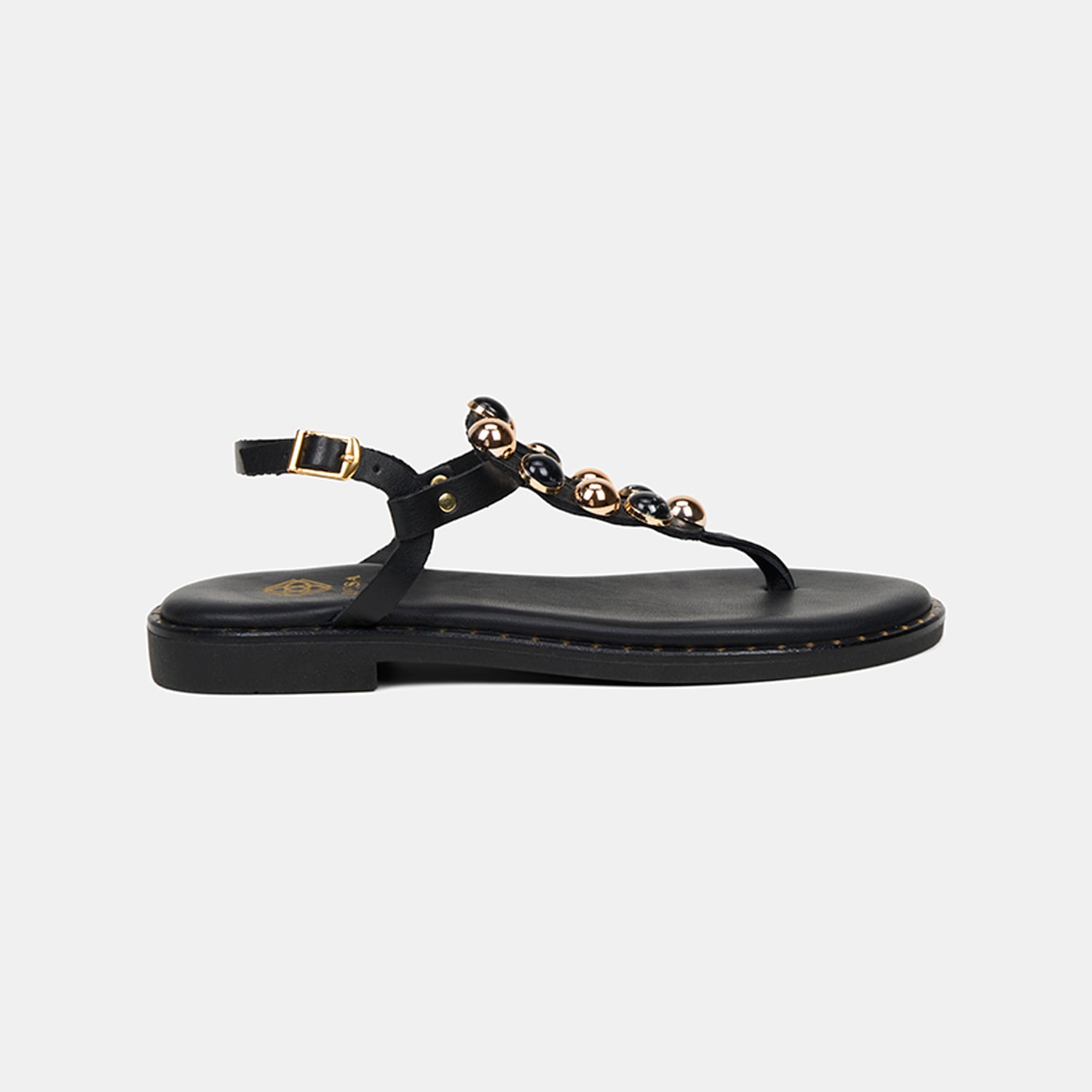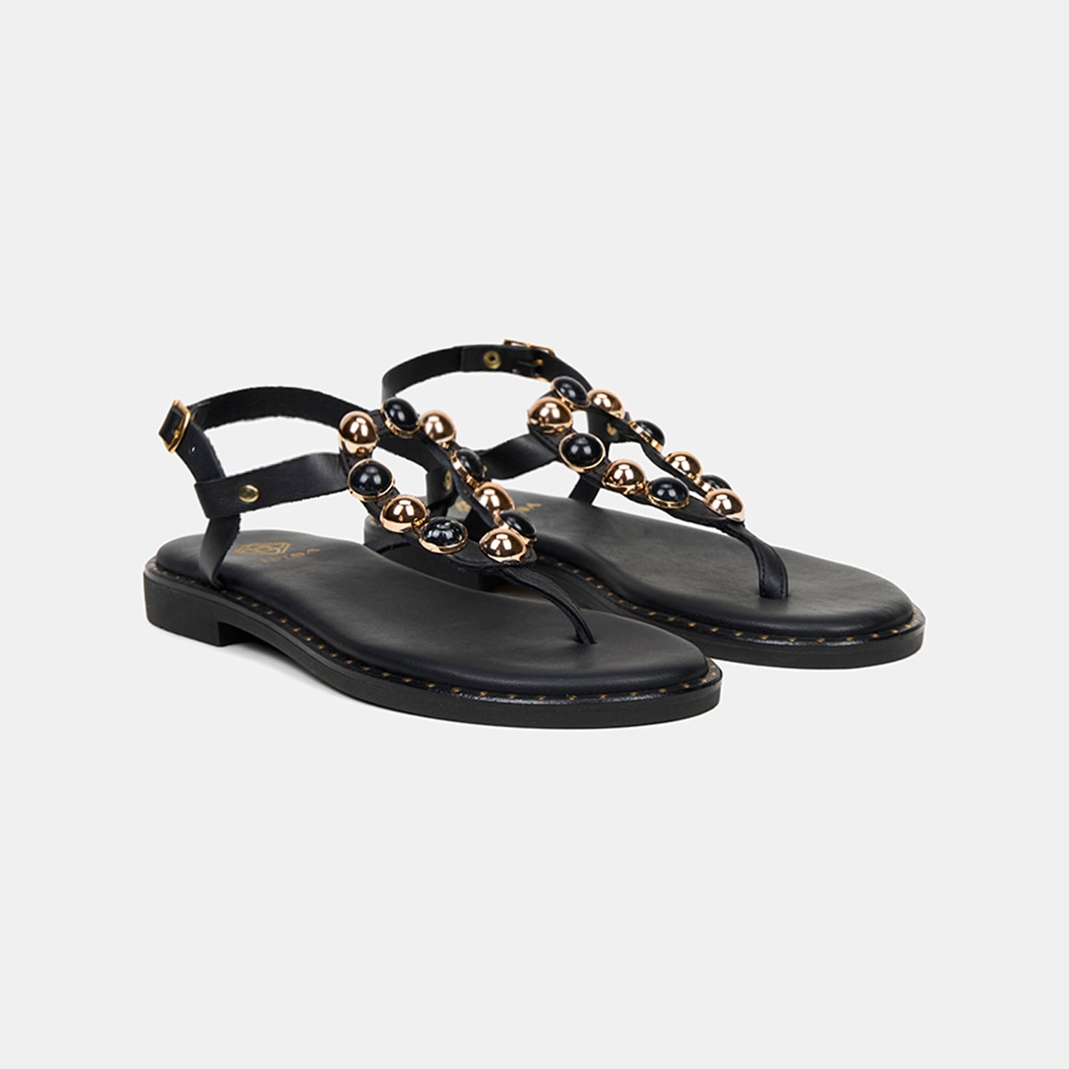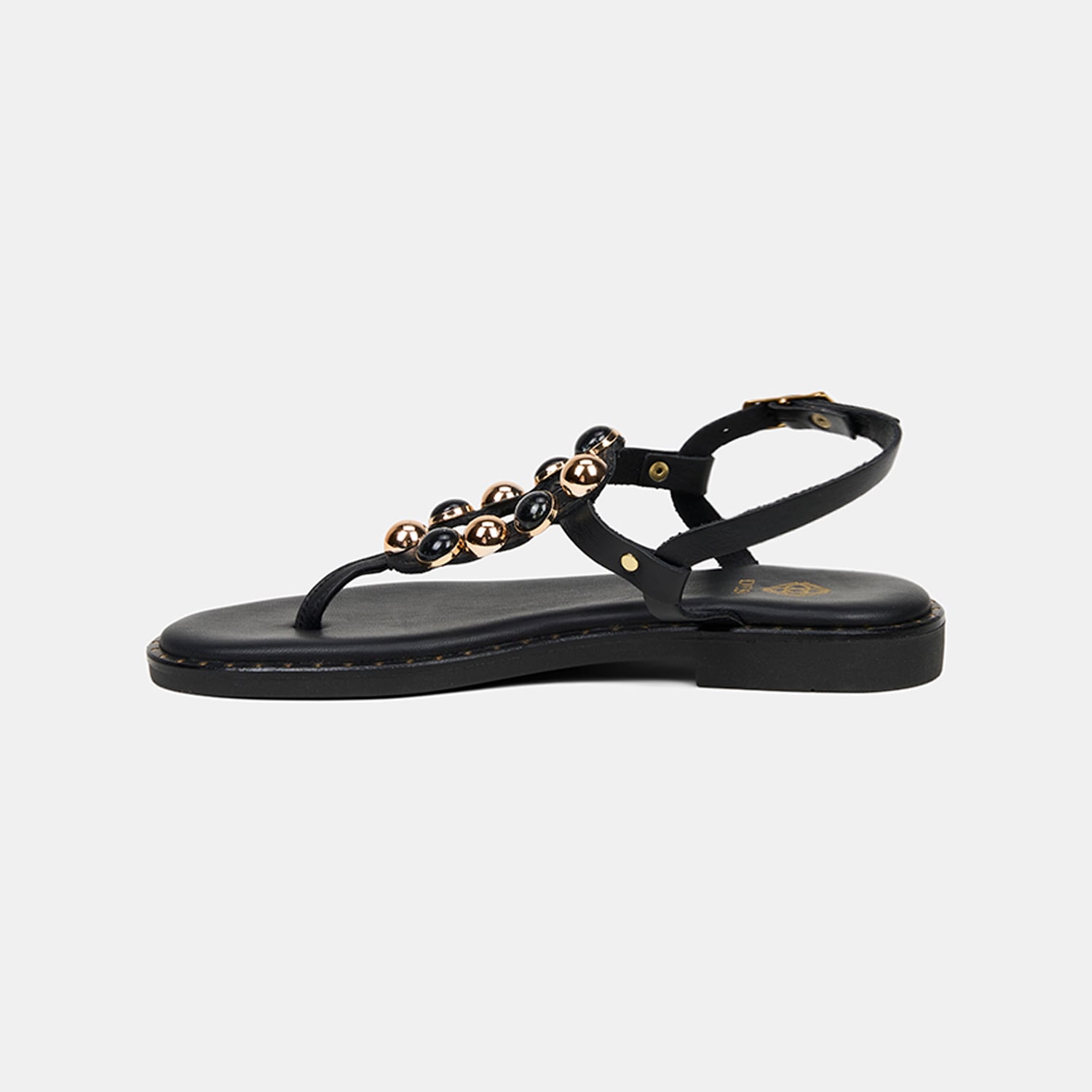Kadın Siyah Boncuk Aksesuarlı Parmak Arası Deri Sandalet