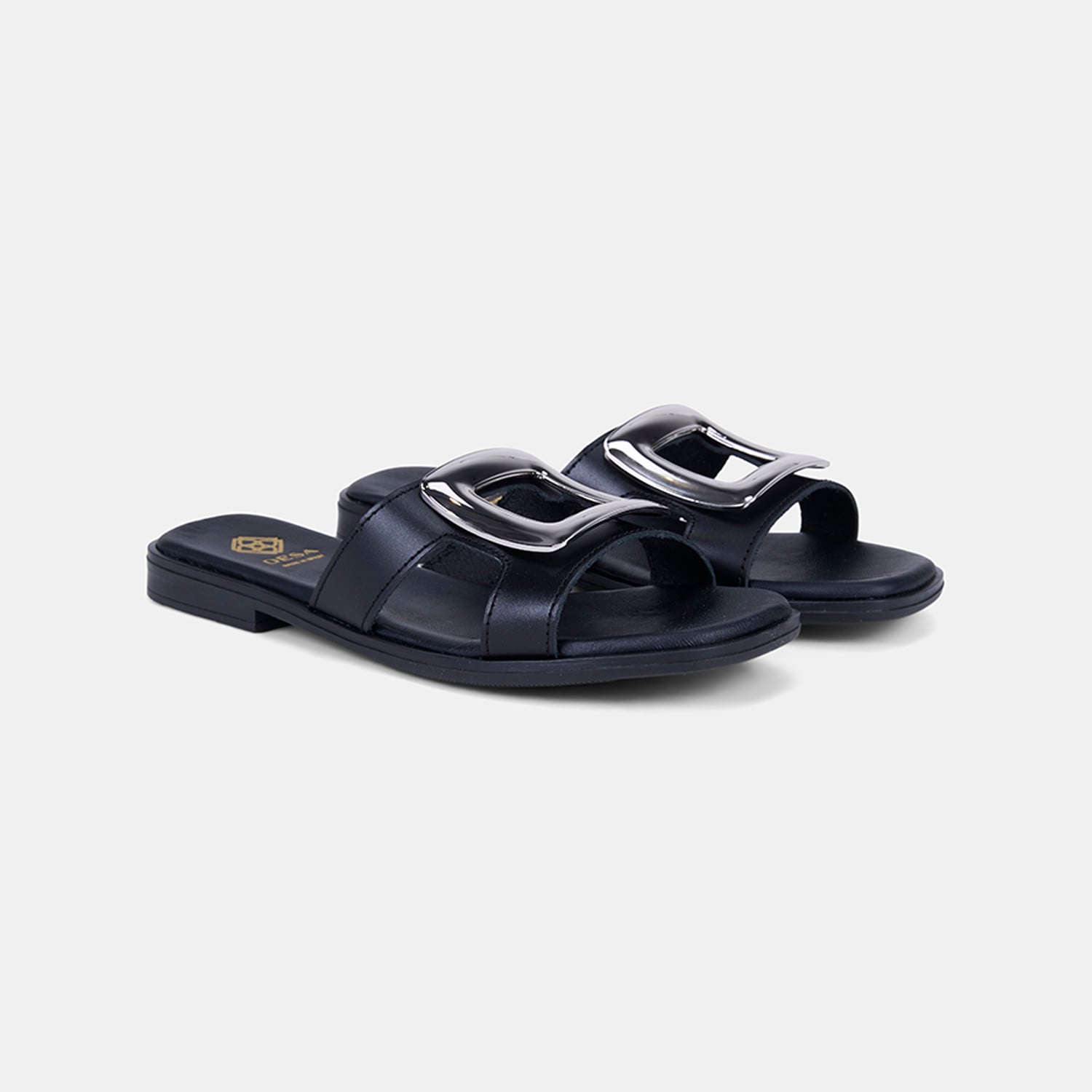 Kadın deri terlik, sade formunu öne çıkaran gold metal aksesuar detayıyla günlük şıklığa zarif bir dokunuş katar.