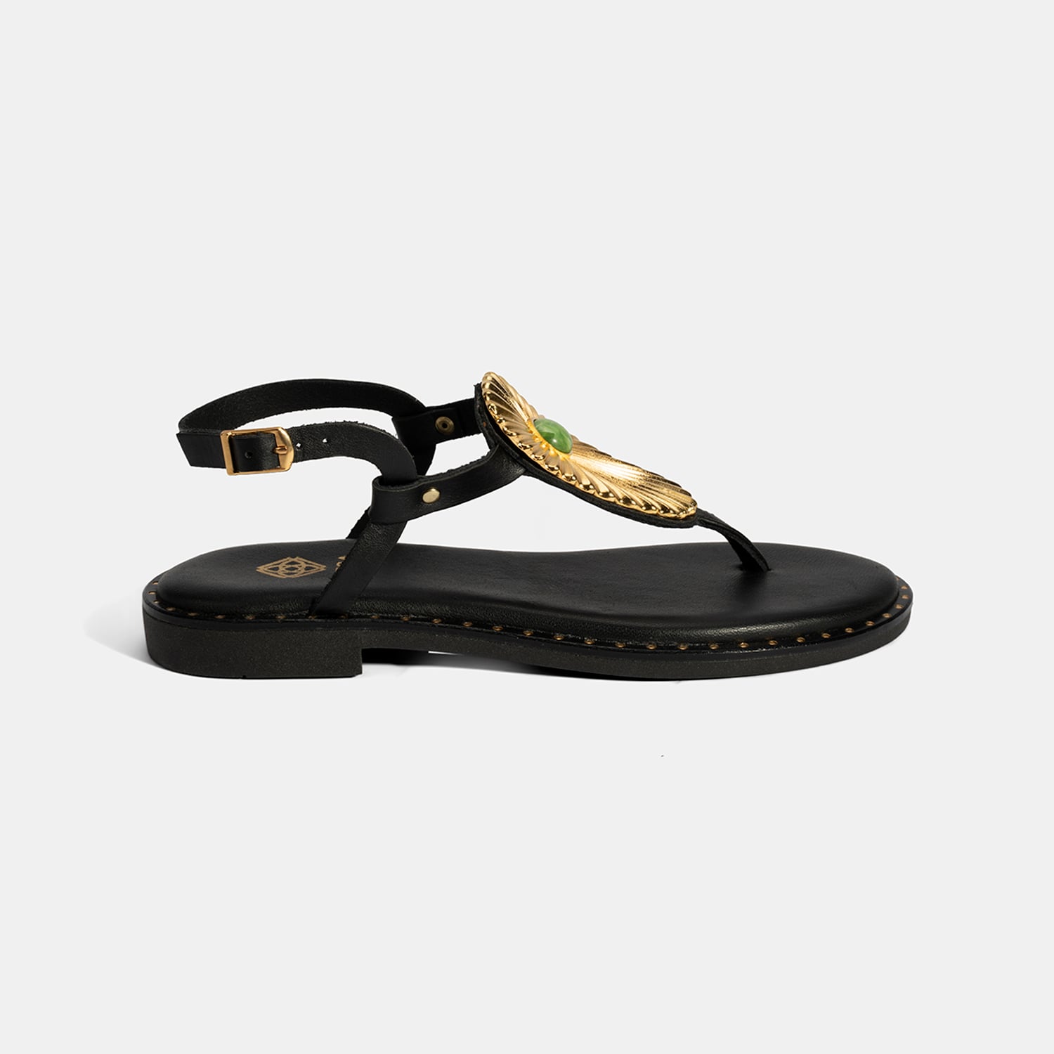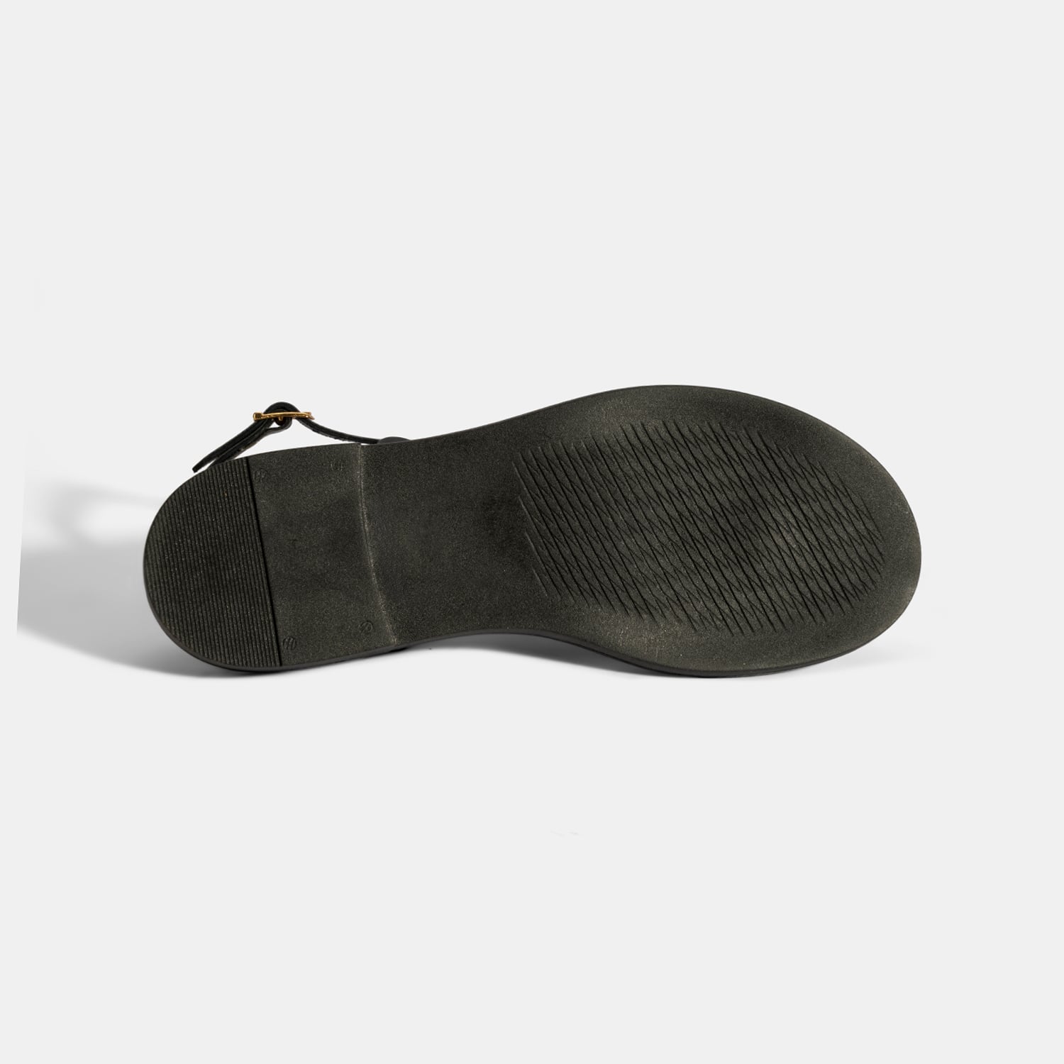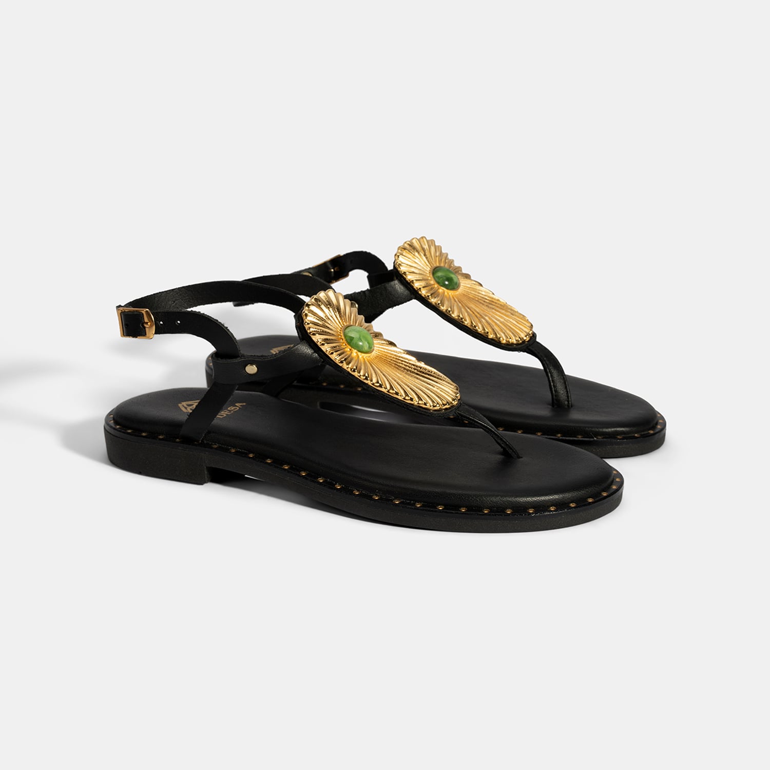 Kadın Siyah Büyük Gold Tokalı Parmak Arası Deri Sandalet