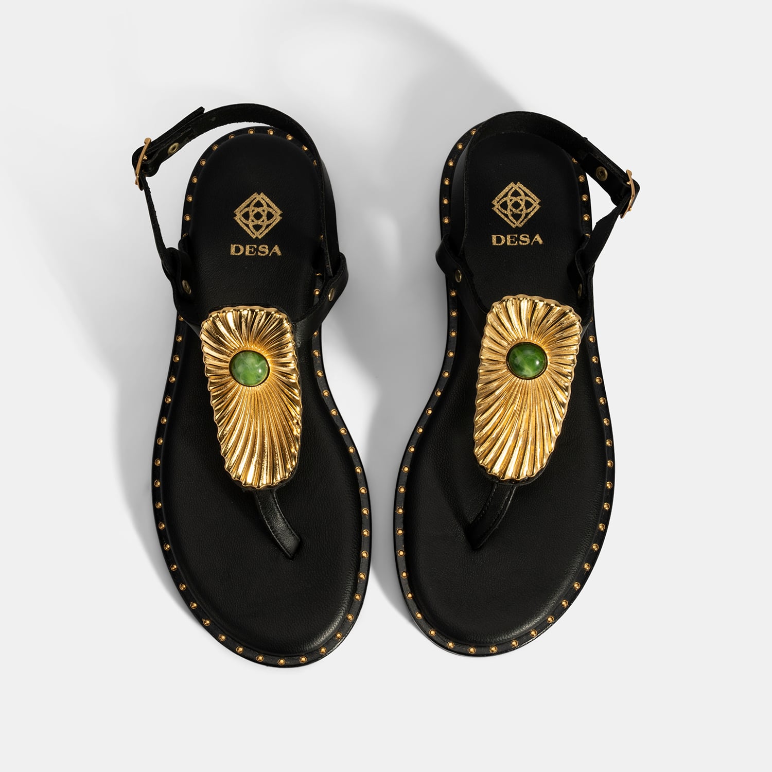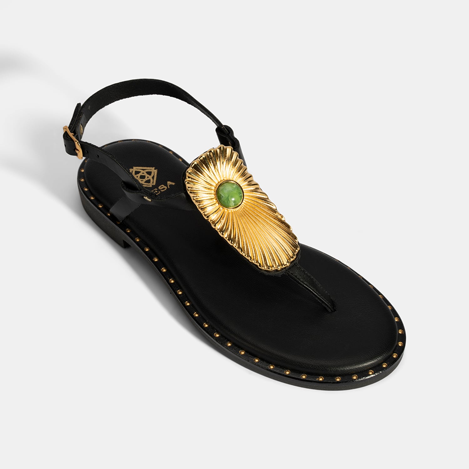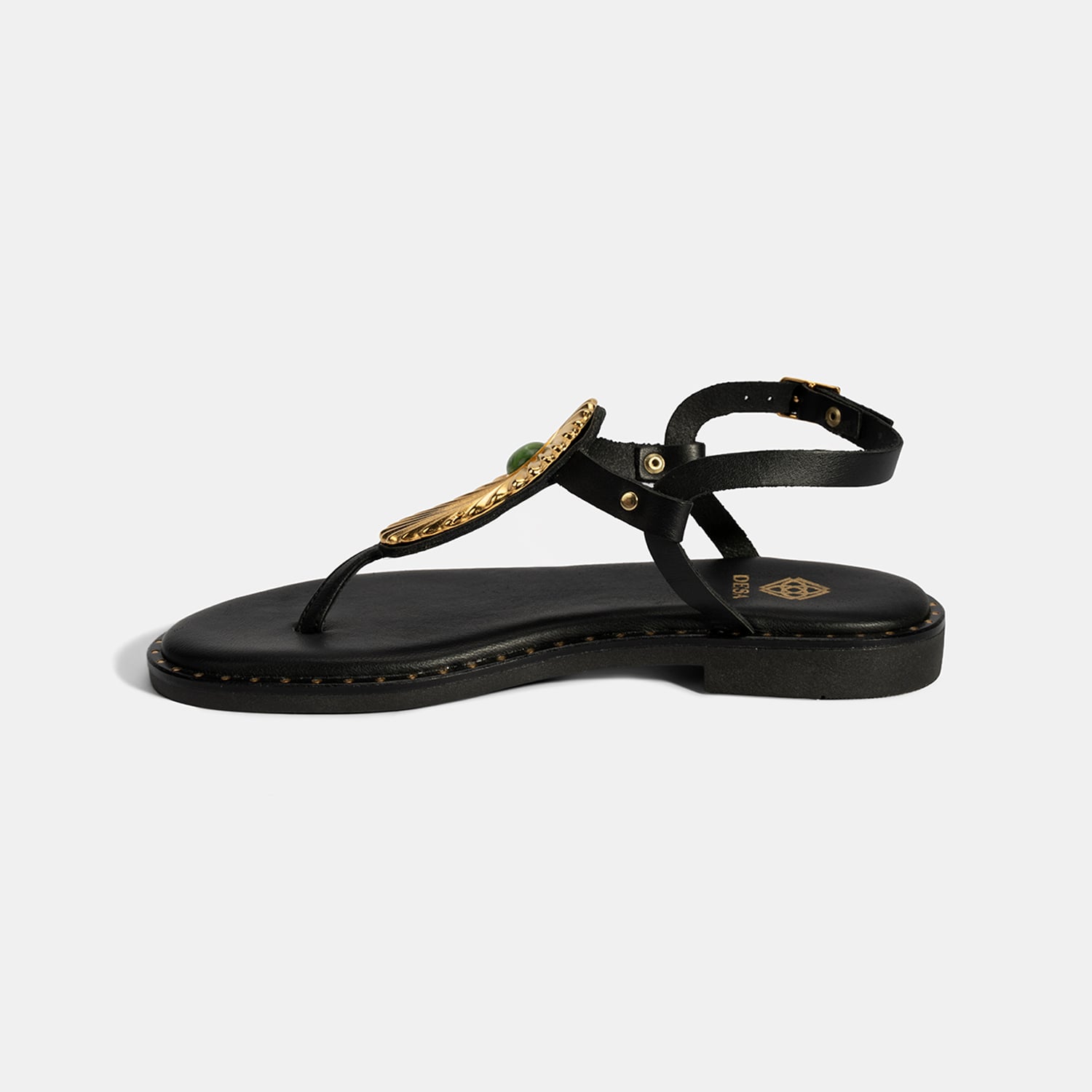 Kadın Siyah Büyük Gold Tokalı Parmak Arası Deri Sandalet