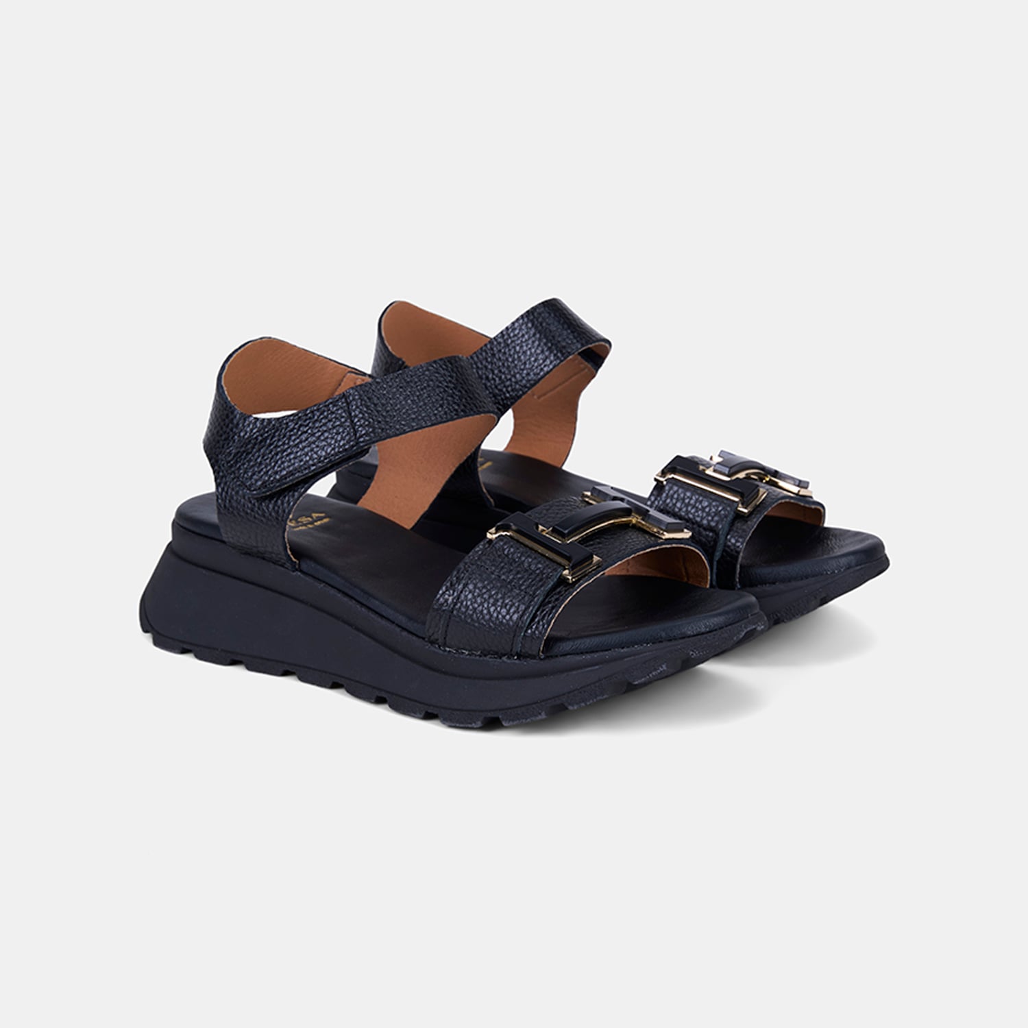 Kadın Siyah Cırt Cırtlı Dolgu Topuklu Deri Sandalet
