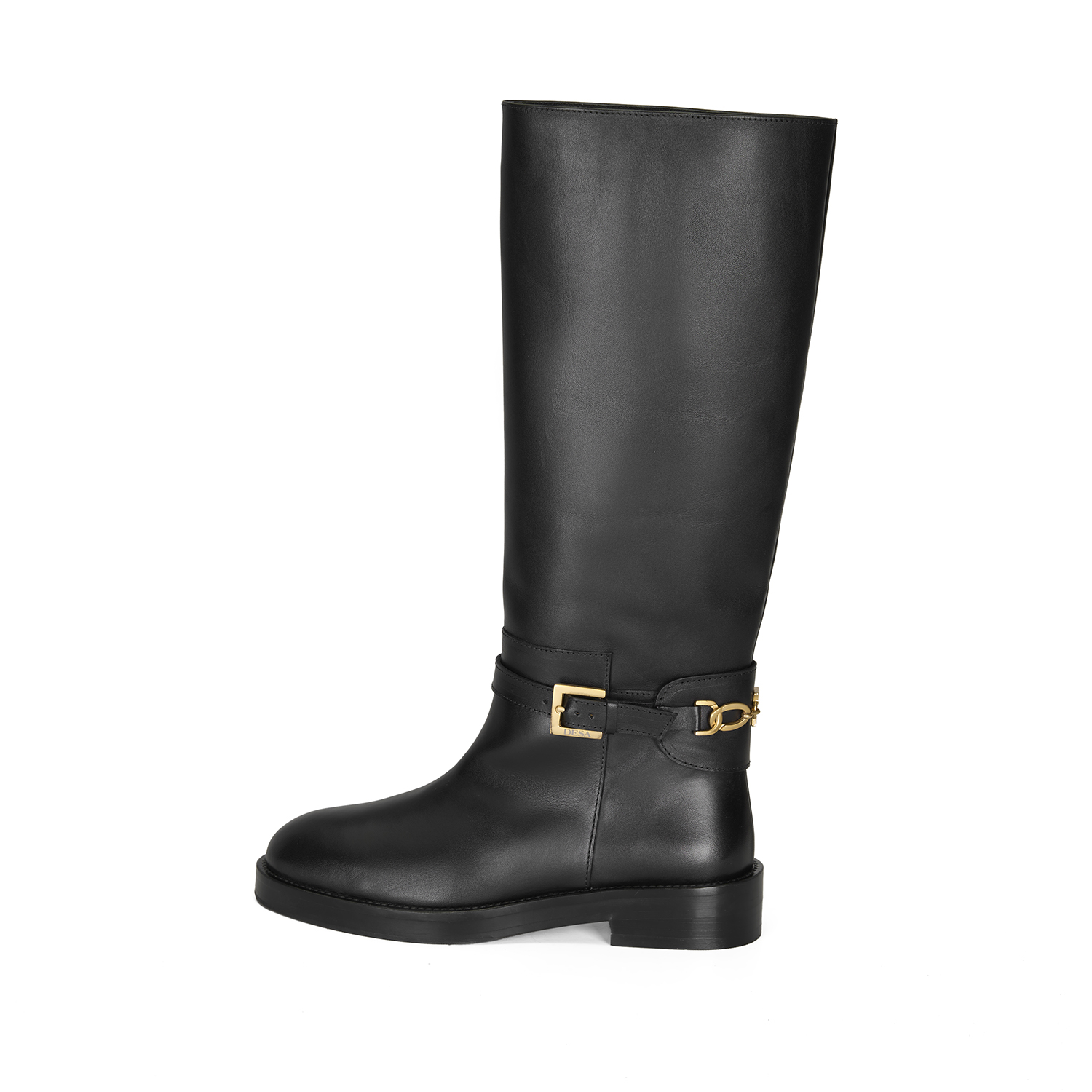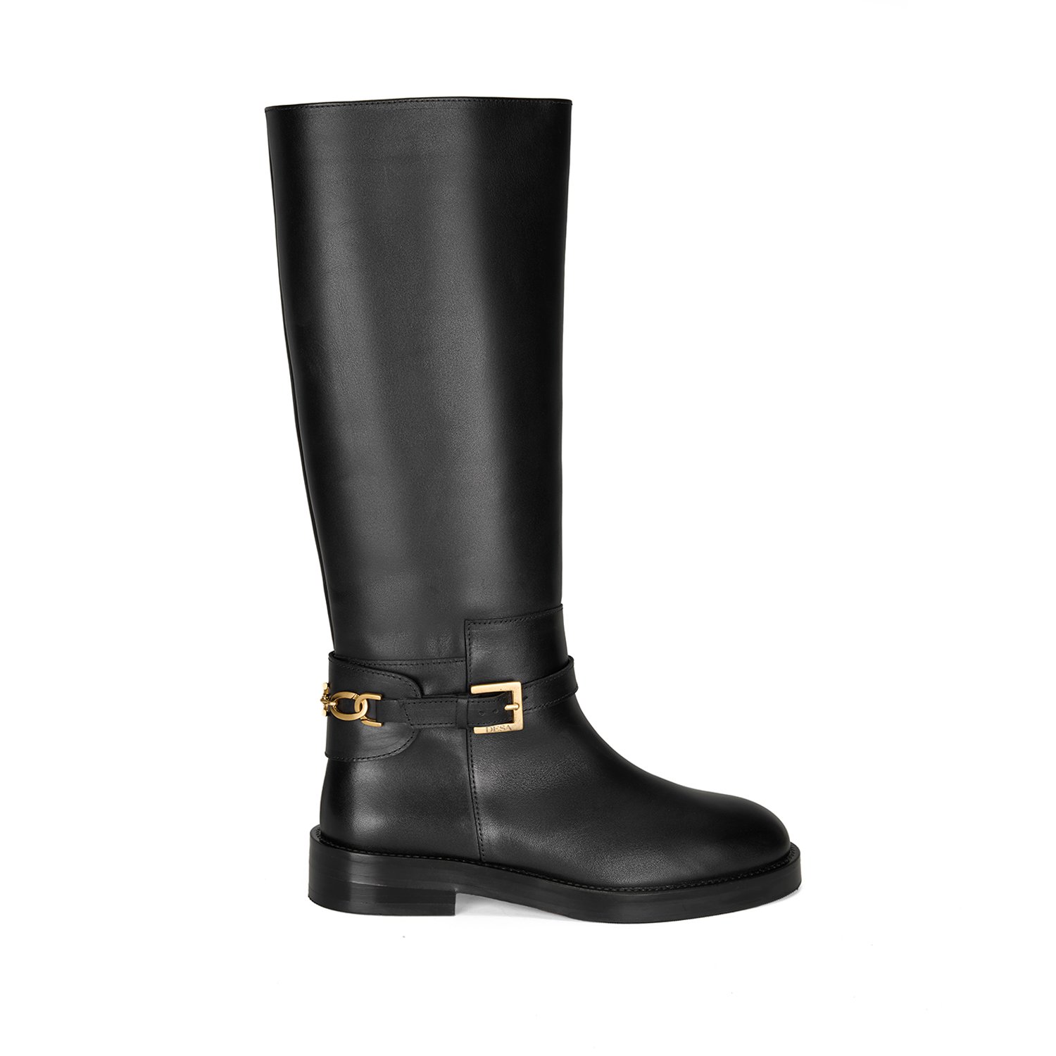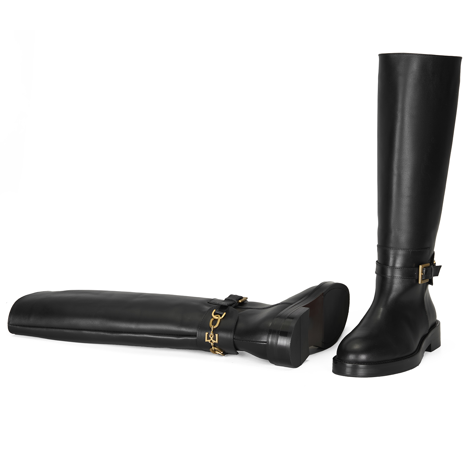 %100 deri, deri iç tabanlı, deri tekstil astarlı, neolit tabanlı, çıkarılabilir metal aksesuar detaylı kadın çizme.