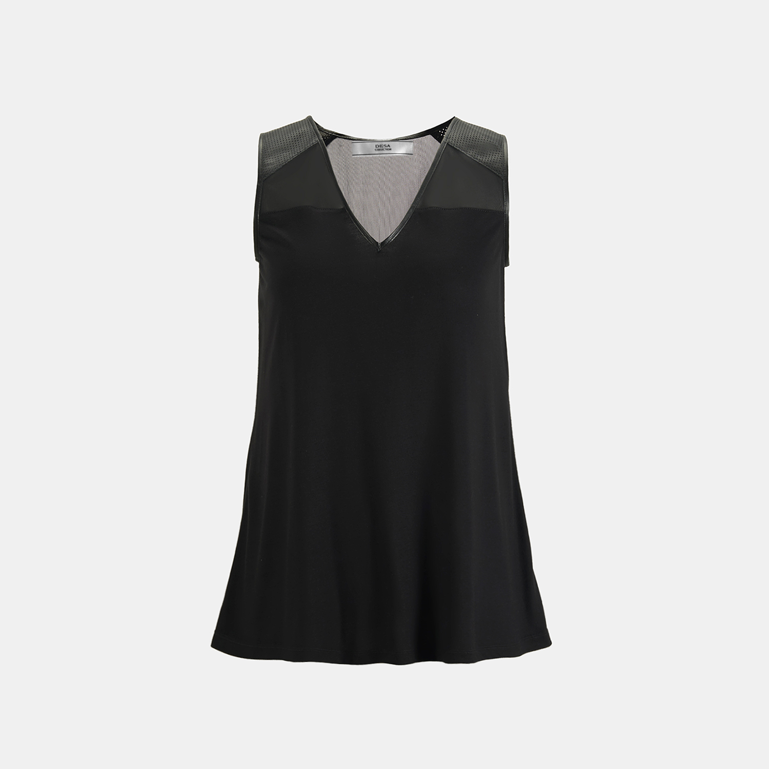 Kadın V yakalı tül ve perfore deri detaylı kadın kumaş bluz, kapamasızdır.