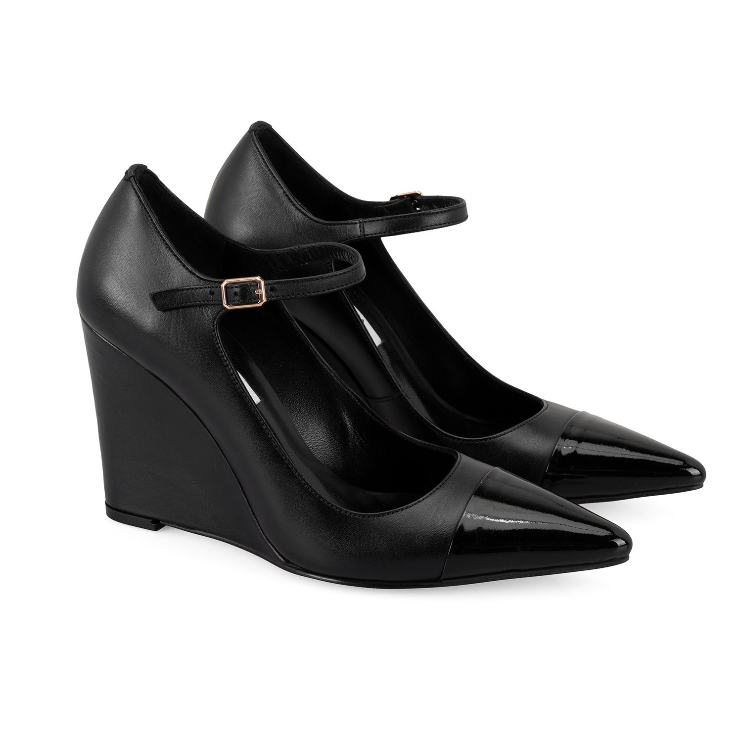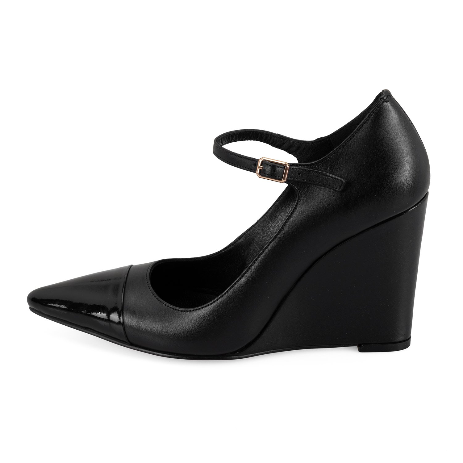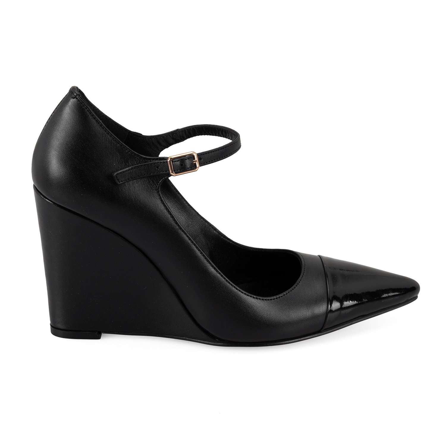 %80 deri %20 rugan, deri iç tabanlı, deri astarlı, ayarlanabilir metal tokalı, neolit tabanlı, dolgu topuklu kadın mary jane ayakkabı.