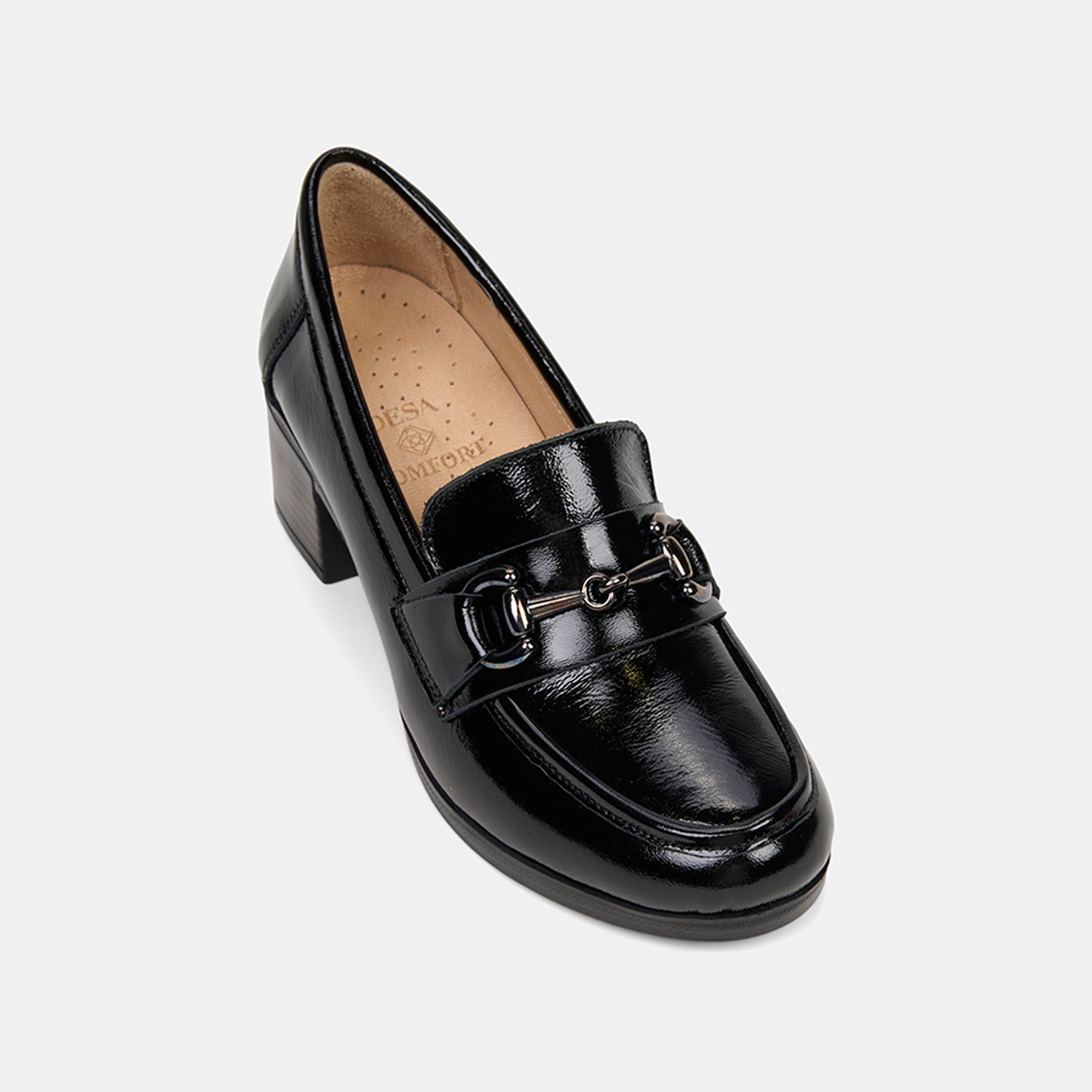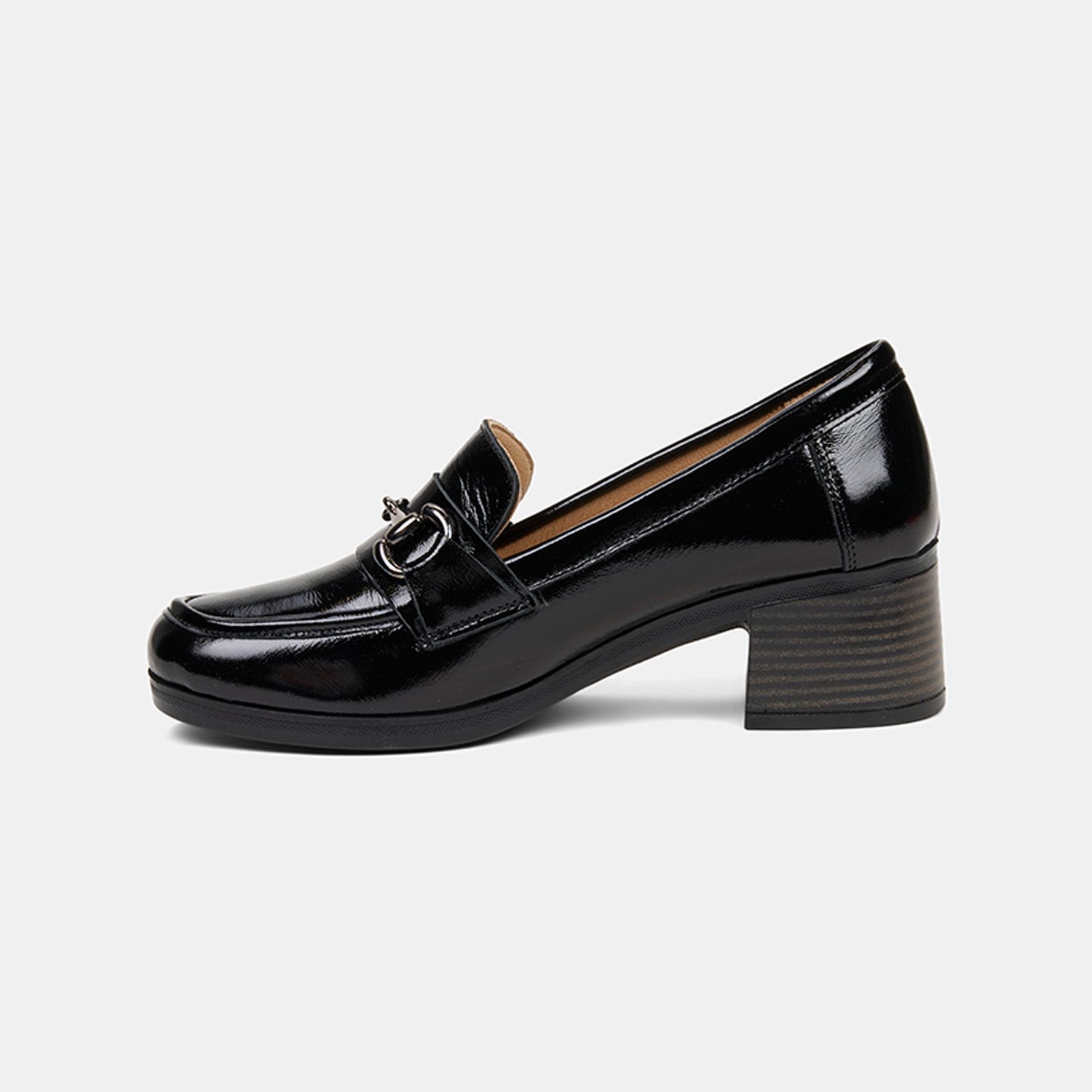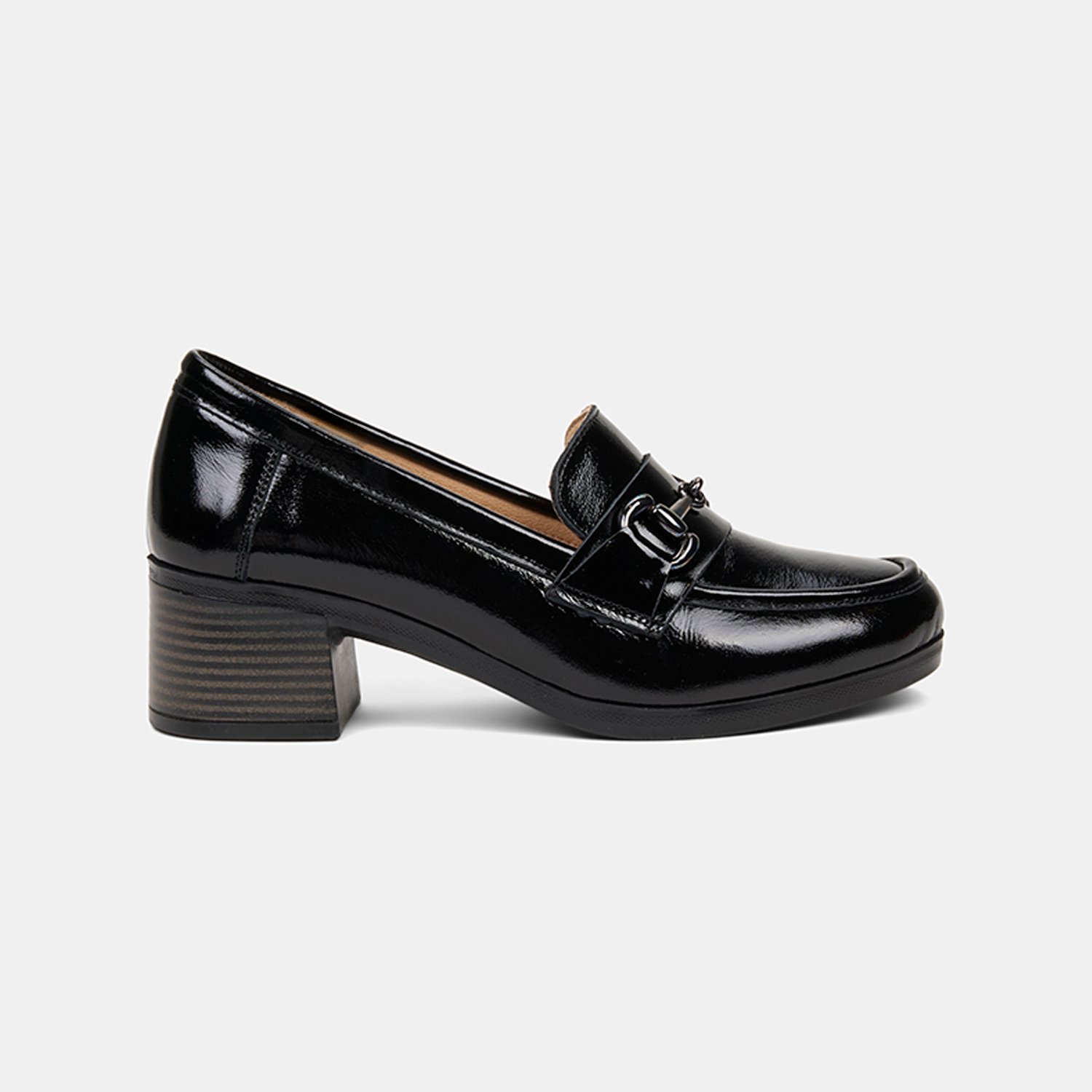 Parlak yüzeyi ve güçlü siluetiyle öne çıkan kadın comfort loafer, kalın topuk formuyla dengeli bir duruş sunar
