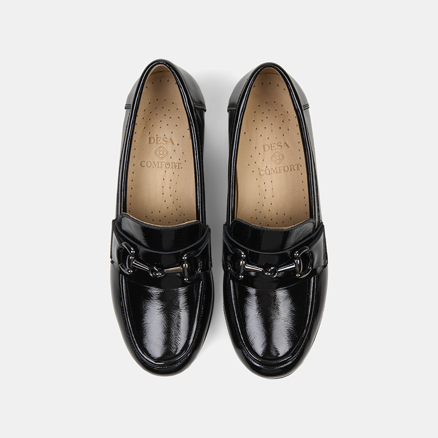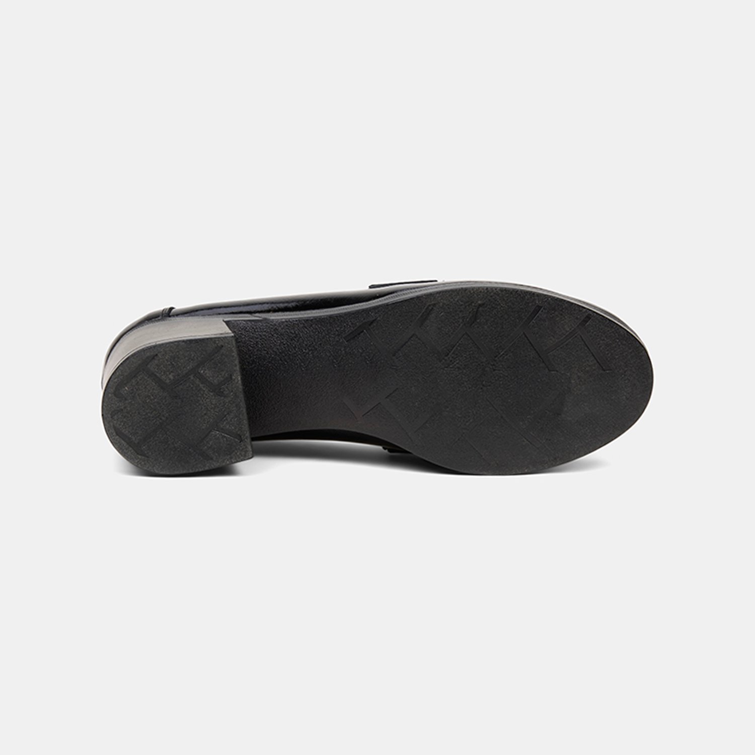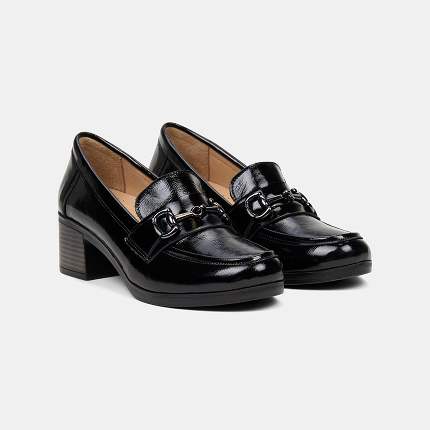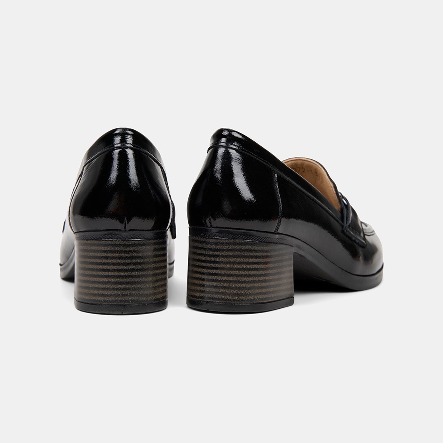 Parlak yüzeyi ve güçlü siluetiyle öne çıkan kadın comfort loafer, kalın topuk formuyla dengeli bir duruş sunar