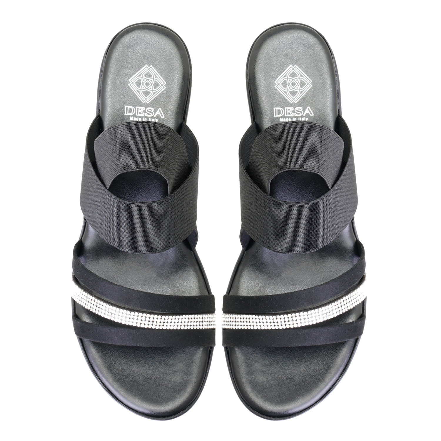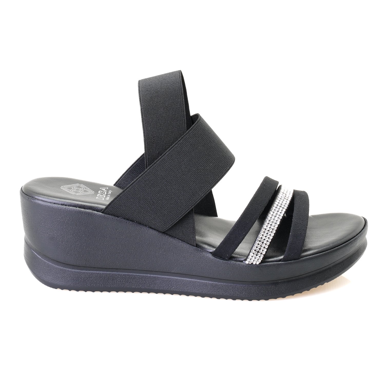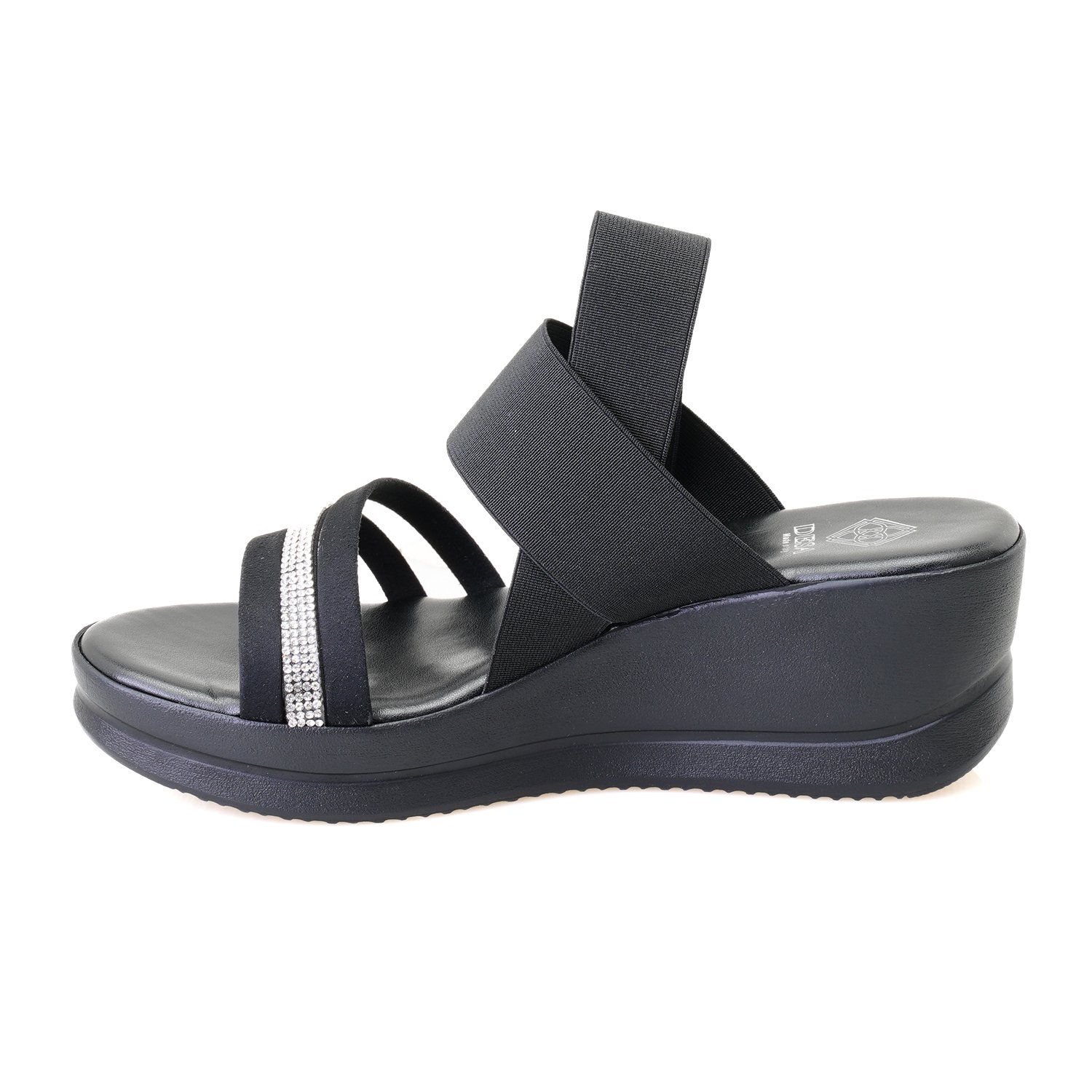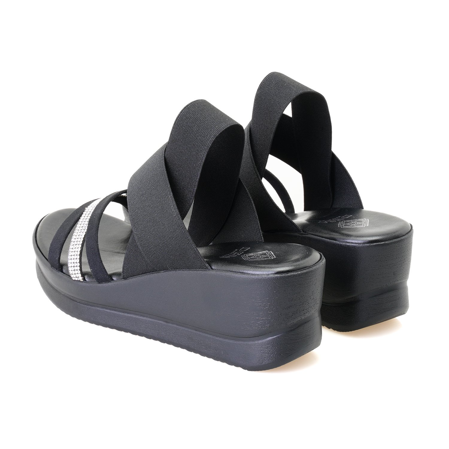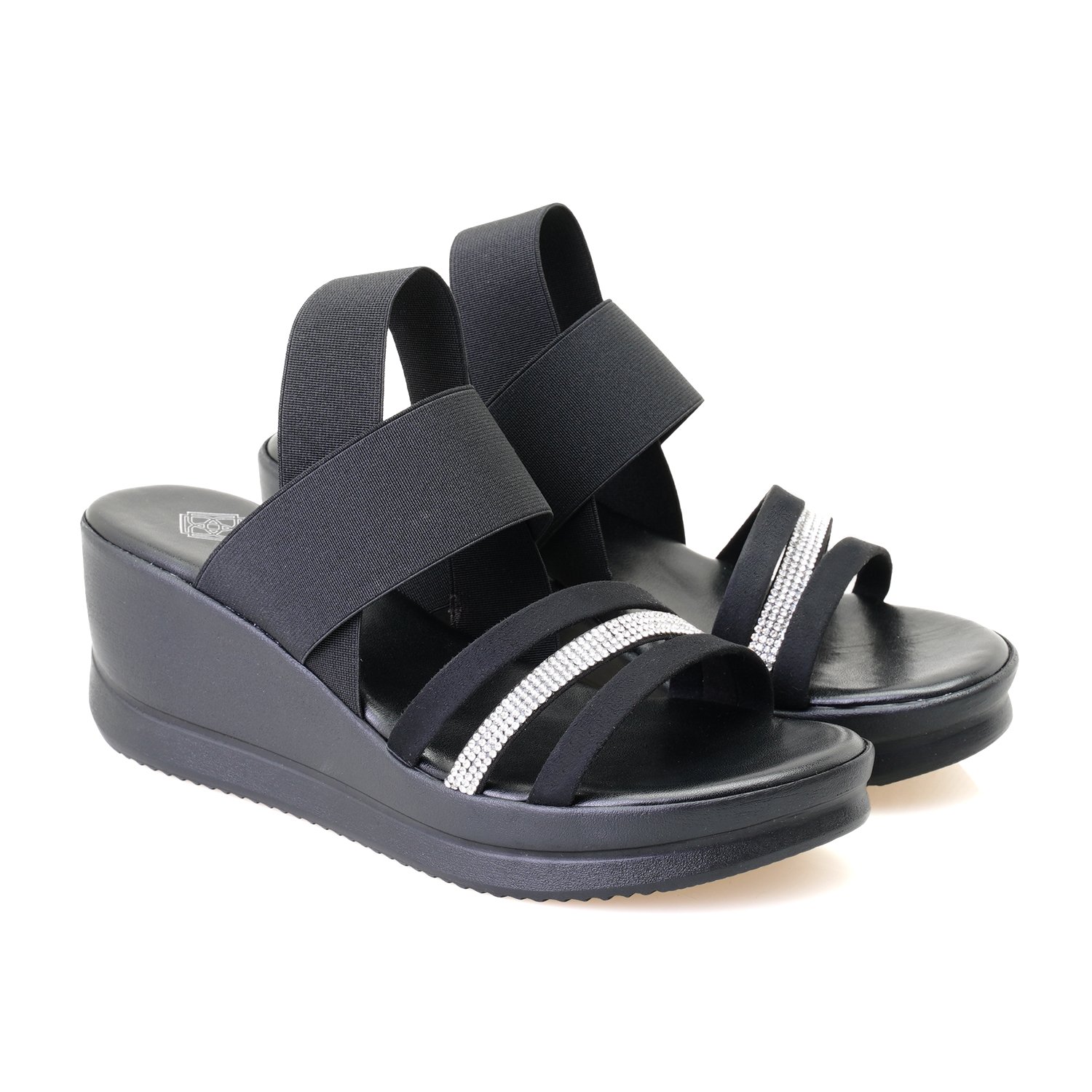 Pu iç astarlı, pu iç tabanlı, lastik detaylı, parlak taş aksesuarlı, pu tabanlı, kadın dolgu topuk sandalet.