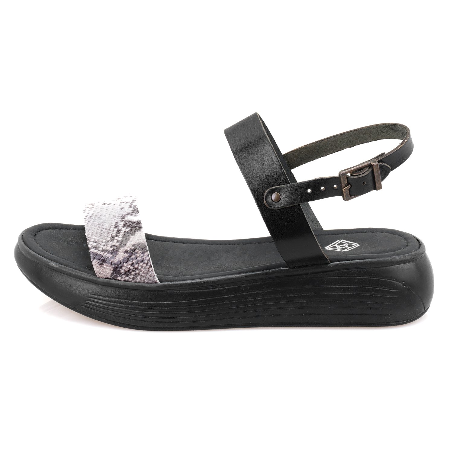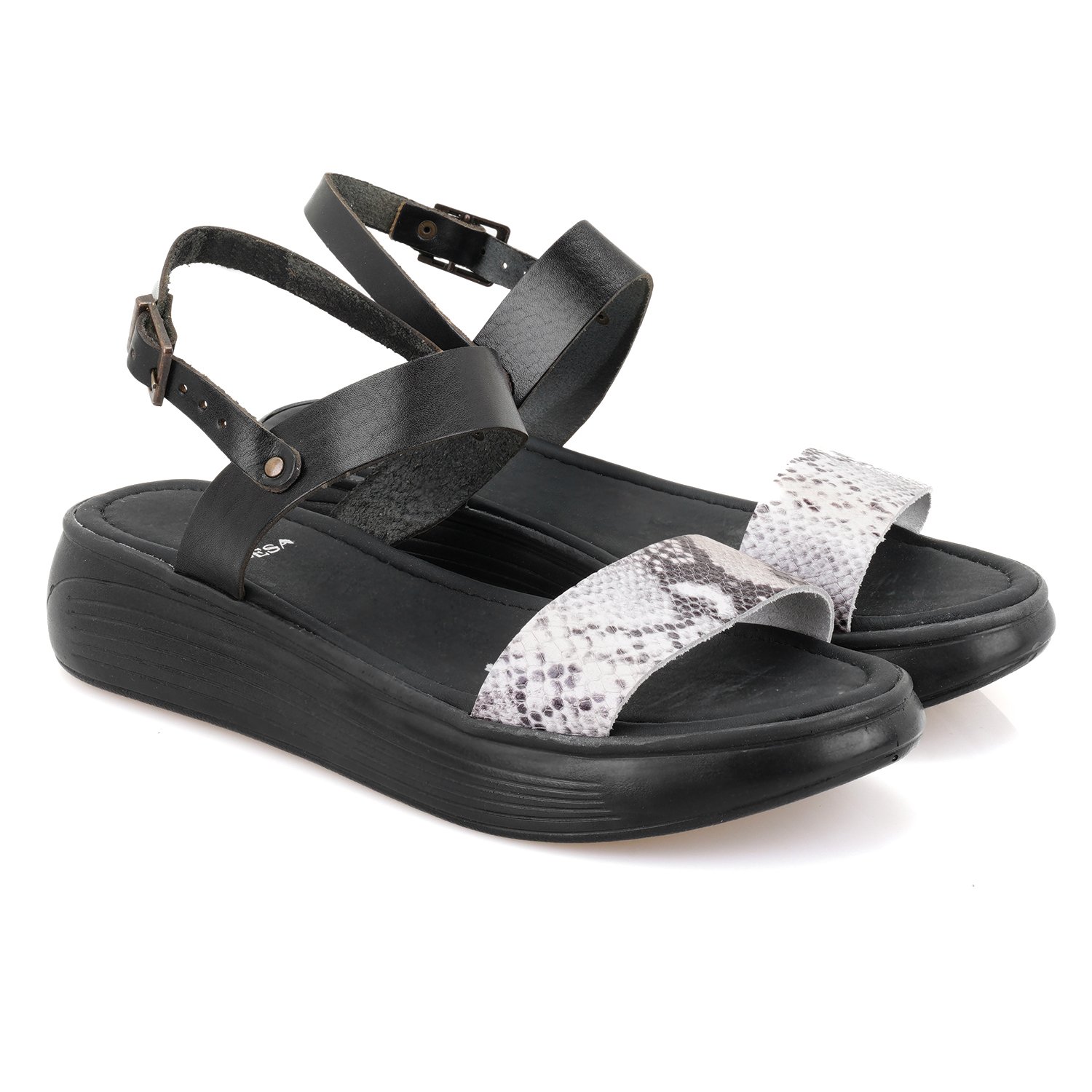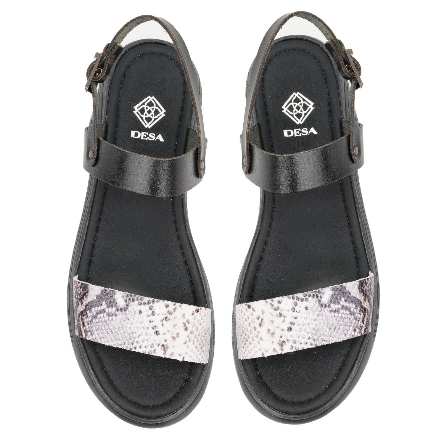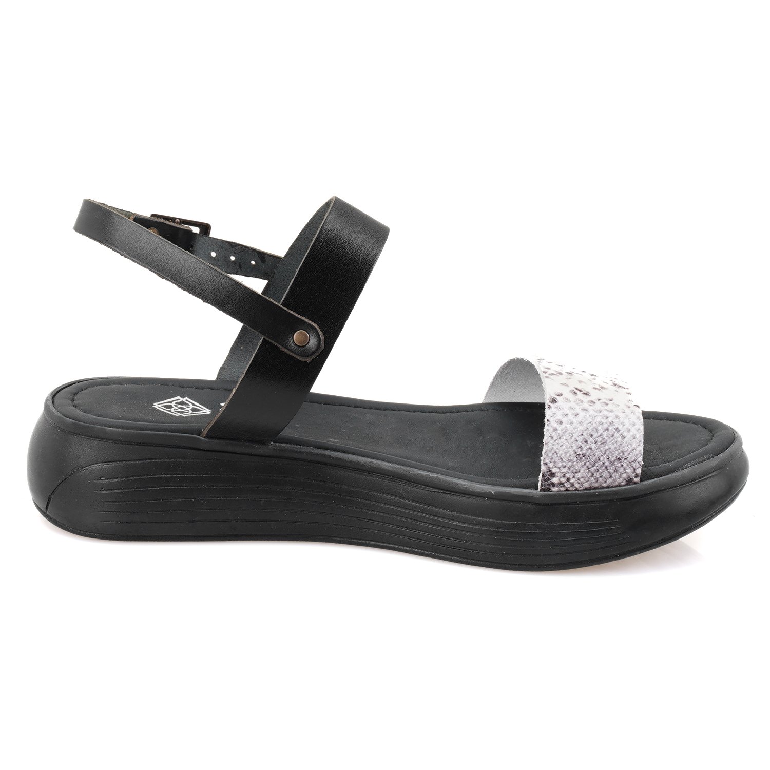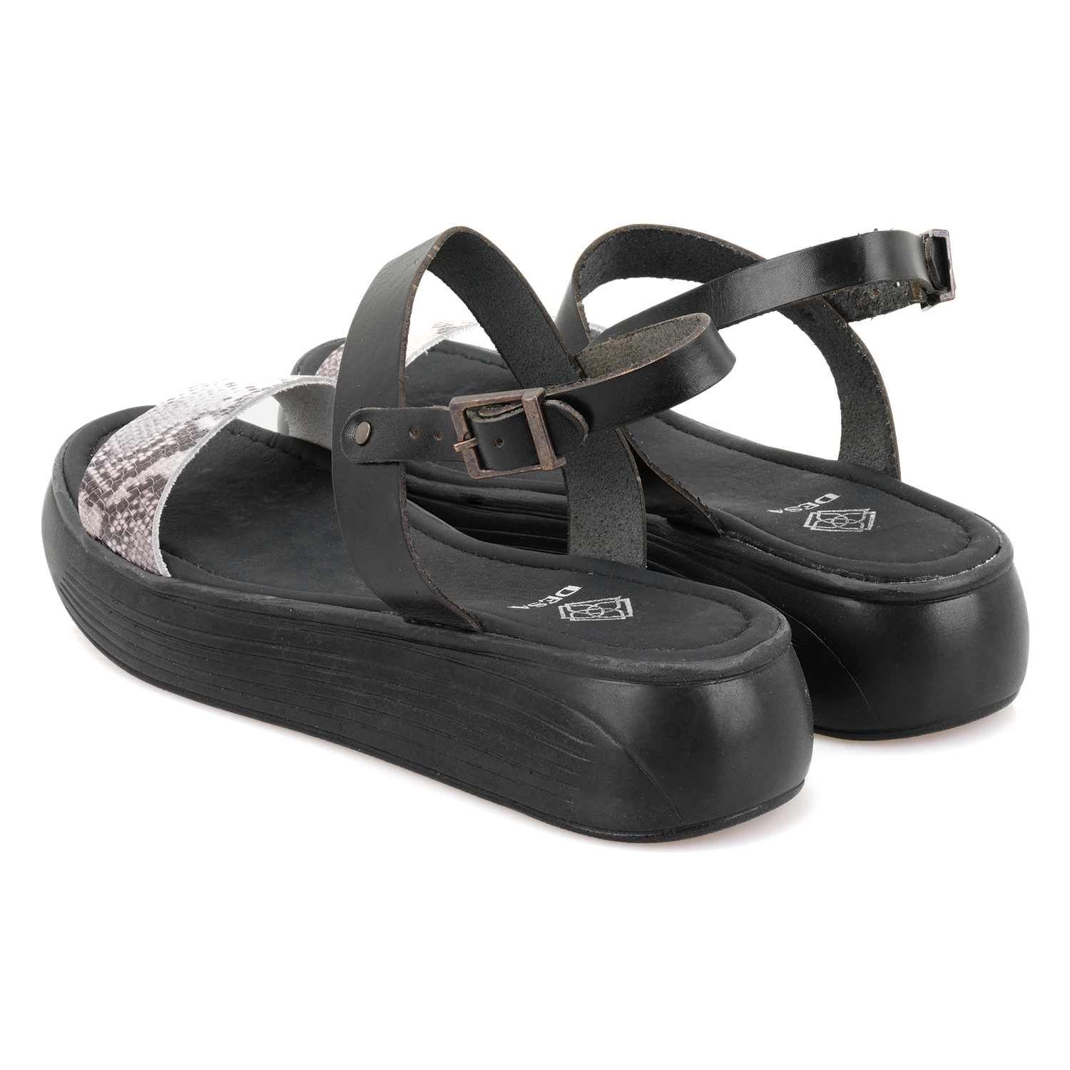 Vaketa deri&yılan baskılı deri, ayarlanabilir metal aksesuarlı, esnek ve hafif poliüretan tabanlı kadın sandalet.