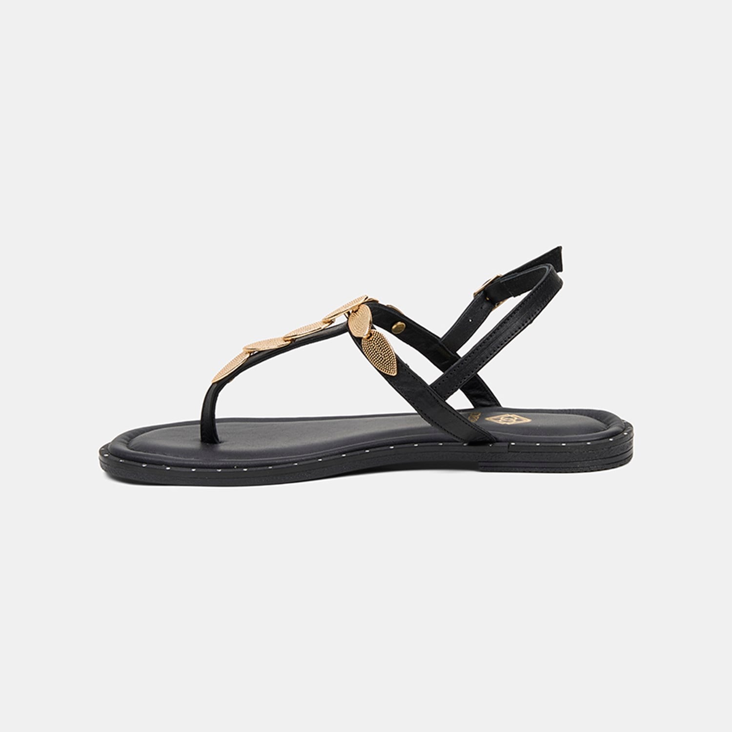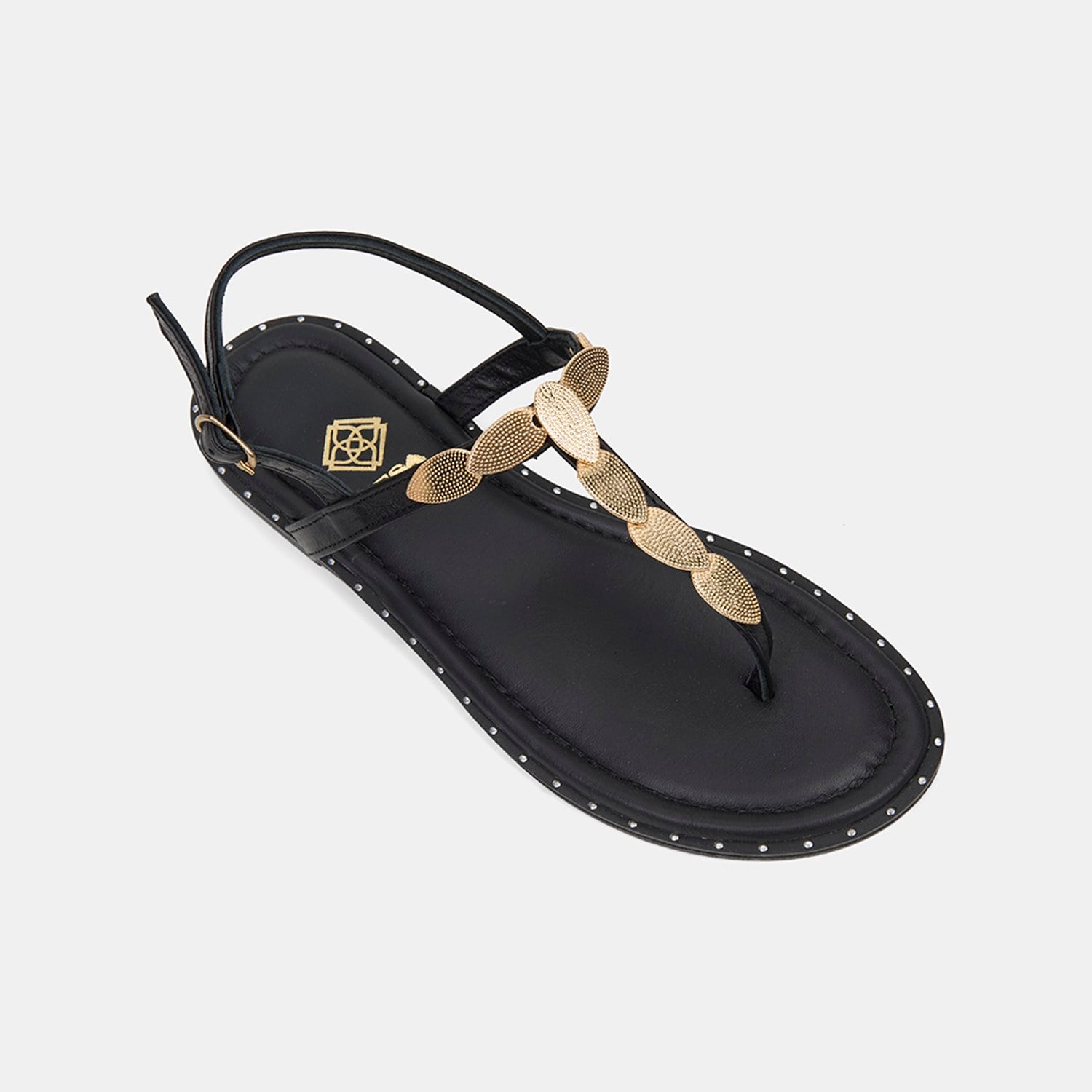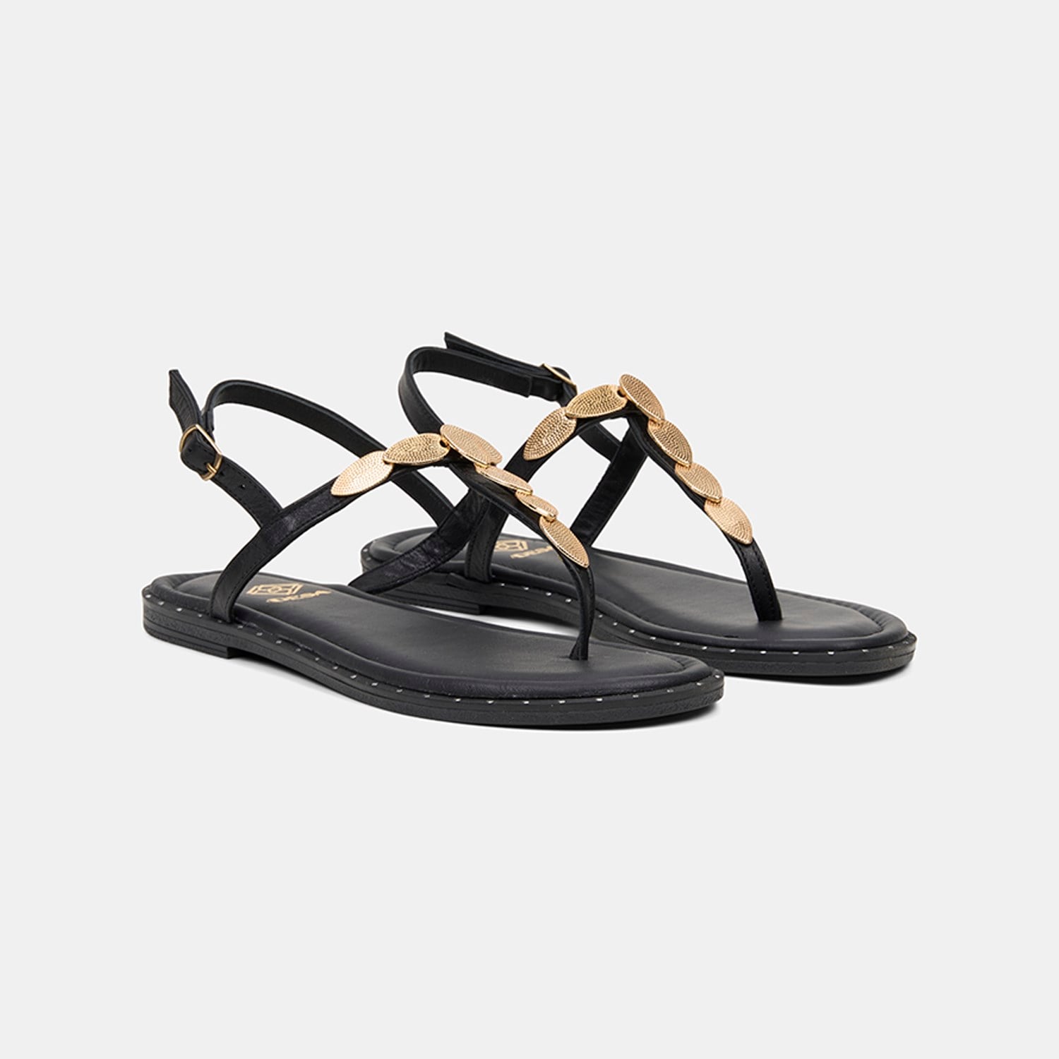 Kadın Siyah Gold Toka Aksesuarlı Parmak Arası Deri Sandalet