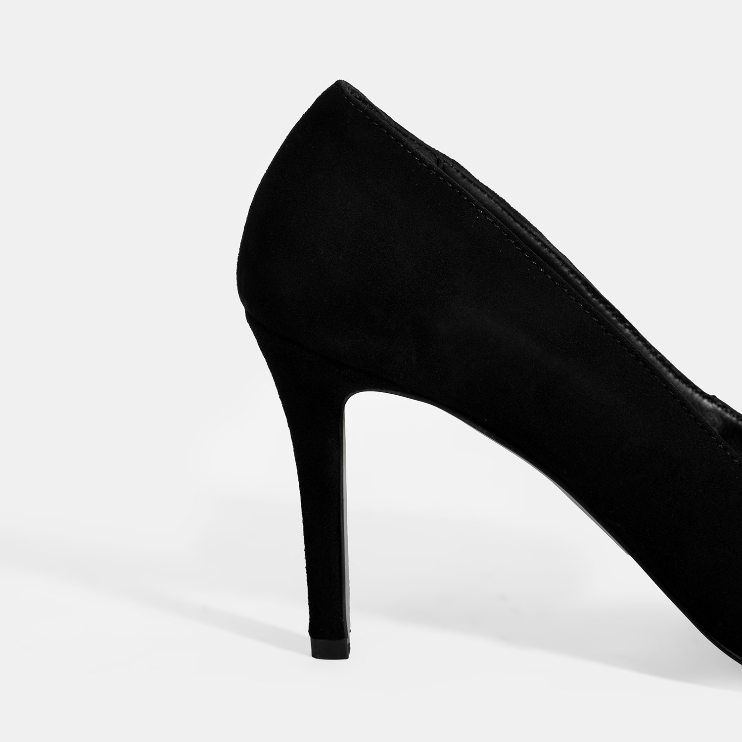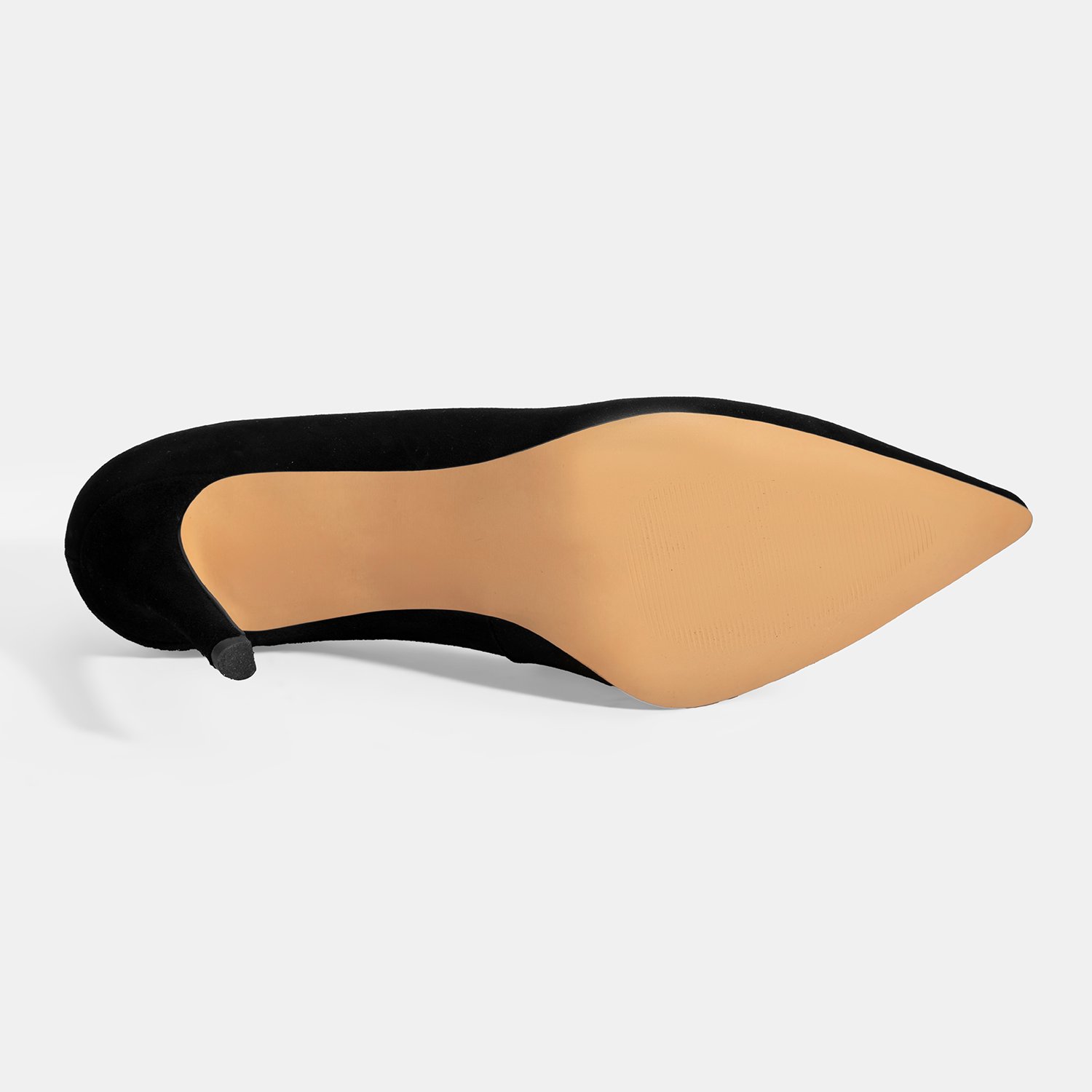 %100 süet deri, deri iç tabanlı, deri astarlı, metal aksesuar detaylı, neolit tabanlıi sivri burun kadın stiletto. Topuk yüksekliği 8,5 cm
