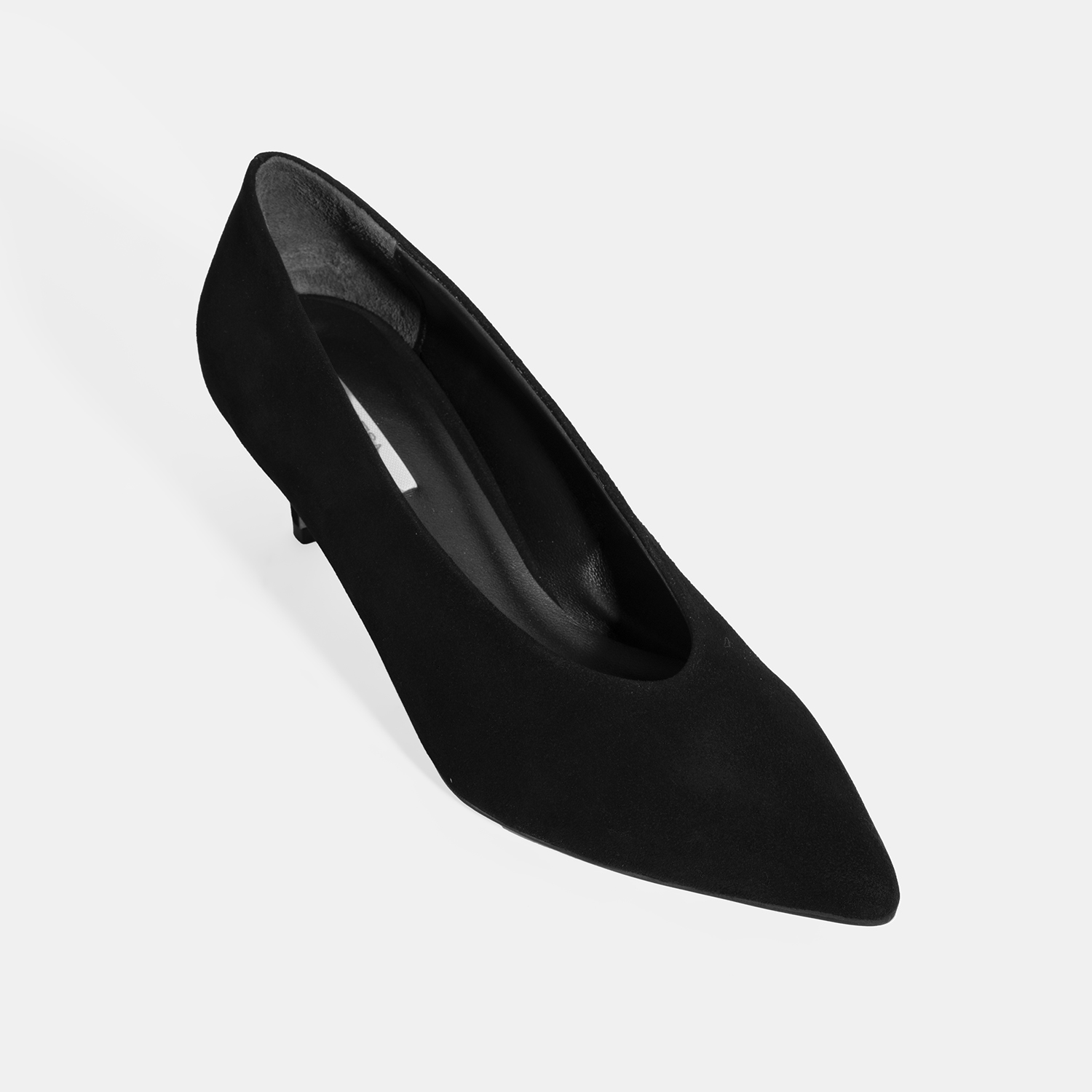 %100 süet deri, deri iç tabanlı,deri astarlı, sivri burunlu, neolit tabanlı, kadın ince topuklu ayakkabı. Topuk yüksekliği 6 cm